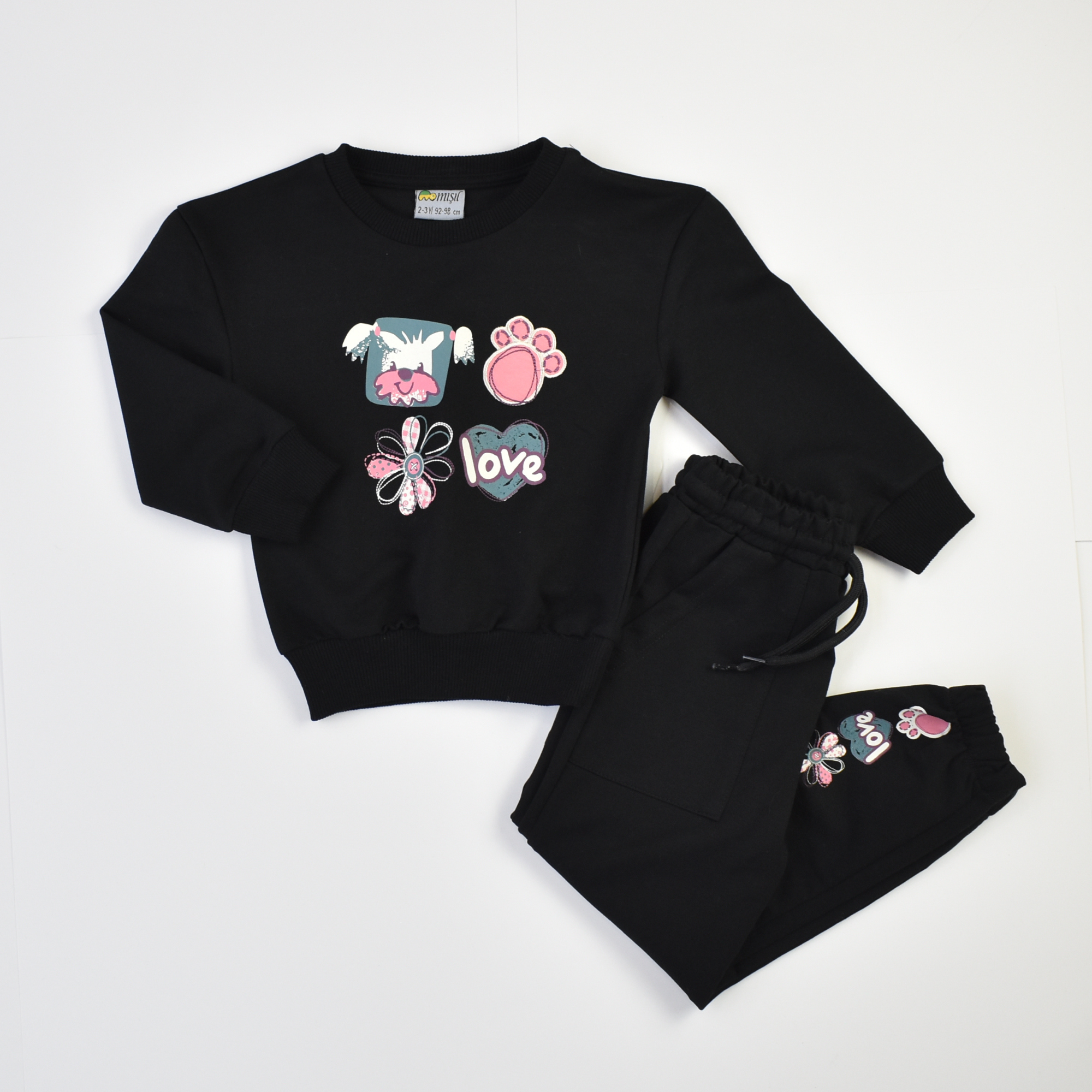 • Kids’ red tracksuit set with zip-up jacket, matching jogger pants, and white T-shirt featuring astronaut and cartoon cat space graphic.