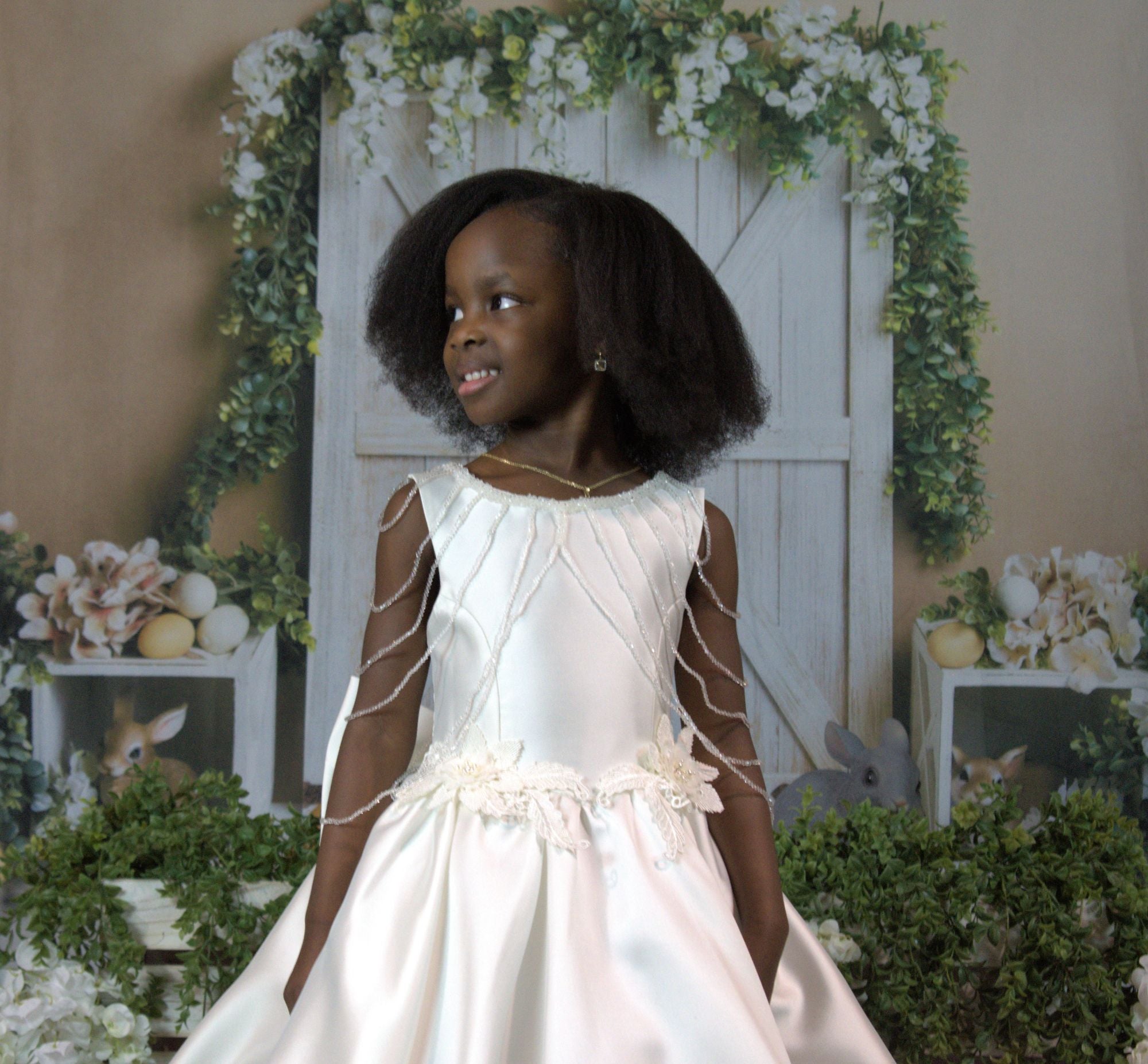 Start with current measurements and compare them to the size chart on each product page. For tea-length or ankle-grazing hems, factor in shoe heel height and preferred coverage during photos. If your child is between sizes, consider sizing up for growth and easy hem adjustments. Babies and toddlers benefit from elastic waists and soft linings for comfort through the ceremony and reception. Need advice? Bring measurements to our Montreal or Laval store for personalized guidance, or contact us before ordering for help with length and fit.