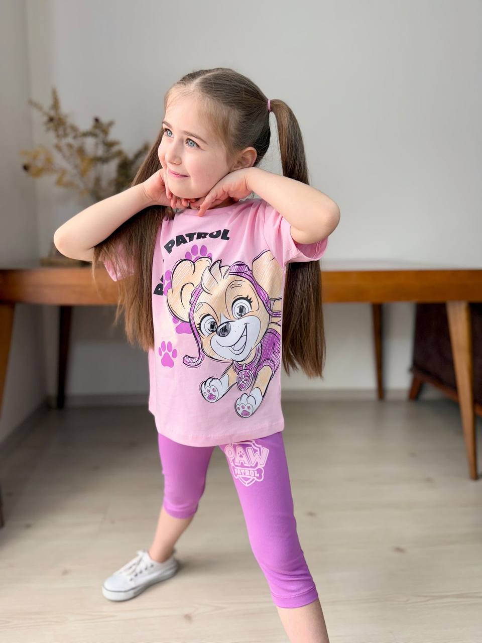• Smiling girl in a navy blue Mickey Mouse T-shirt with a floral graphic, paired with purple capri leggings featuring a matching Mickey print.