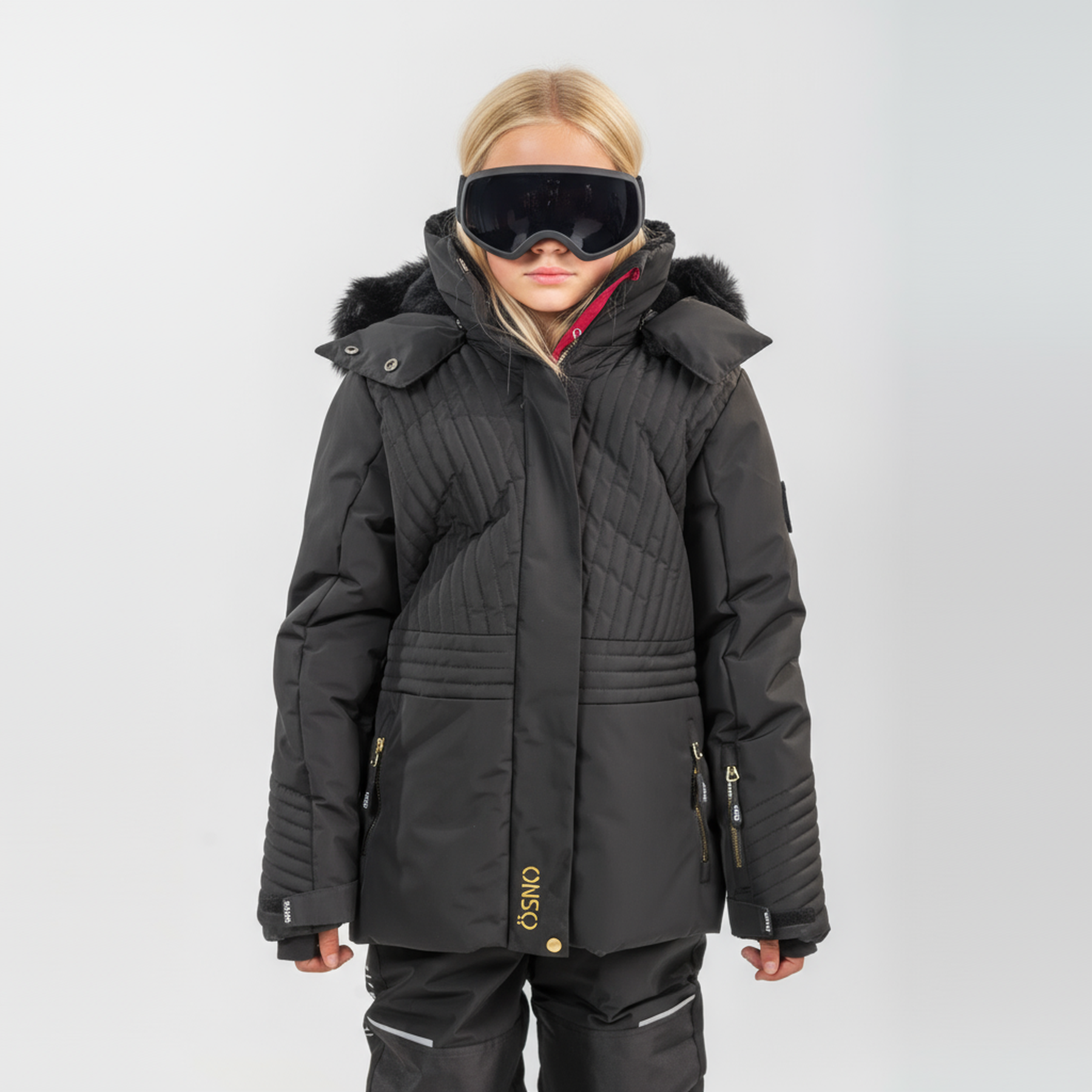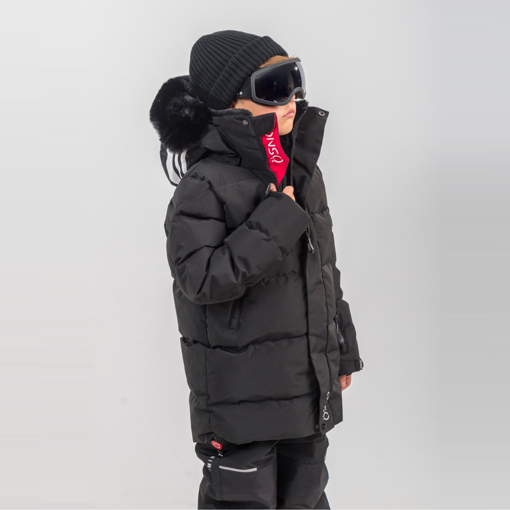 • Child wearing a black winter coat with fur hood and goggles on a white background