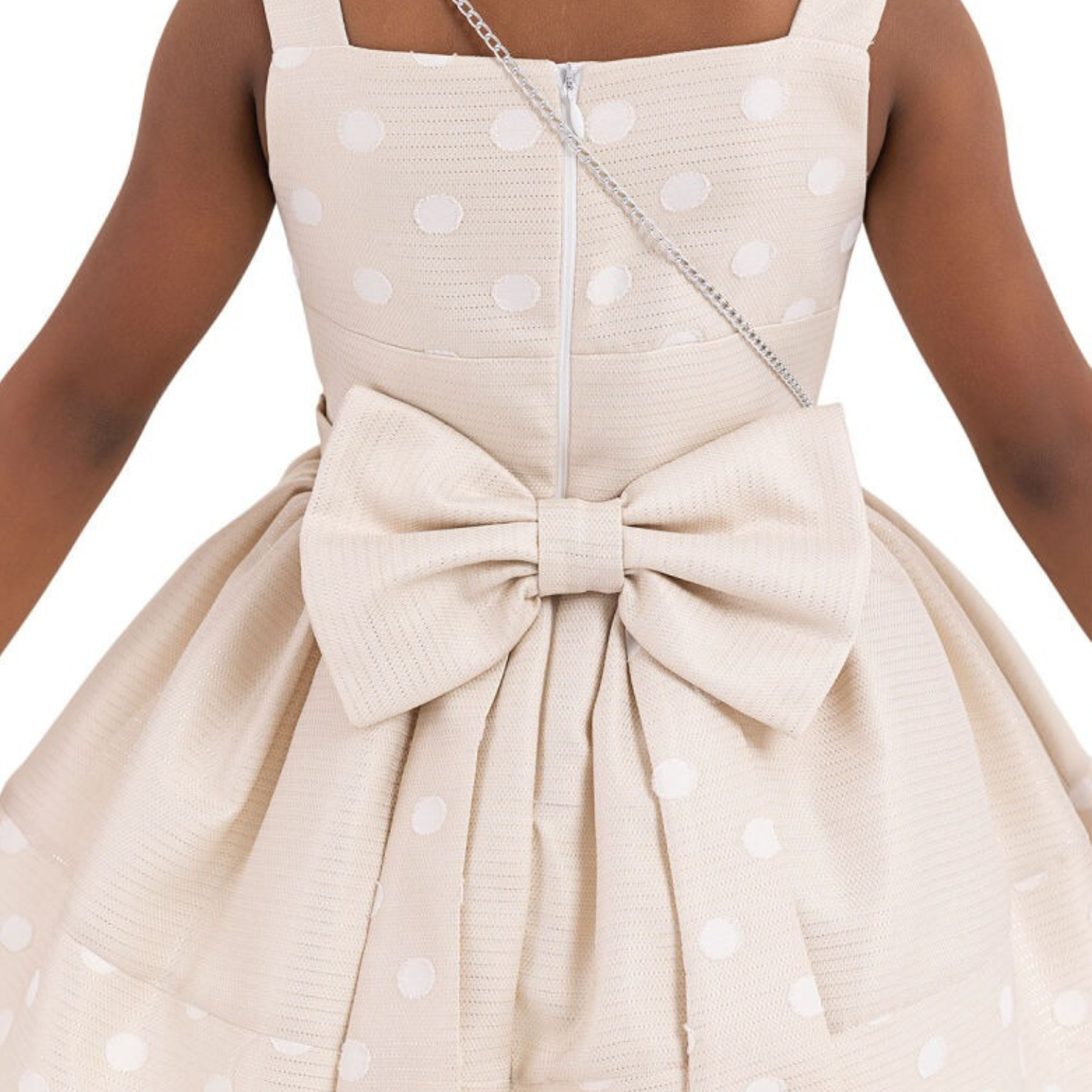 Faites briller votre petite avec cette magnifique robe à bretelles, alliant confort et élégance. Son tissu jacquard à pois et rayures, rehaussé de jolis nœuds ornés de perles et de strass, crée un look à la fois ludique et raffiné.