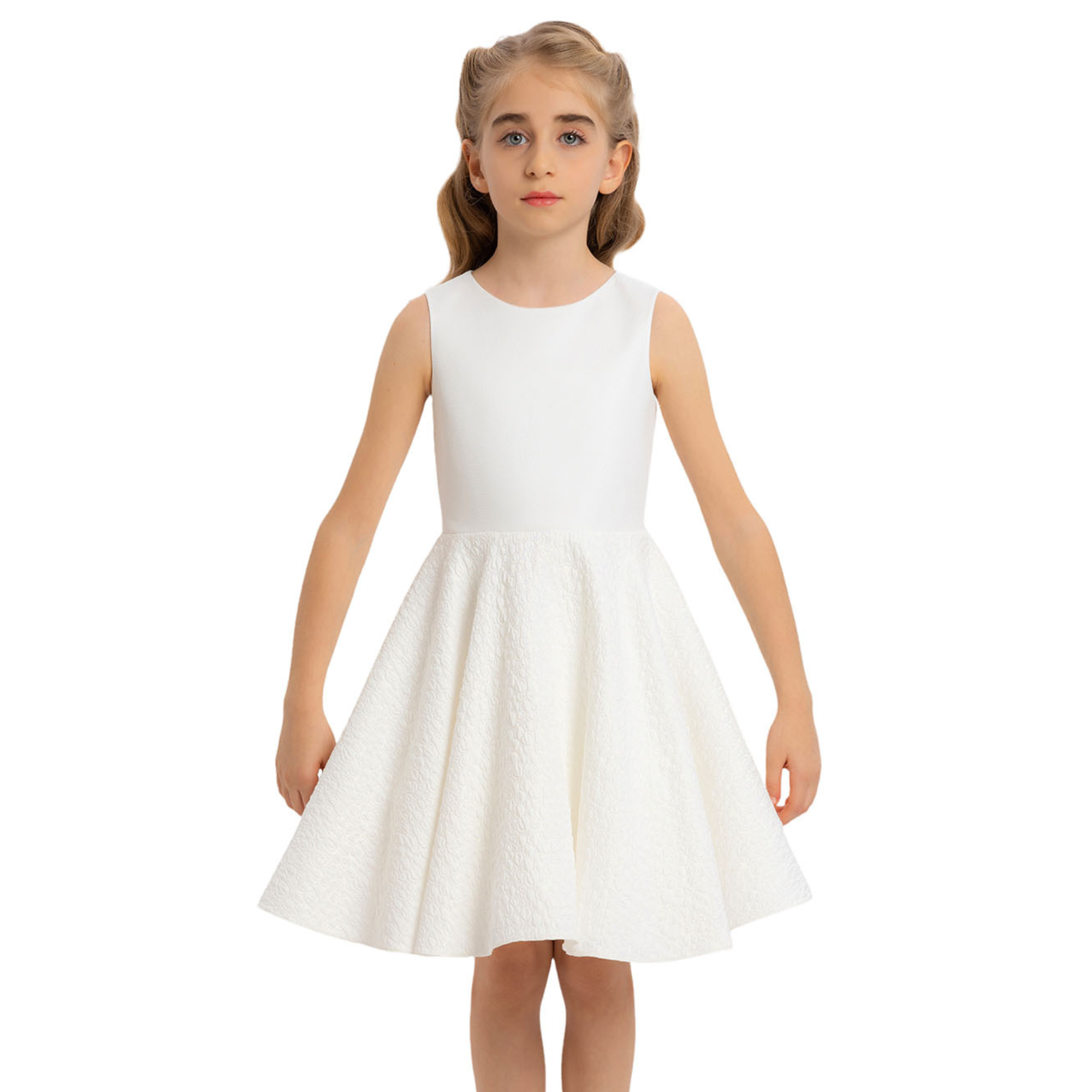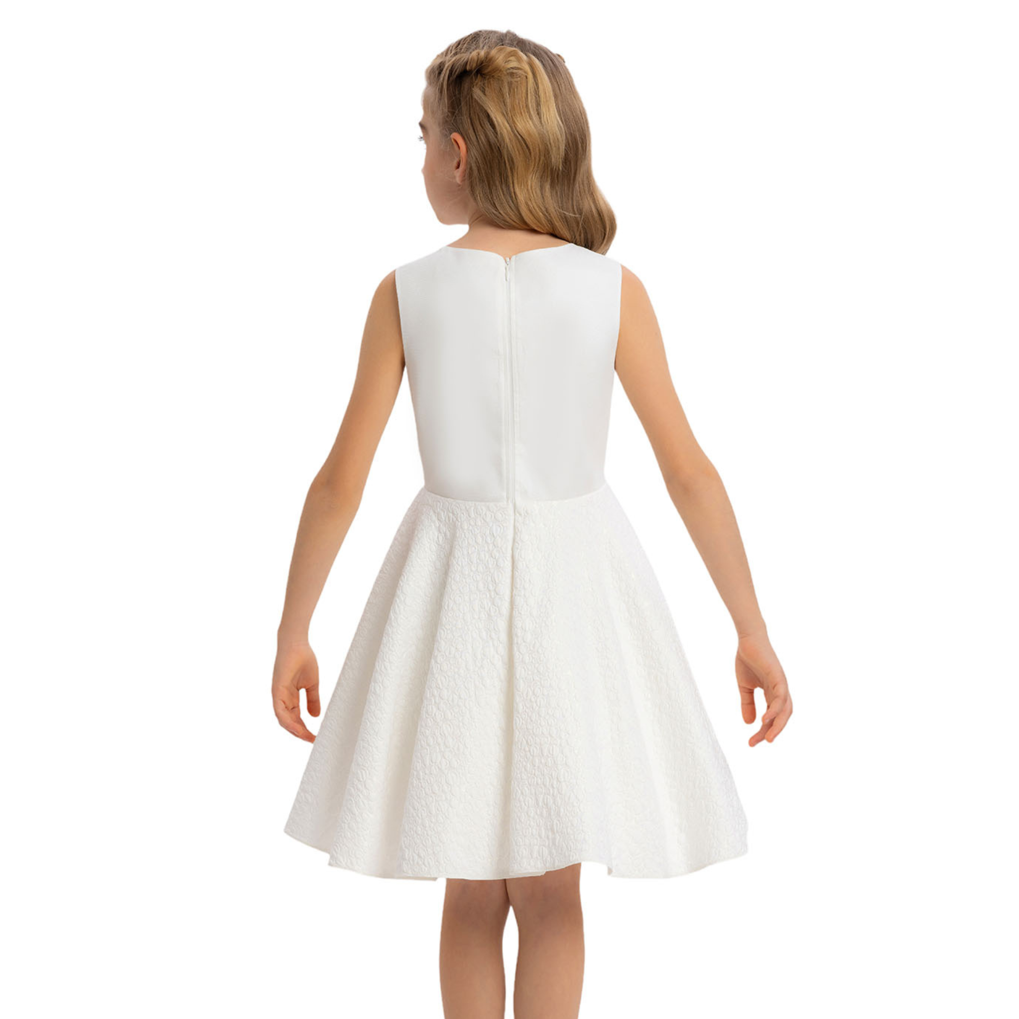 La robe sans manches, confectionnée en jacquard de haute qualité, se distingue par ses détails de jupe à volants et ses rubans en tissu uni, créant un look raffiné et délicat. Conçue avec une doublure 100 % coton, elle garantit confort et respirabilité, idéale pour les célébrations estivales.