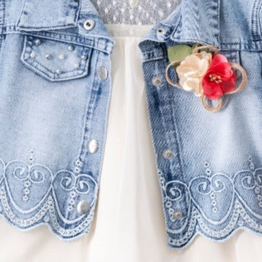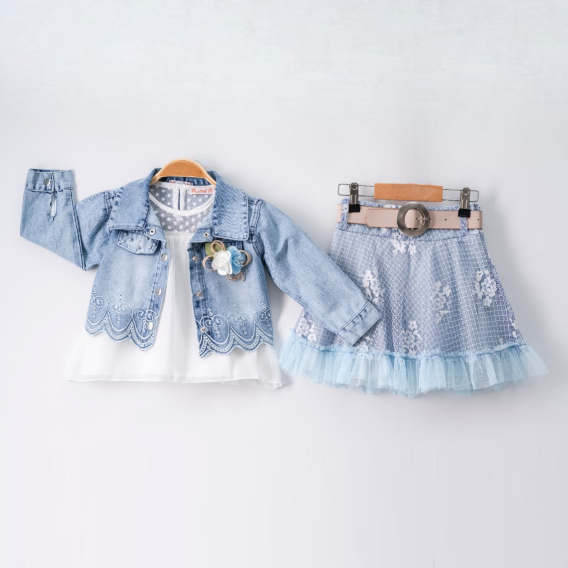 Un très joli style pour votre petite chérie avec un blazer en jean à manches longues (100% coton), un top habillé et une jupe en dentelle (50% coton / 50% polyester) avec ceinture assortie pour toutes les occasions.