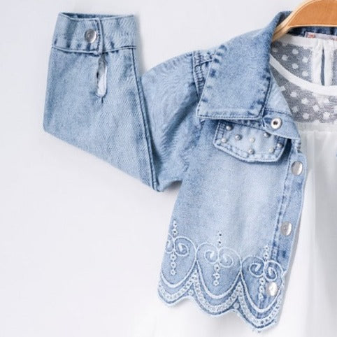 Un très joli style pour votre petit chéri avec un veston en jean à manches longues (100% coton), un haut habill�� et une jupe en dentelle (50% coton / 50% polyester) avec ceinture pour toutes les occasions.