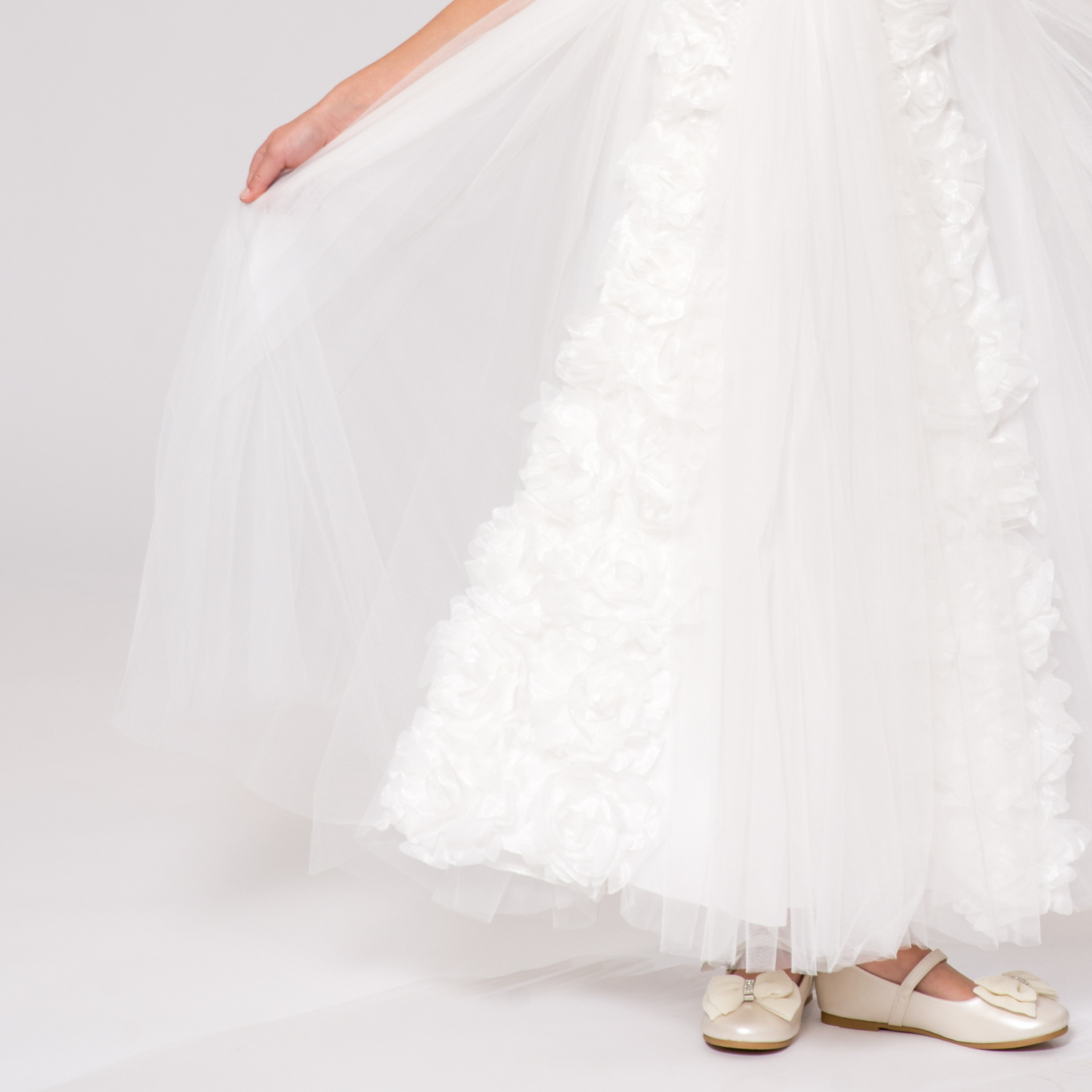 I bought this dress for my daughter’s communion, and she looked like a little princess. The vertical flowers and rhinestone detail are just perfect!