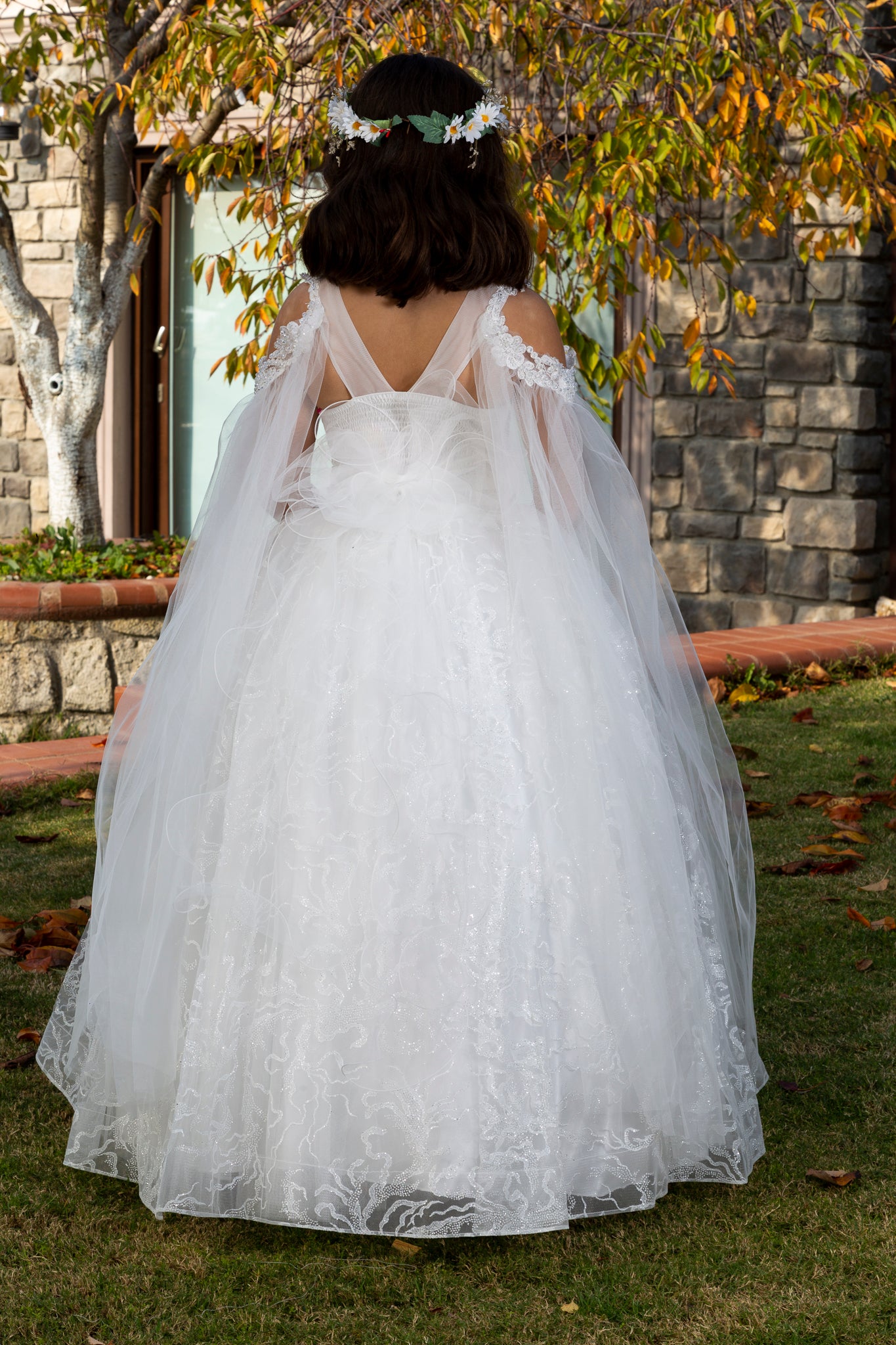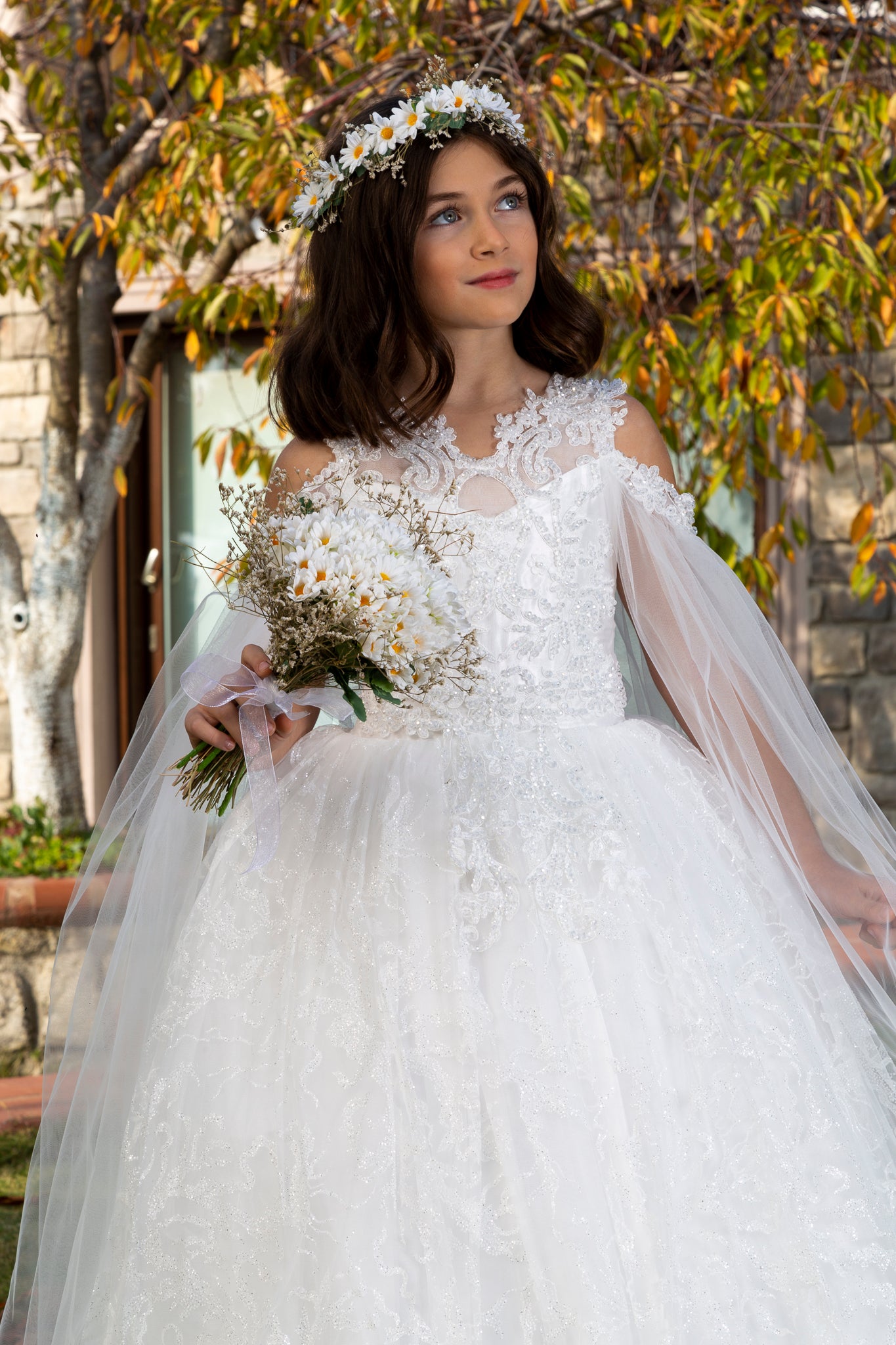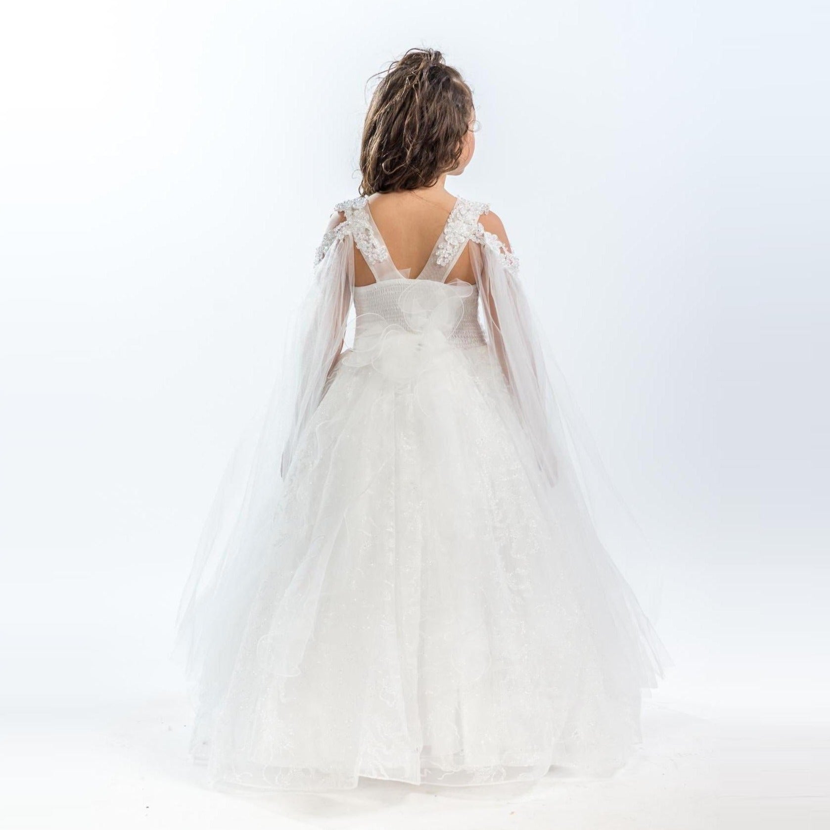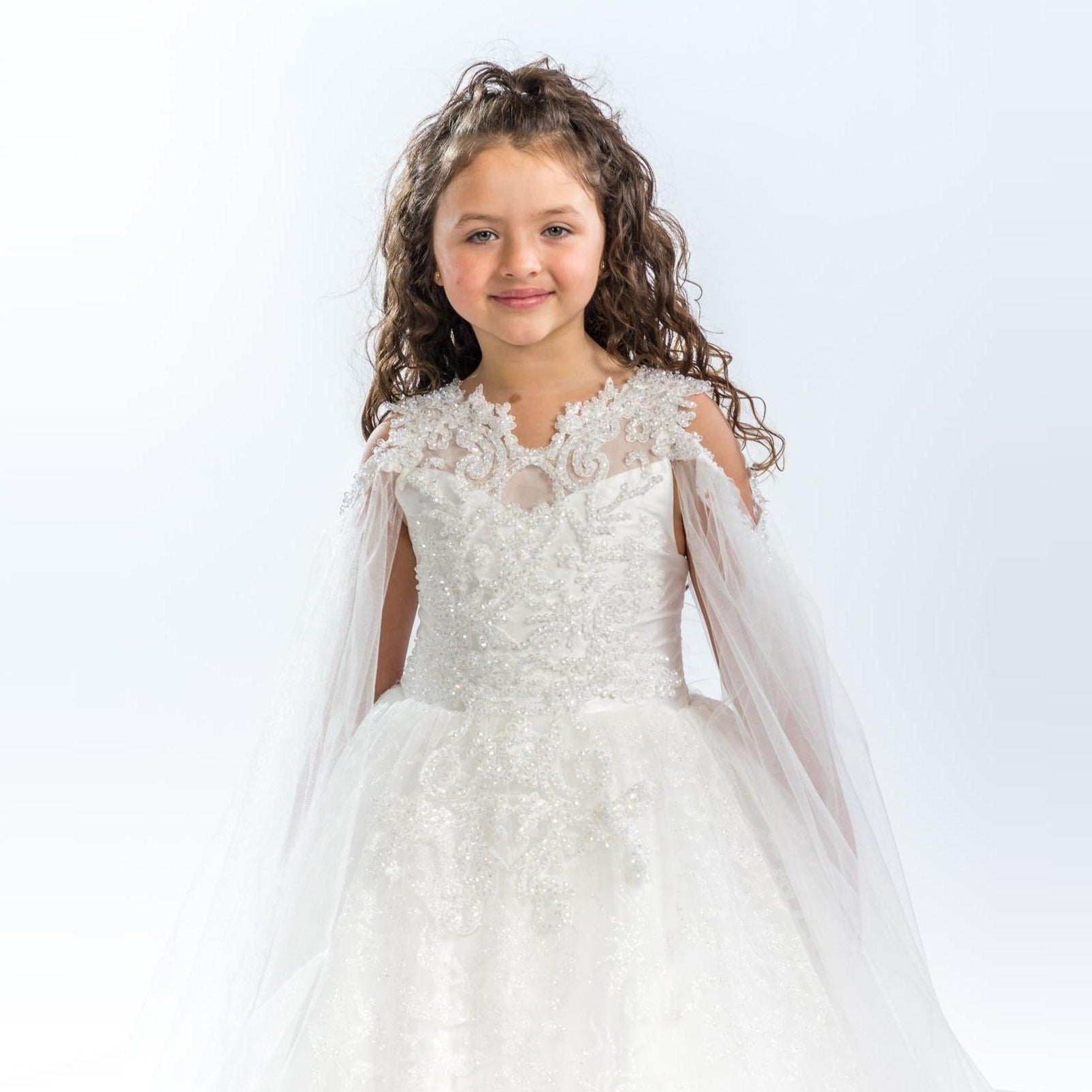 Une vraie robe de mariée...pour les enfants ! Robe en tulle élégante et très bouffante avec perles et perles de mariée et gros nœud assorti amovible dans le dos. Une création exclusive JuniorKids !