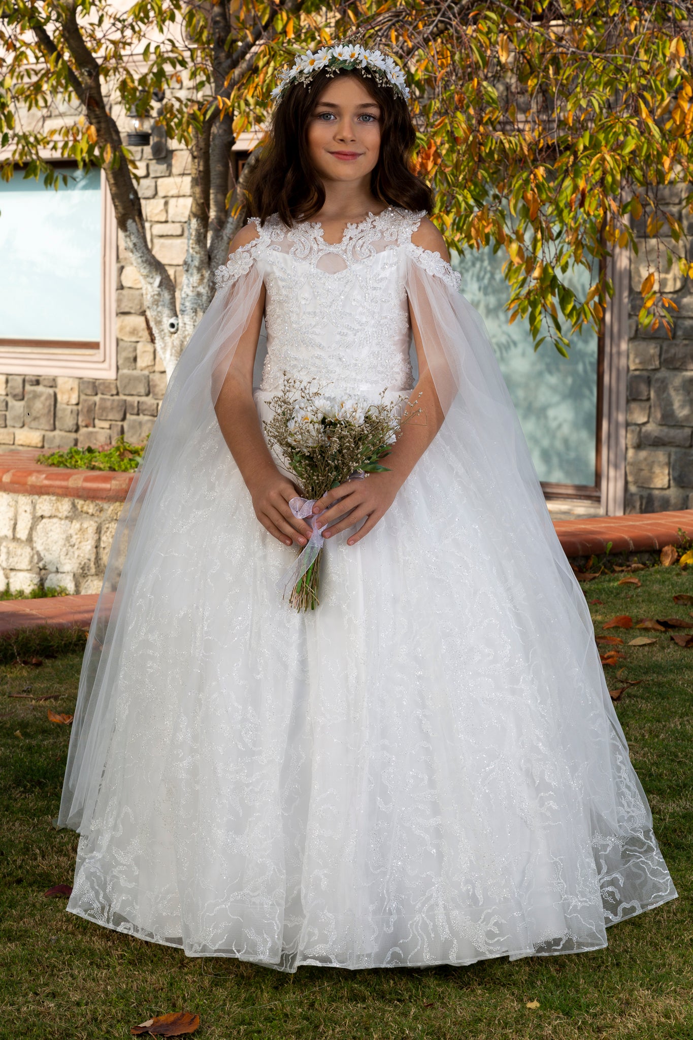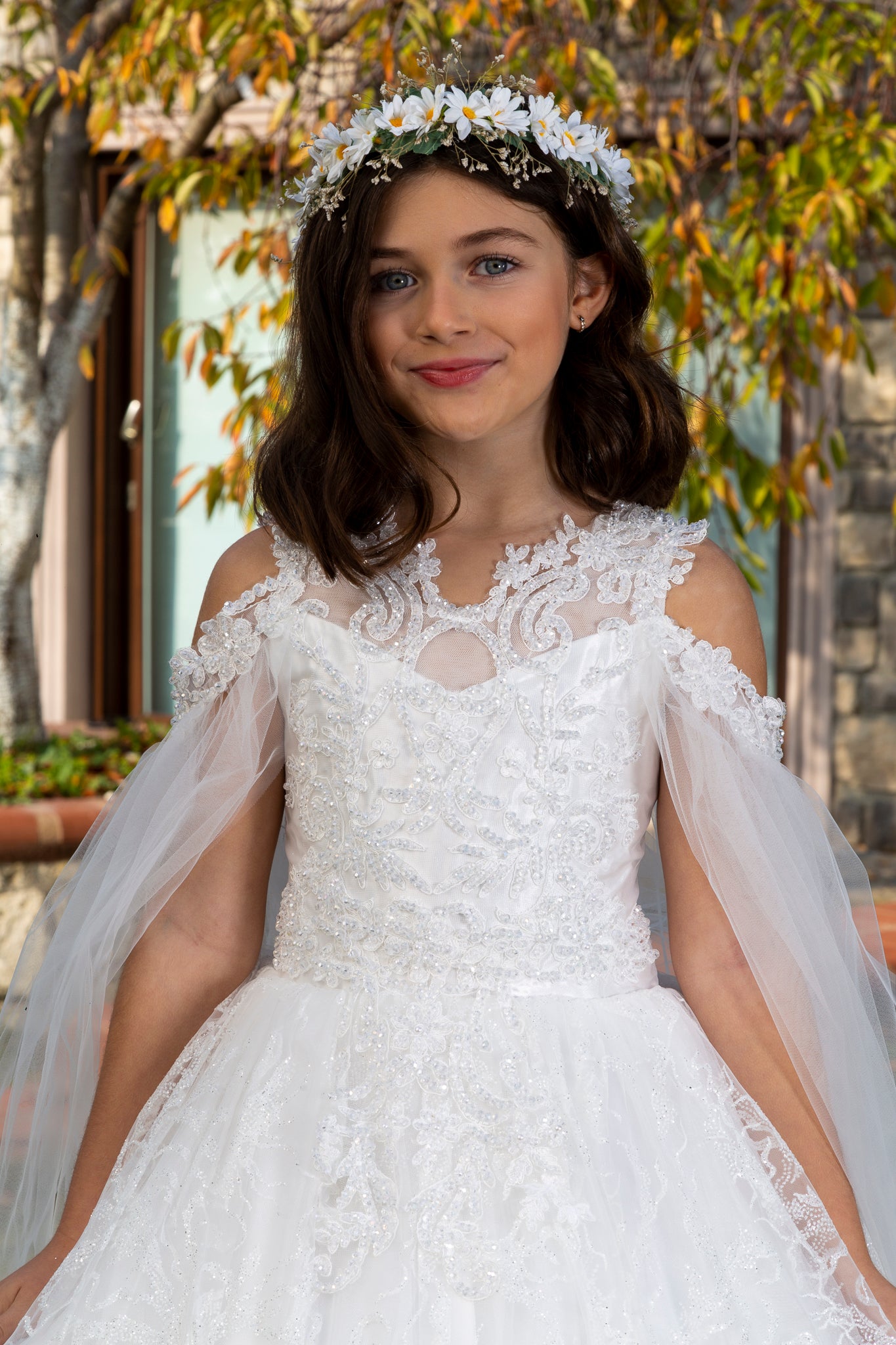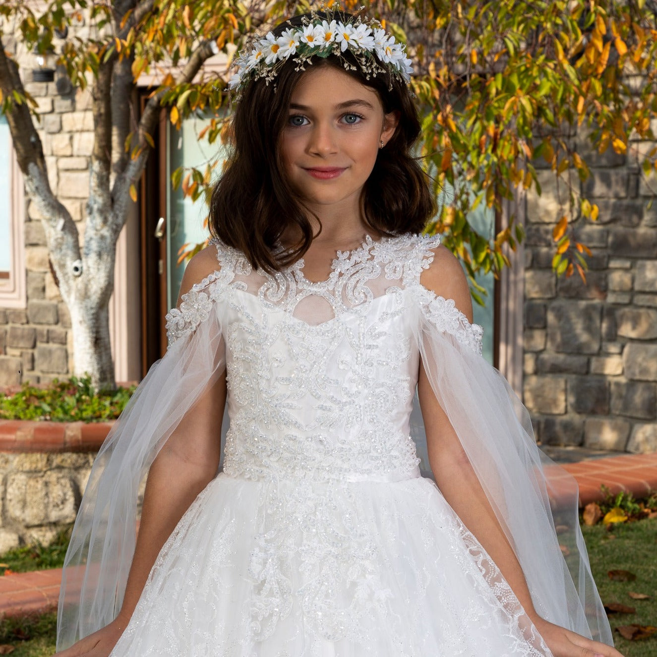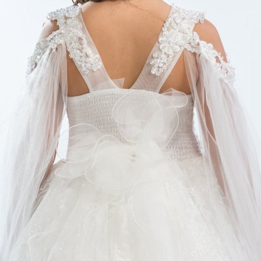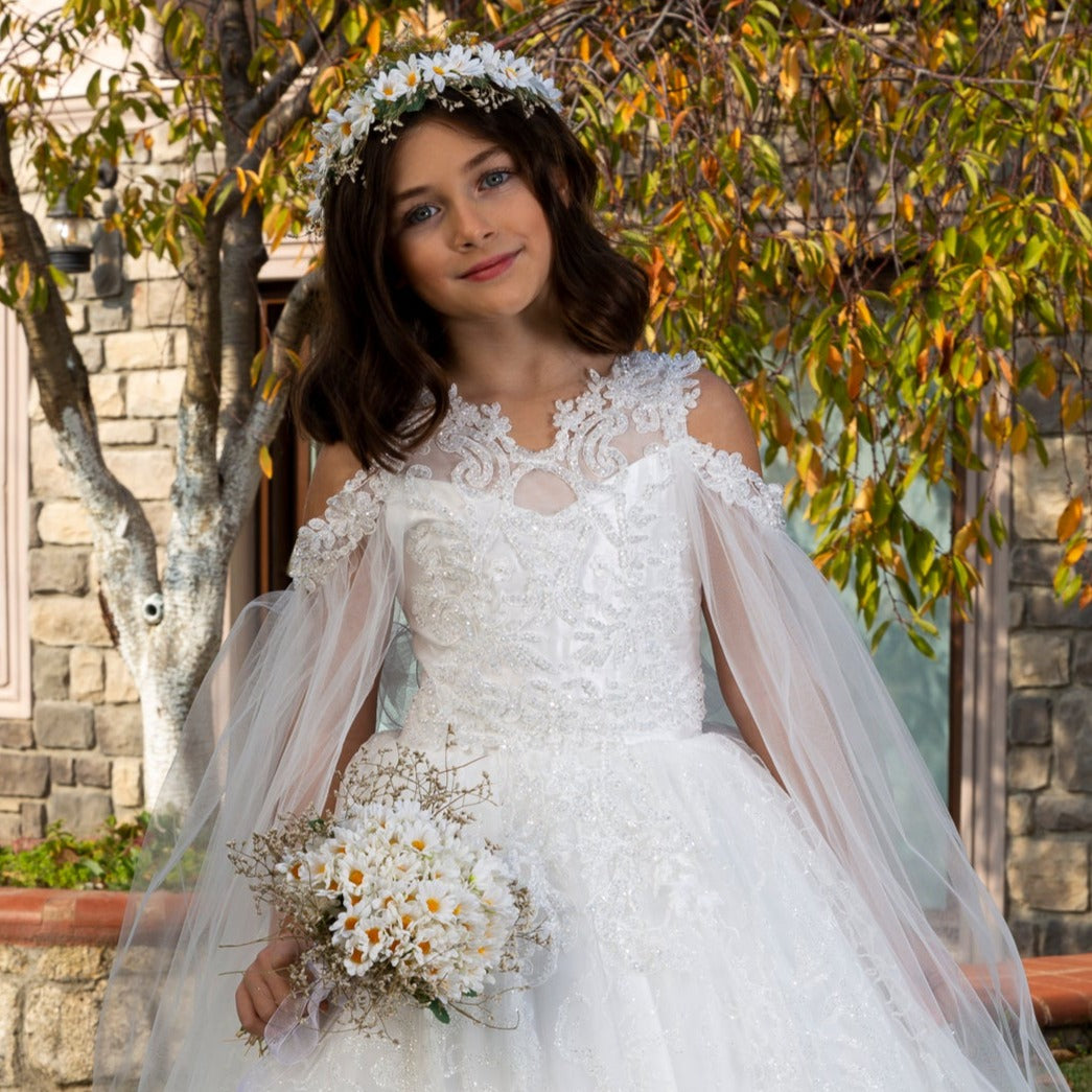 Une vraie robe de mariée...pour les enfants ! Robe en tulle élégante et très bouffante avec perles et perles de mariée et gros nœud assorti amovible dans le dos. Une création exclusive JuniorKids !