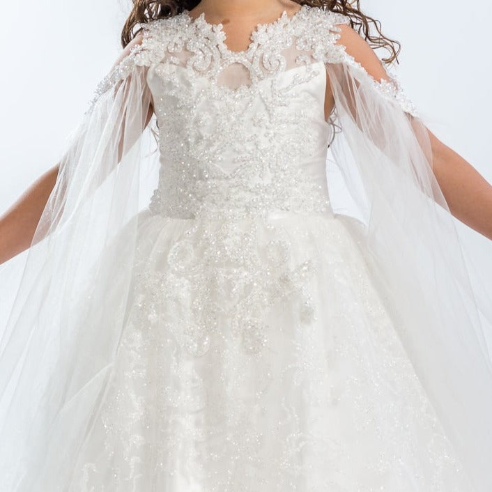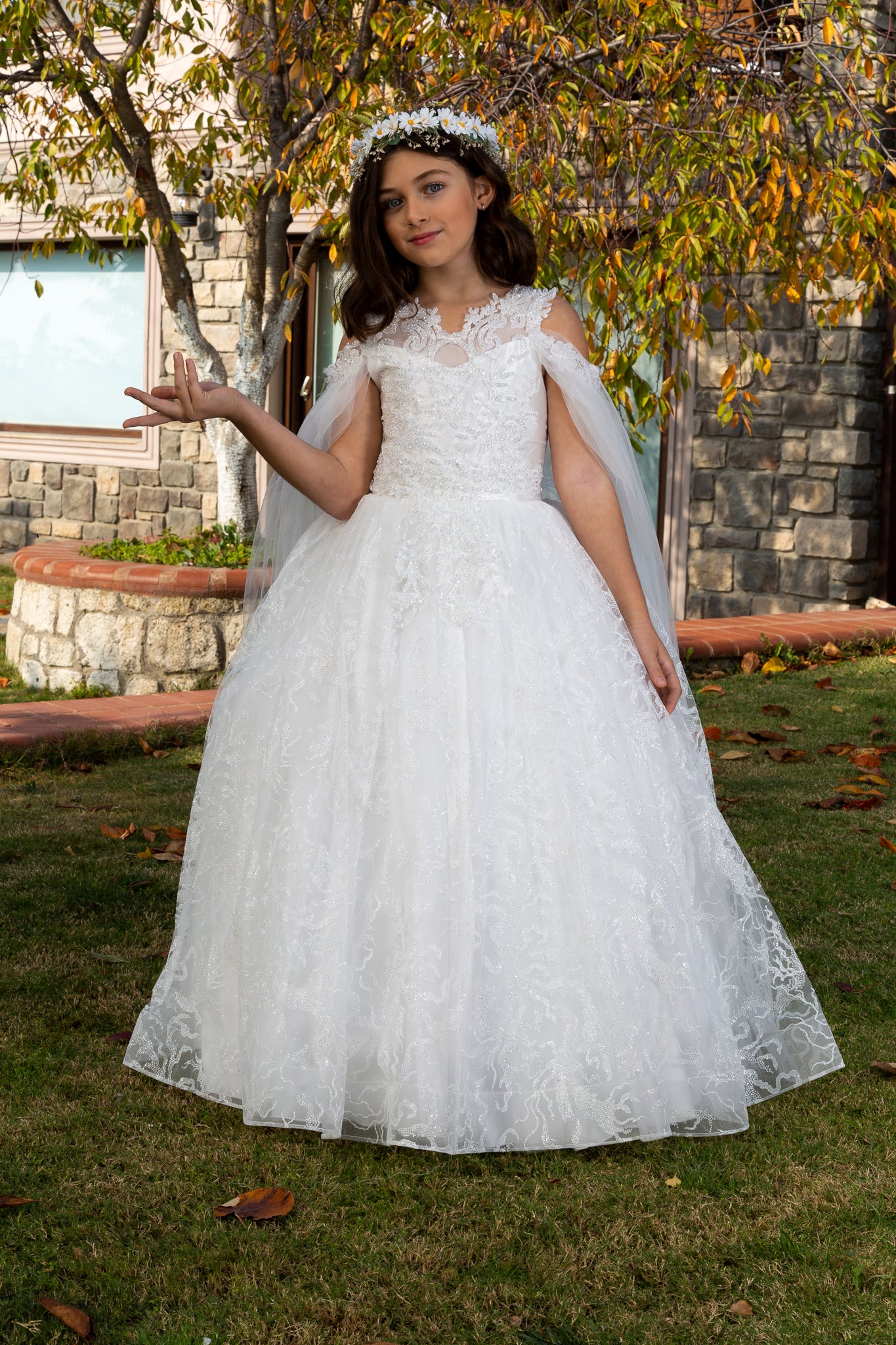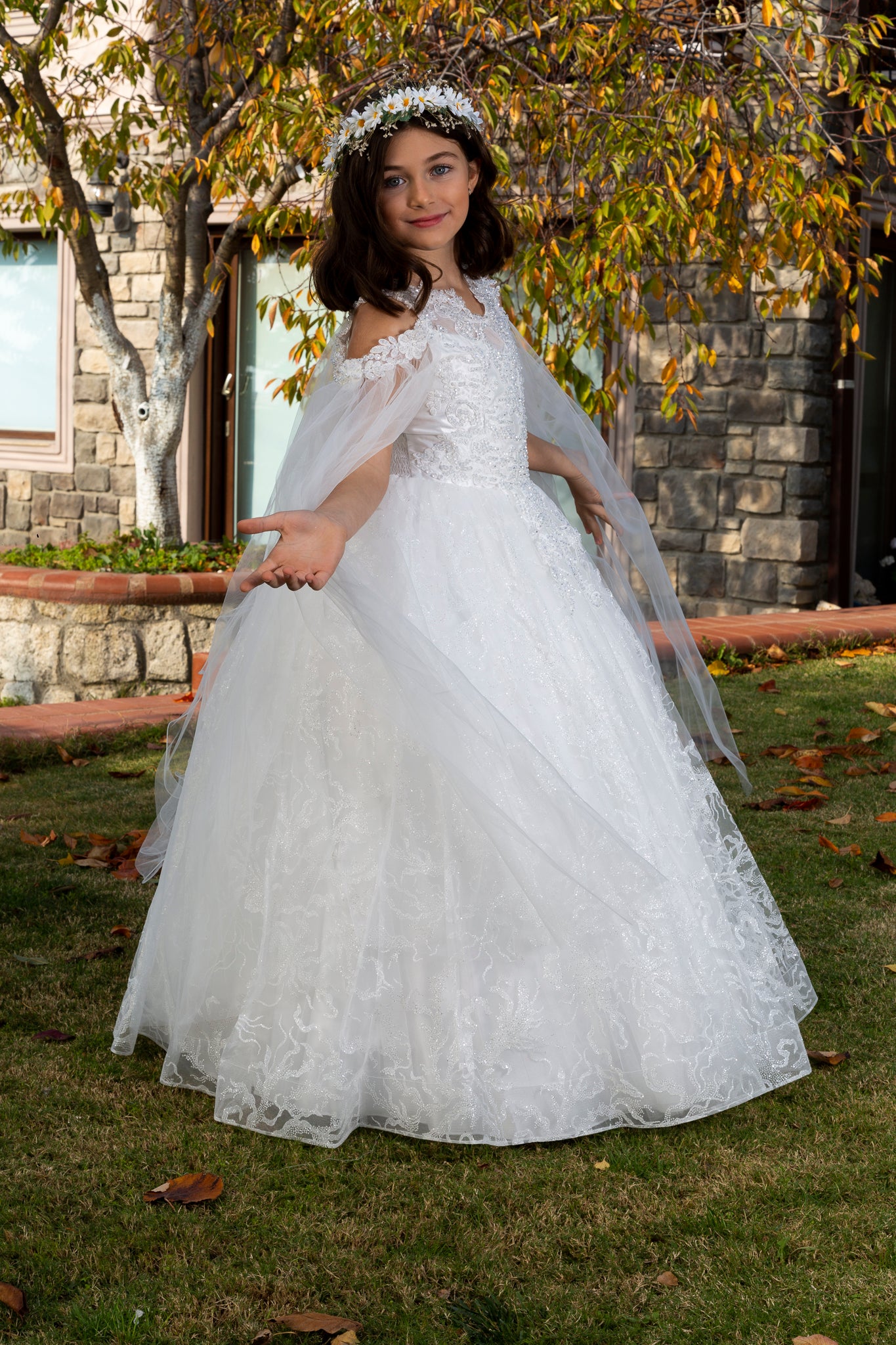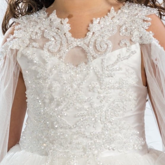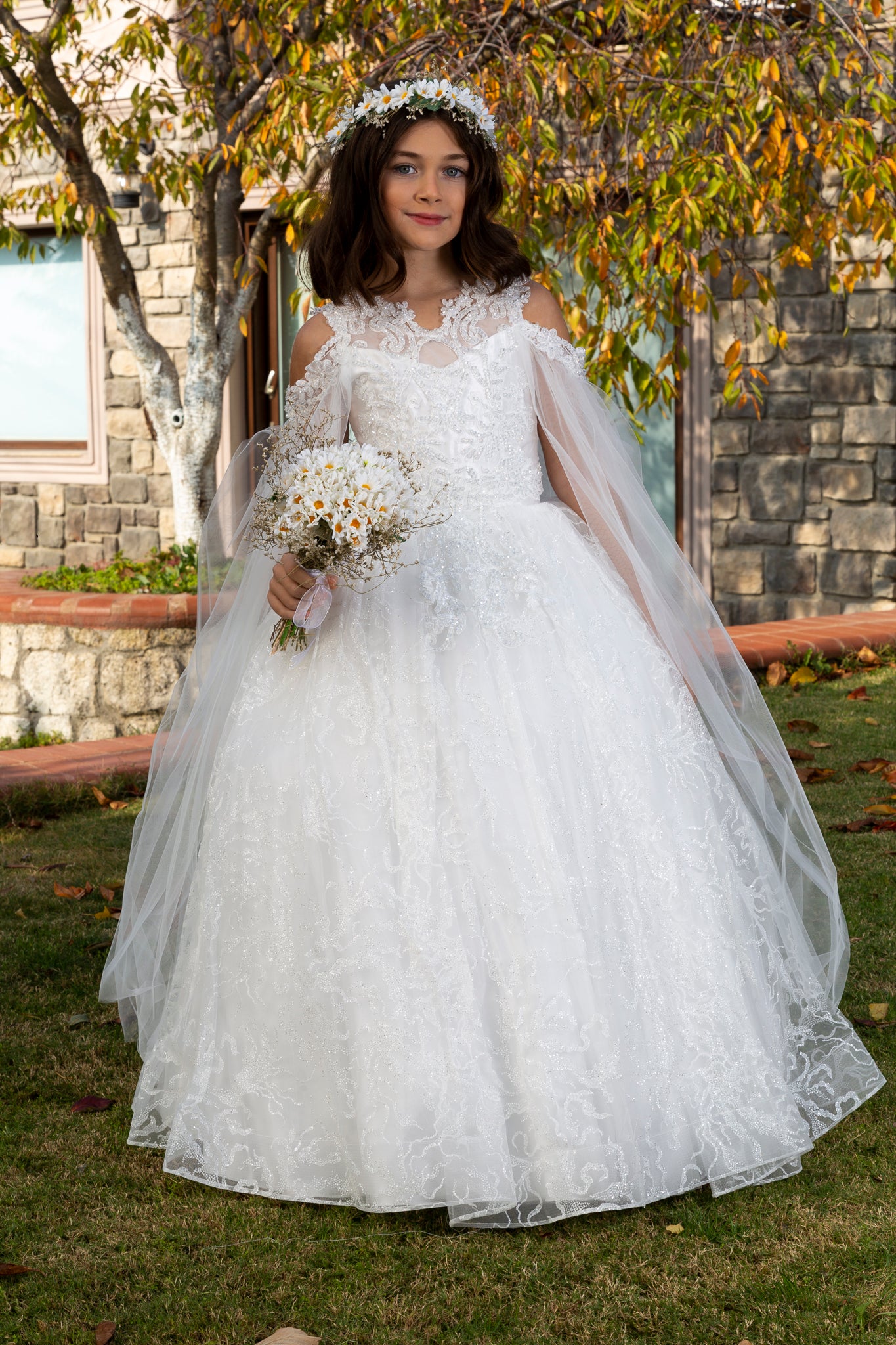 Une vraie robe de mariée...pour les enfants ! Robe en tulle élégante et très bouffante avec perles et perles de mariée et gros nœud assorti amovible dans le dos. Une création exclusive JuniorKids !