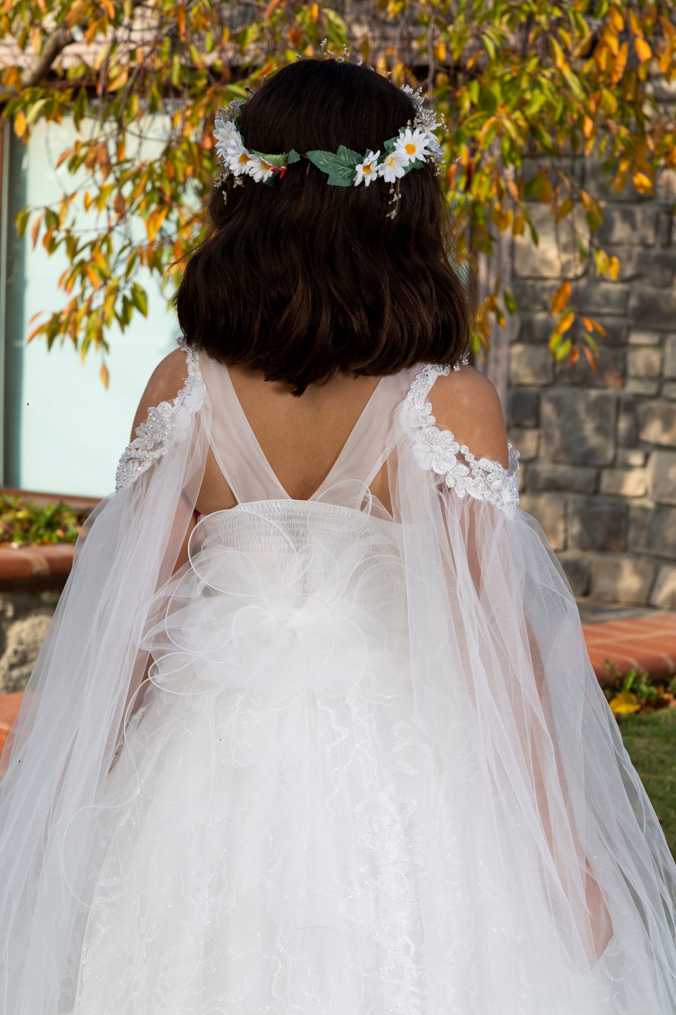 Une vraie robe de mariée... pour nos princesses ! Robe élégante en tulle très bouffante avec perles et diamants tel que sur les robes de mariée et gros noeud amovible dans le dos. Un style unique en son genre, une création JuniorKids !