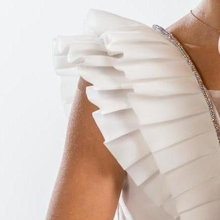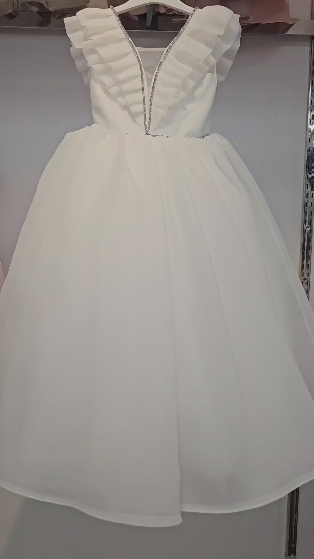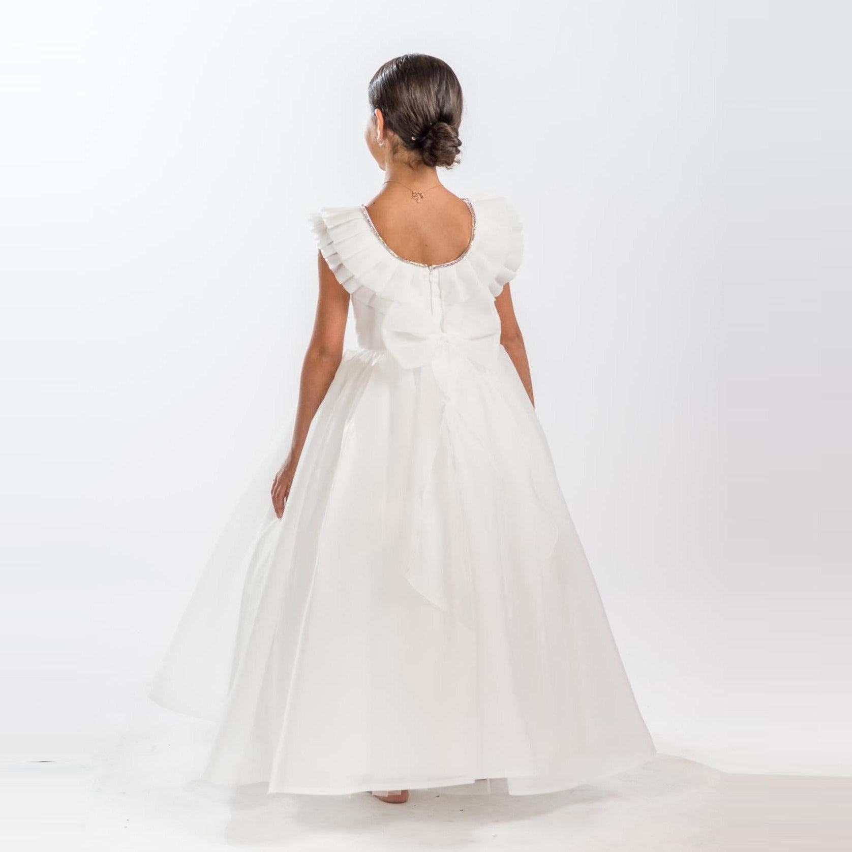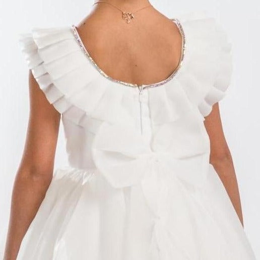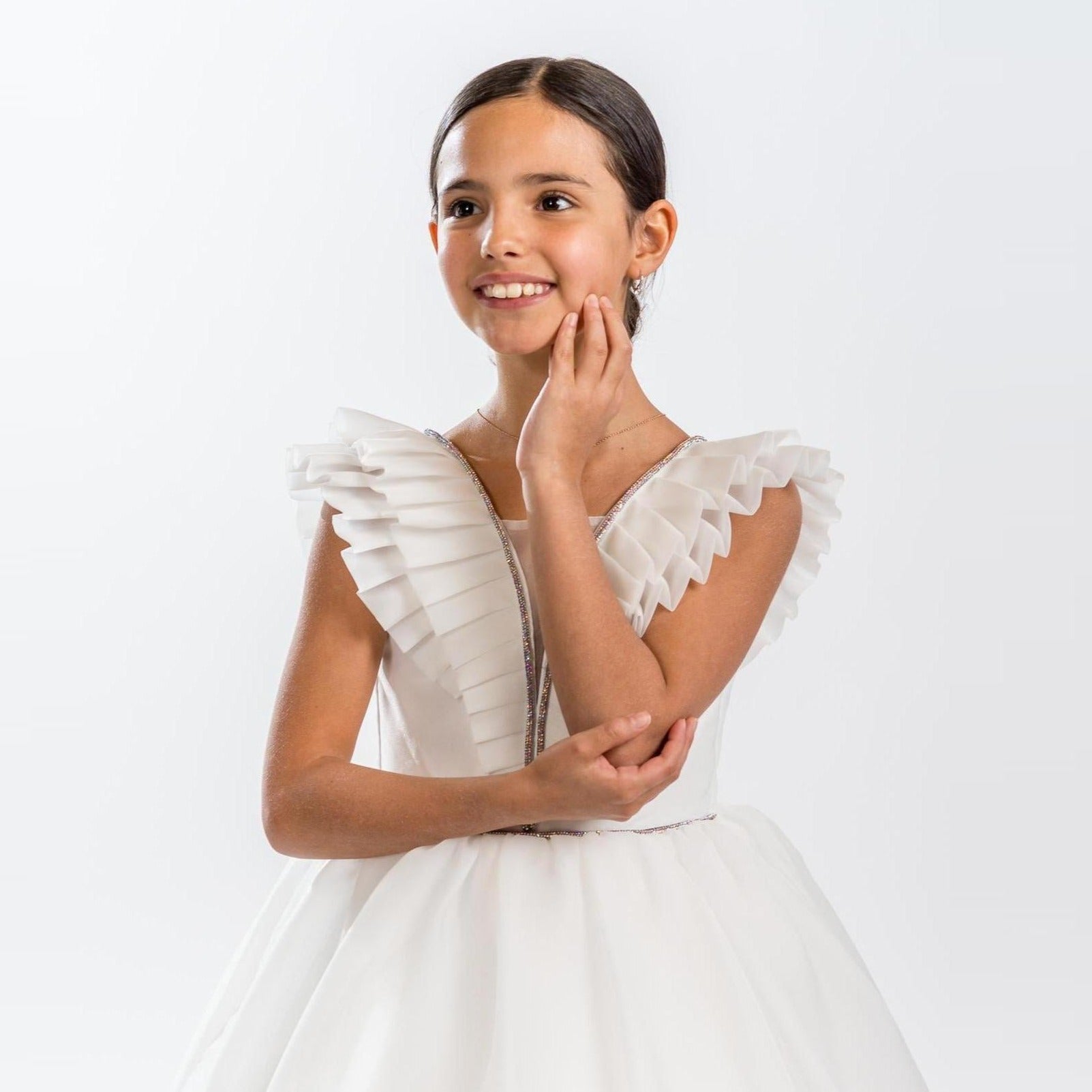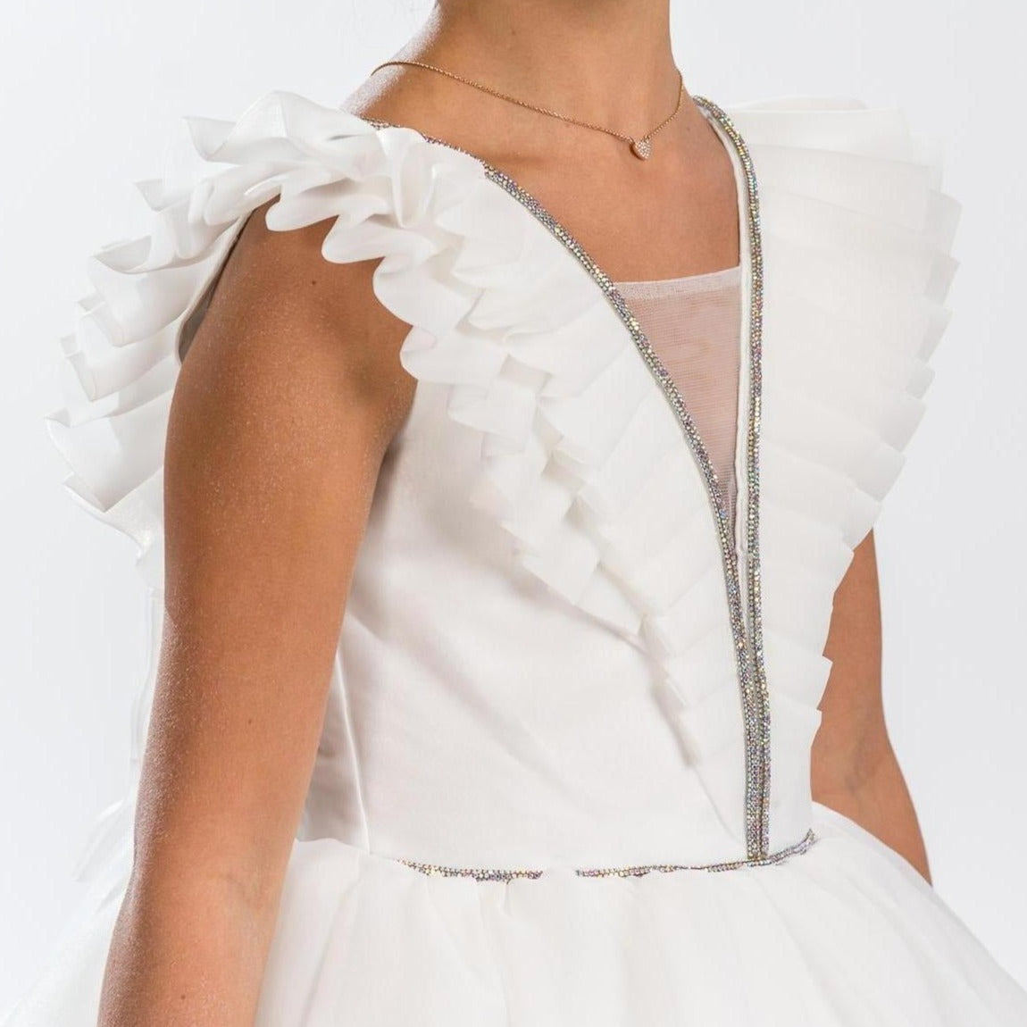 Une vraie robe de mariée... pour nos princesses! Elégante robe en tulle très bouffante avec diamants tel que sur les robes de mariée et gros noeud amovible dans le dos. Un style unique en son genre, une création JuniorKids!