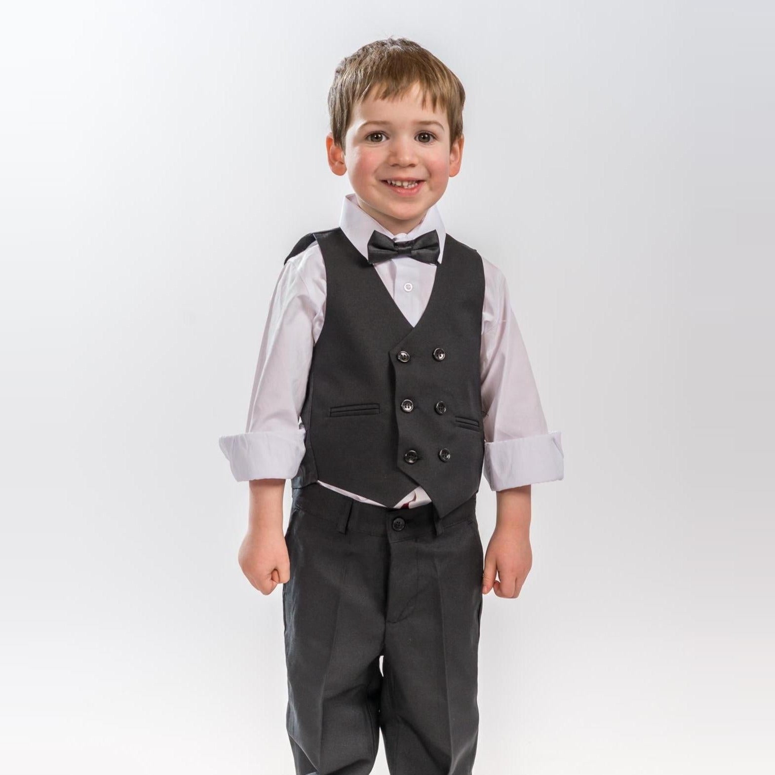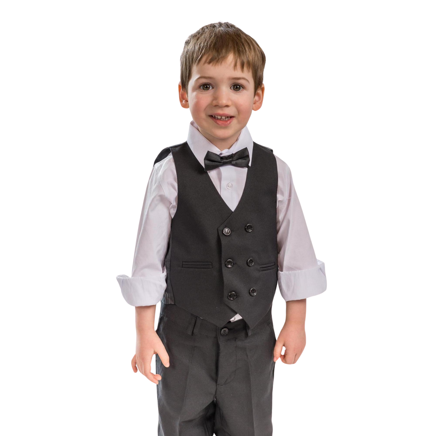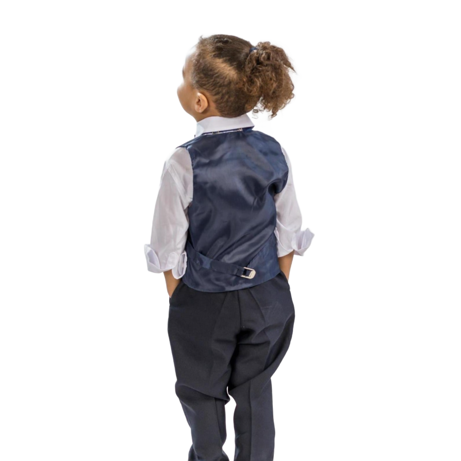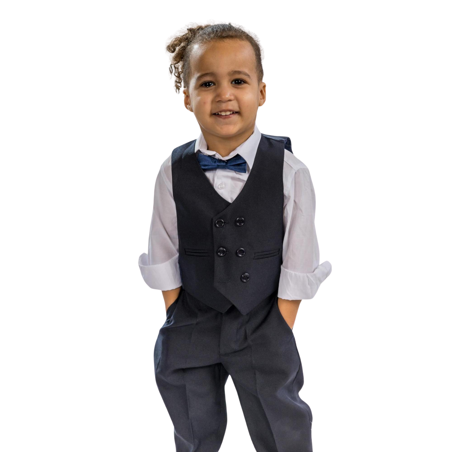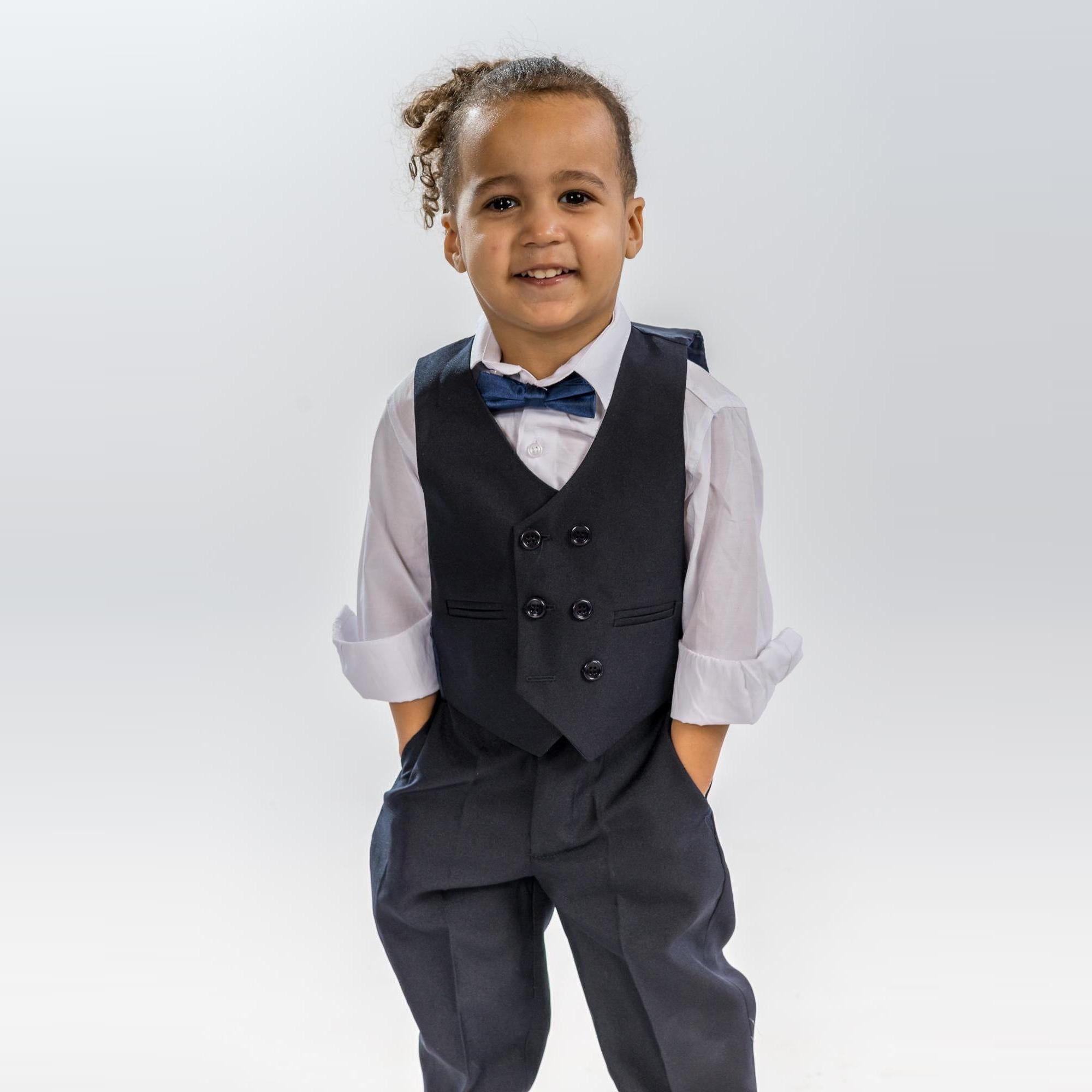 Superbe costume slim fit comprenant blazer, pantalon assorti, gilet en U, chemise en coton imprimé, mouchoir et noeud papillon. Un style très européen et un look exclusif JuniorKids!
