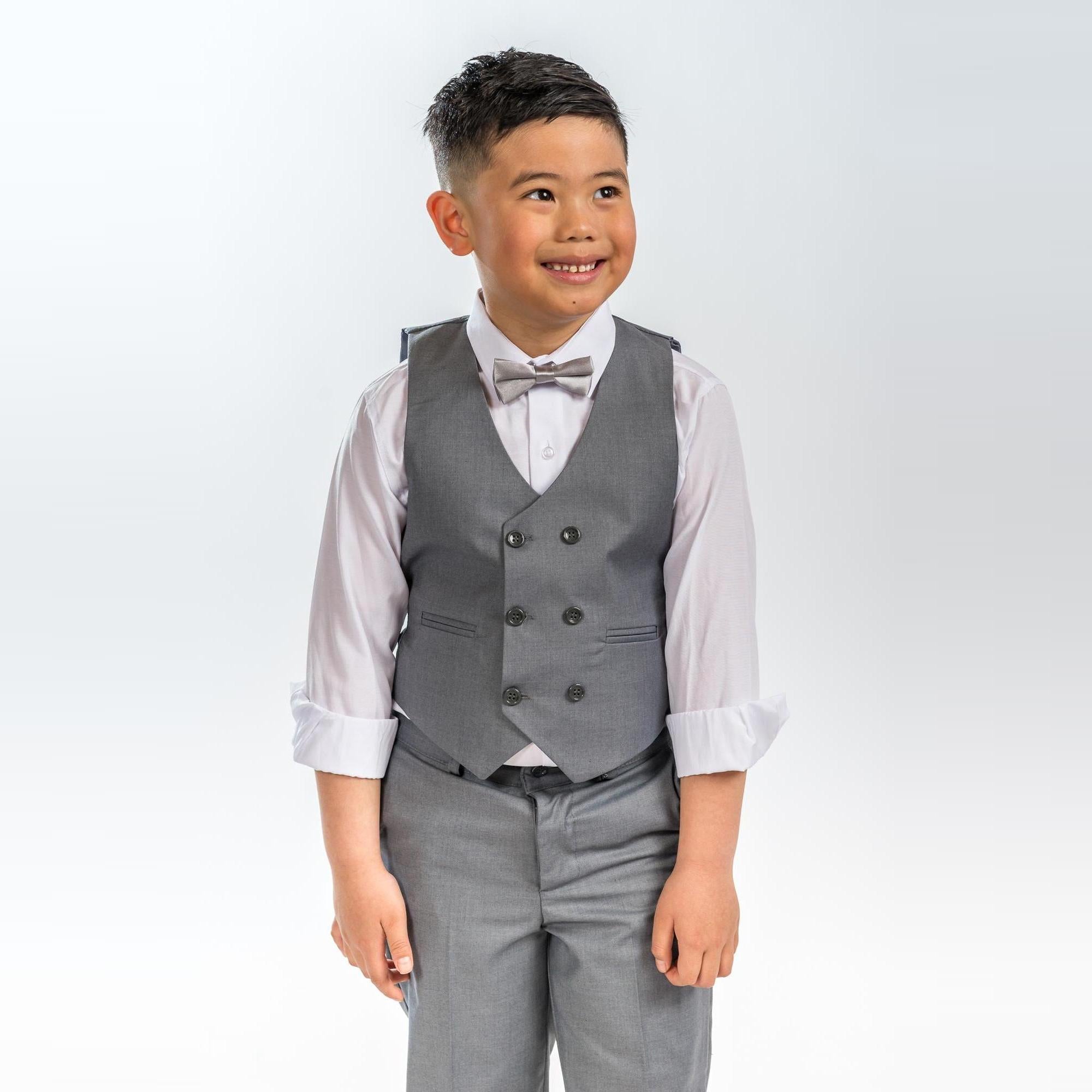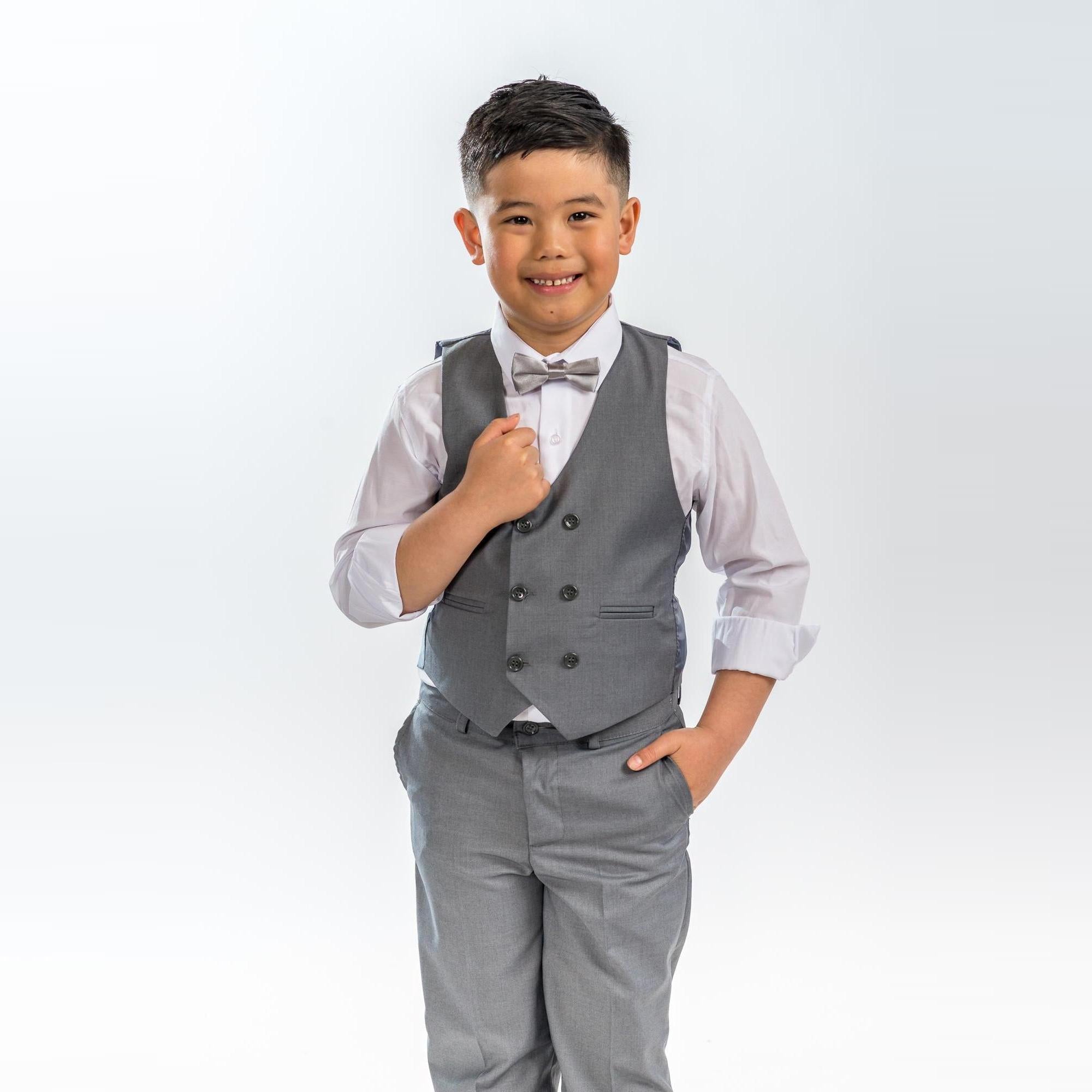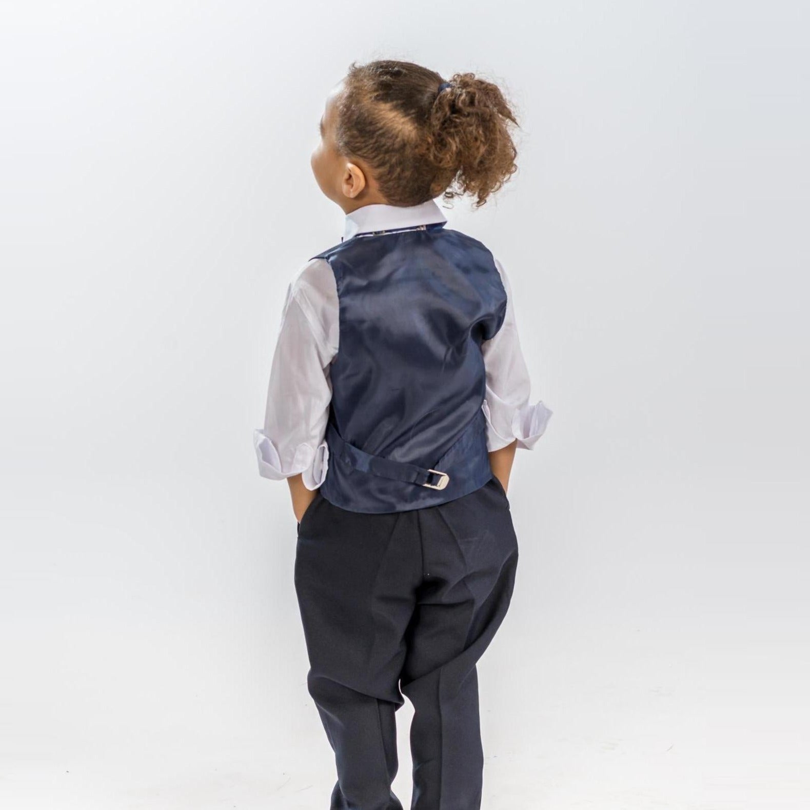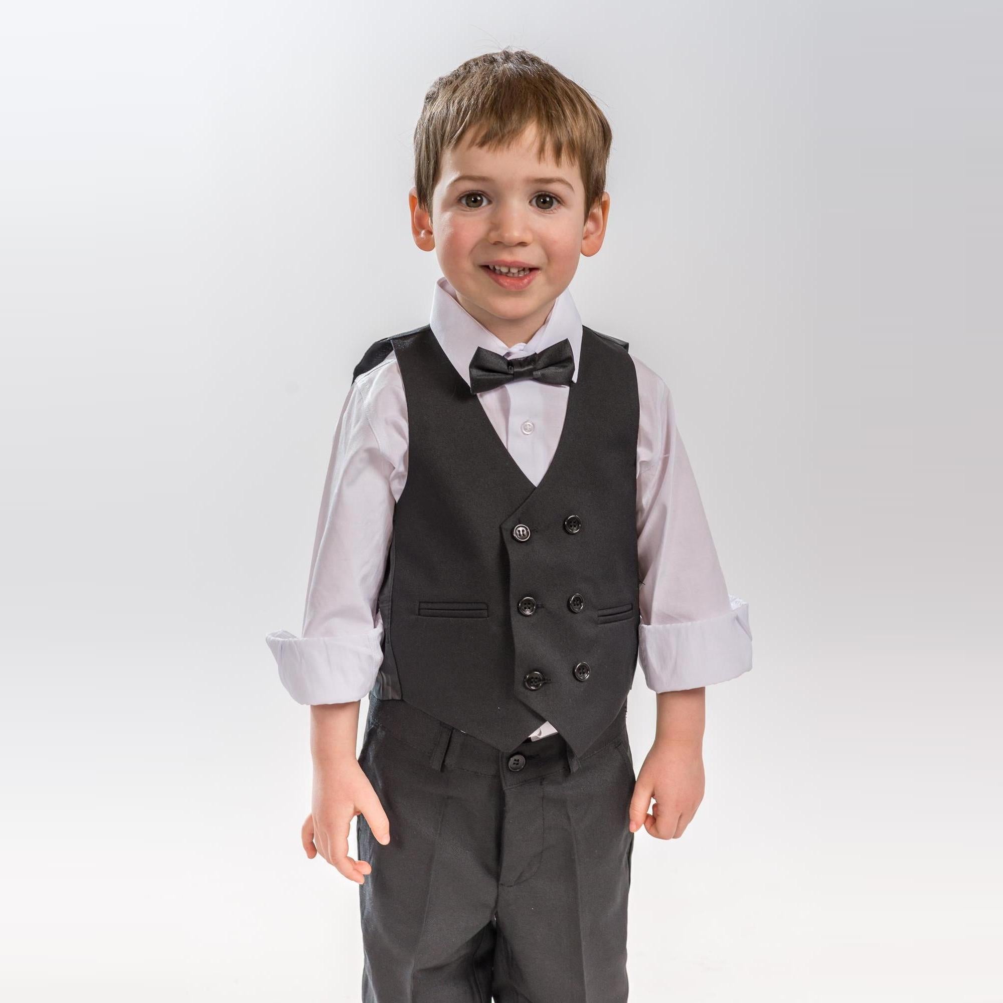 Superbe costume slim fit comprenant blazer, pantalon assorti, gilet en U, chemise en coton imprimé, mouchoir et noeud papillon. Un style très européen et un look exclusif JuniorKids!