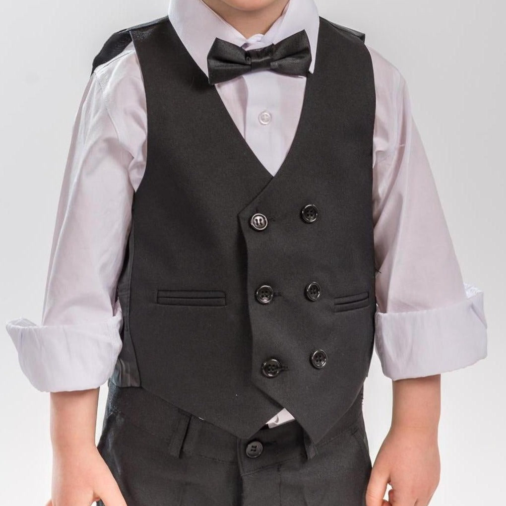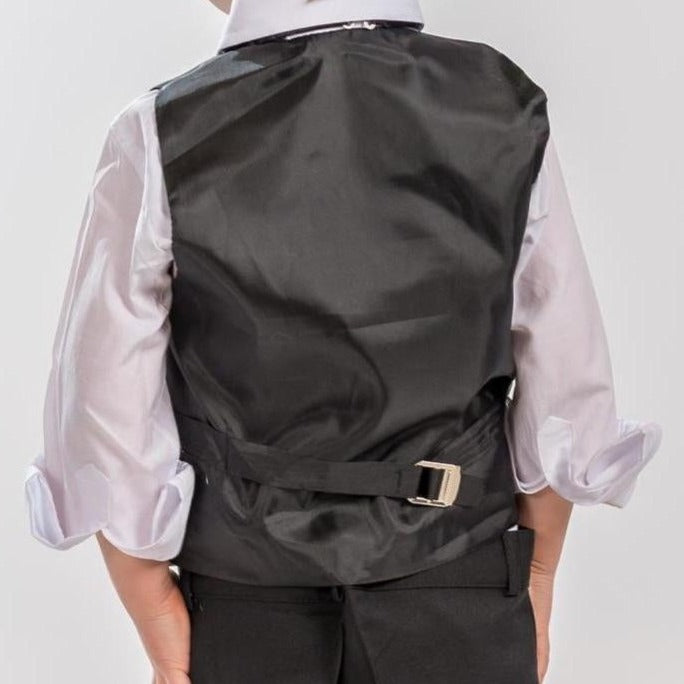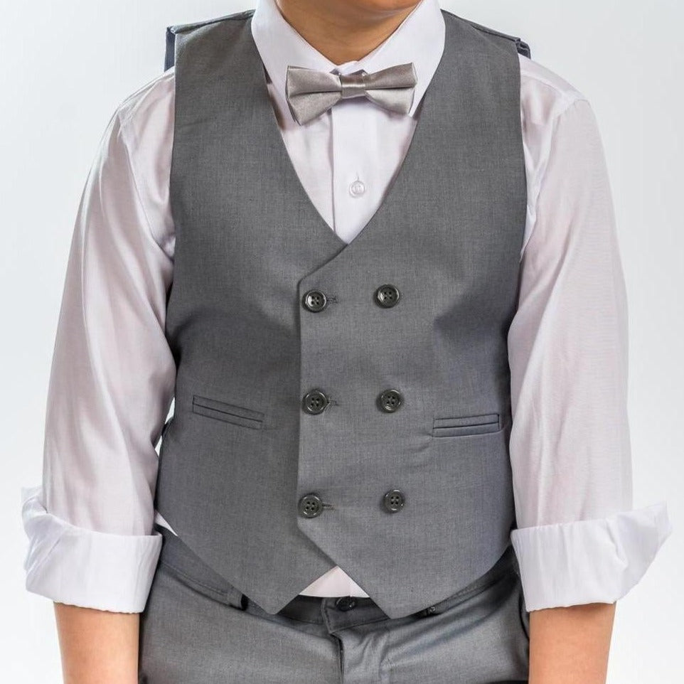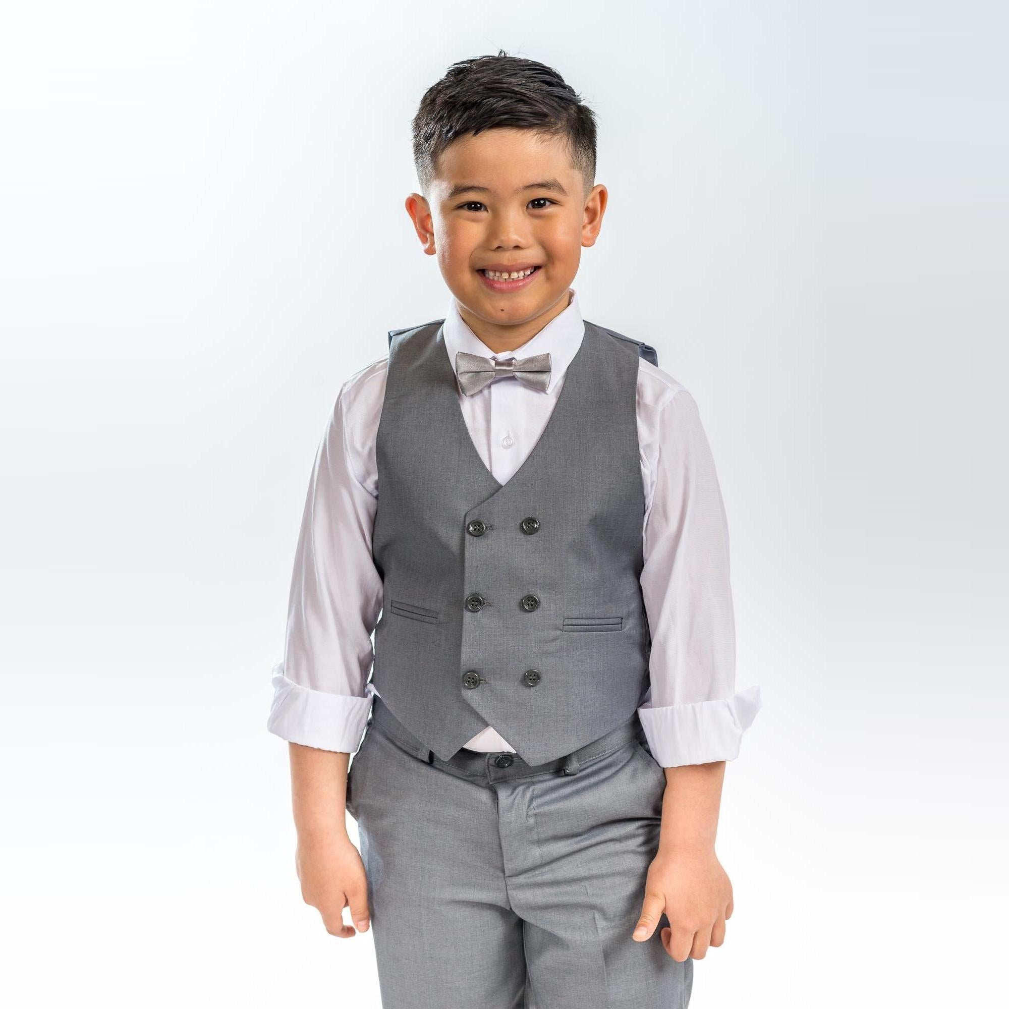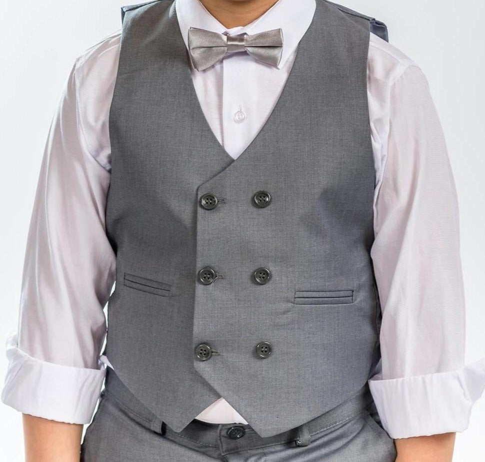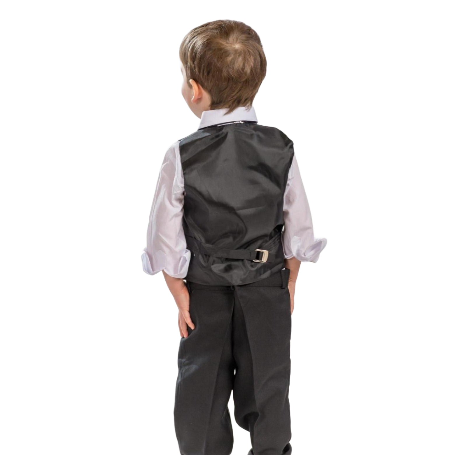 Superbe costume slim fit comprenant blazer, pantalon assorti, gilet en U, chemise en coton imprimé, mouchoir et noeud papillon. Un style très européen et un look exclusif JuniorKids!