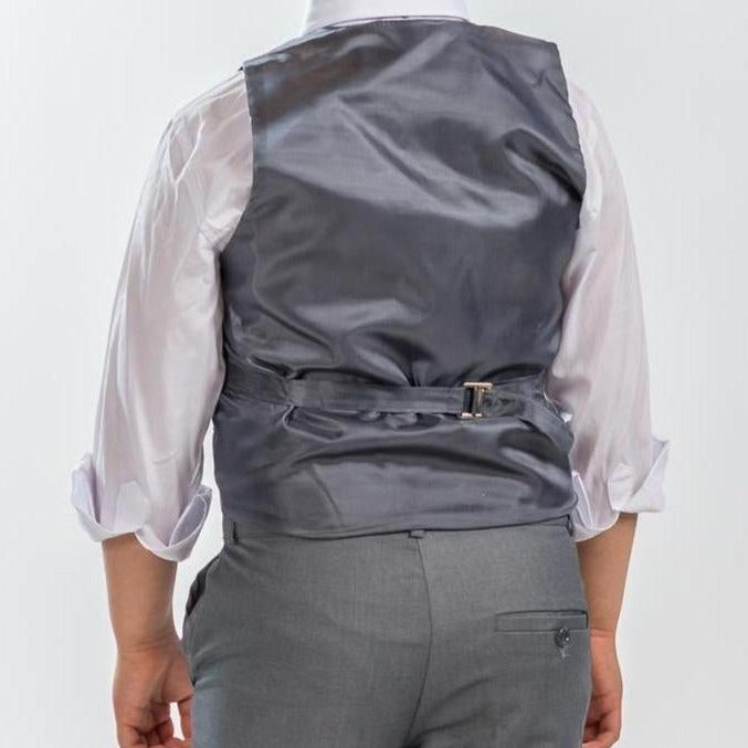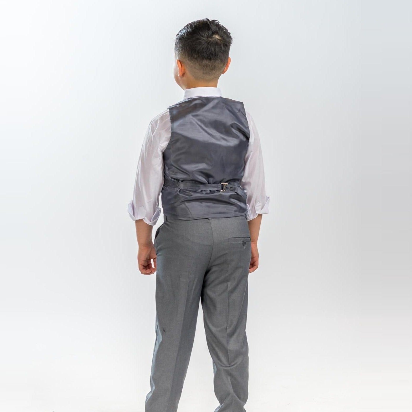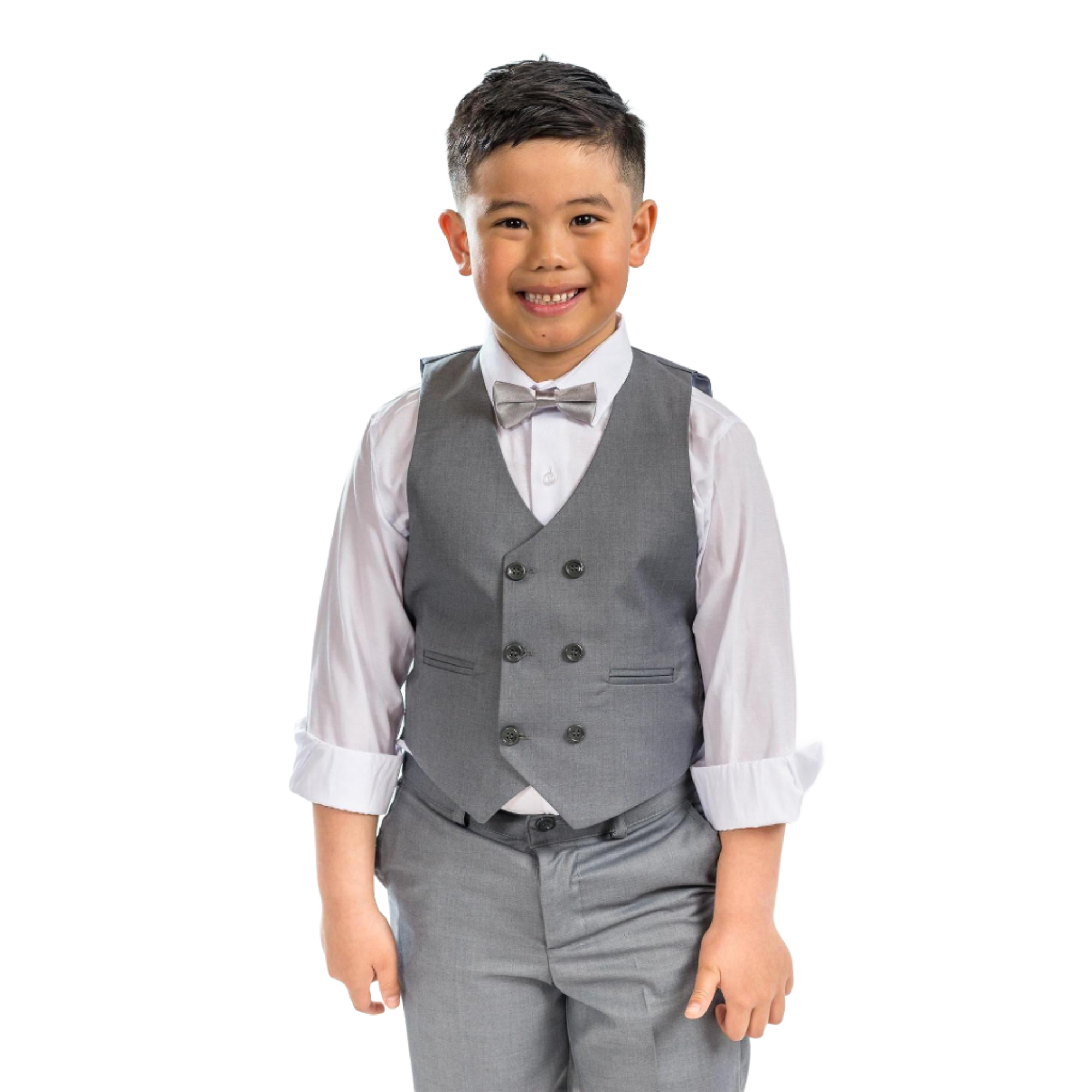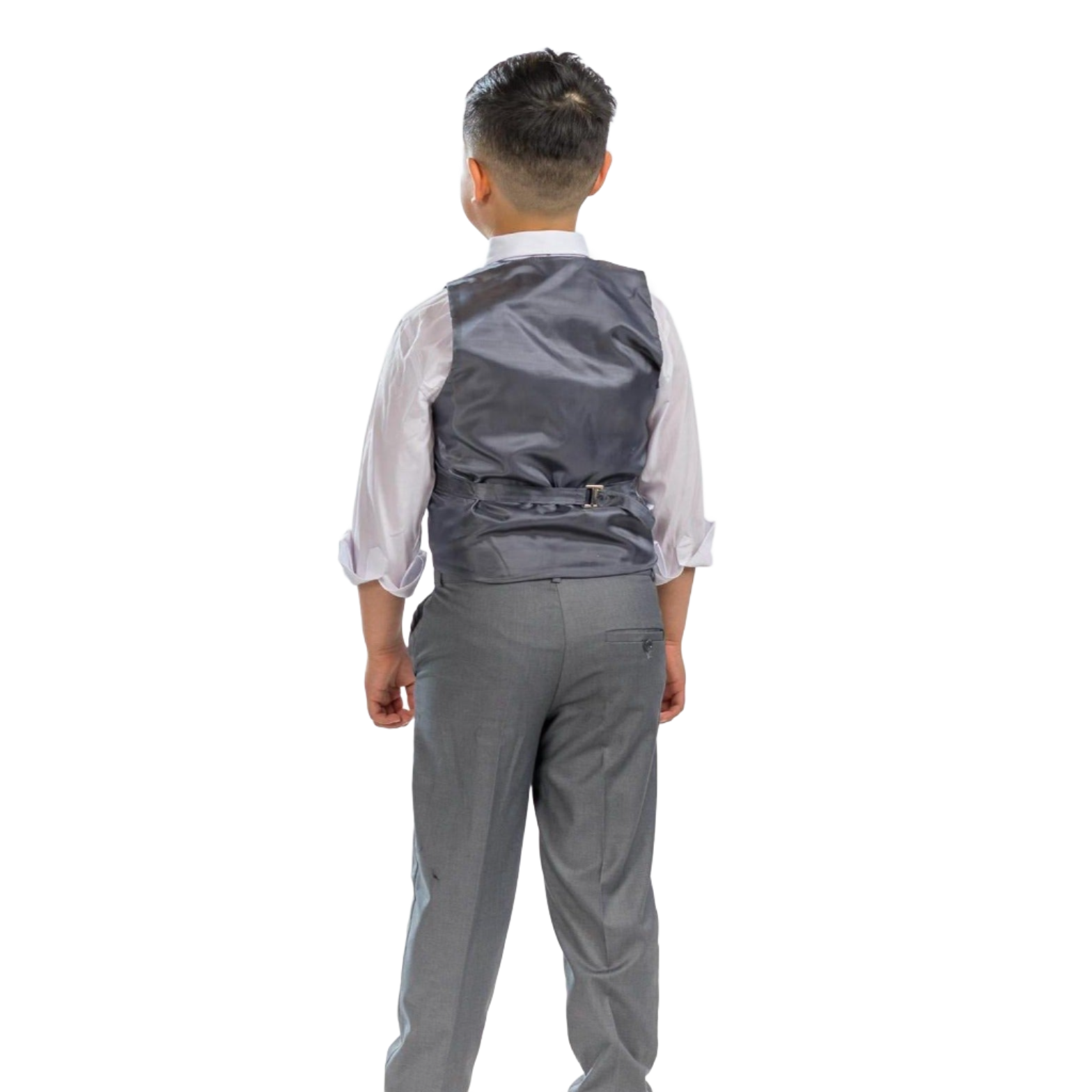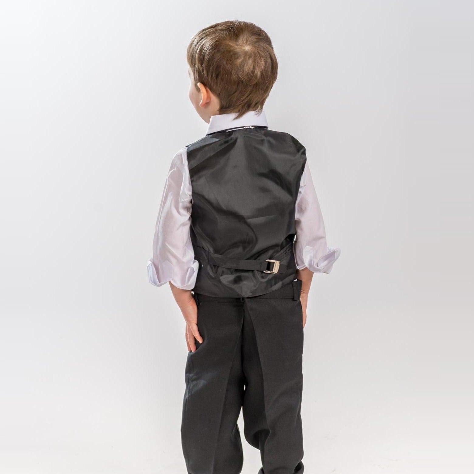 Superbe costume slim fit comprenant blazer, pantalon assorti, gilet en U, chemise en coton imprimé, mouchoir et noeud papillon. Un style très européen et un look exclusif JuniorKids!