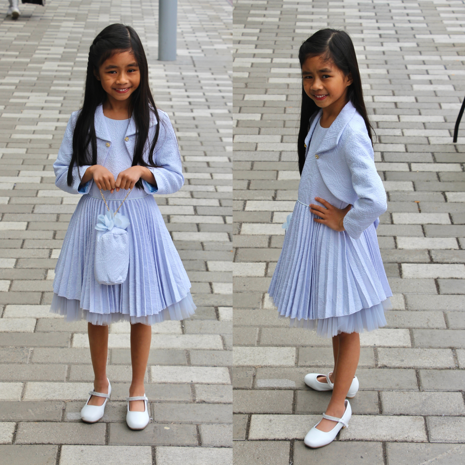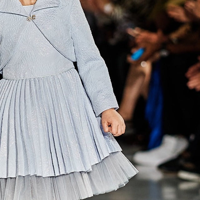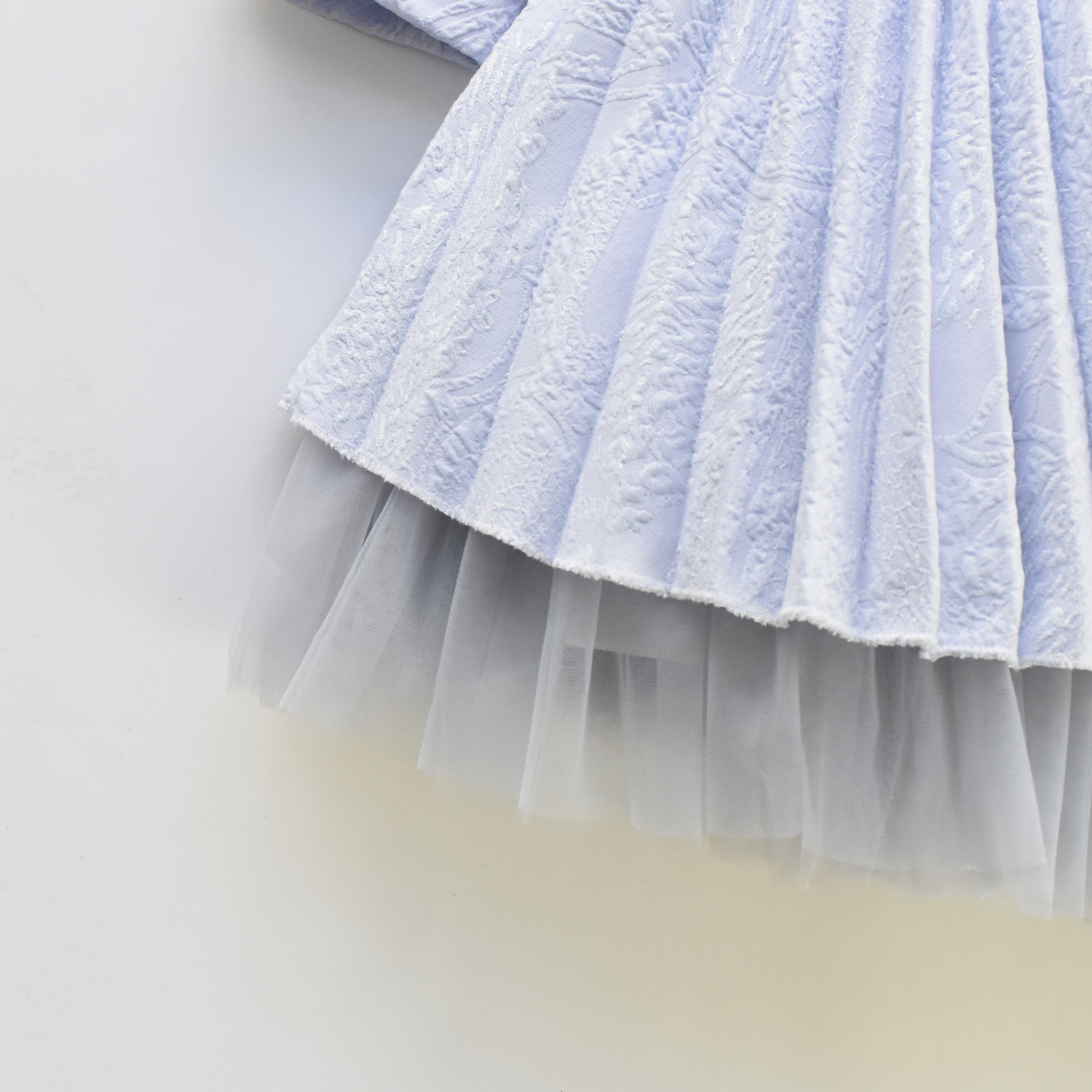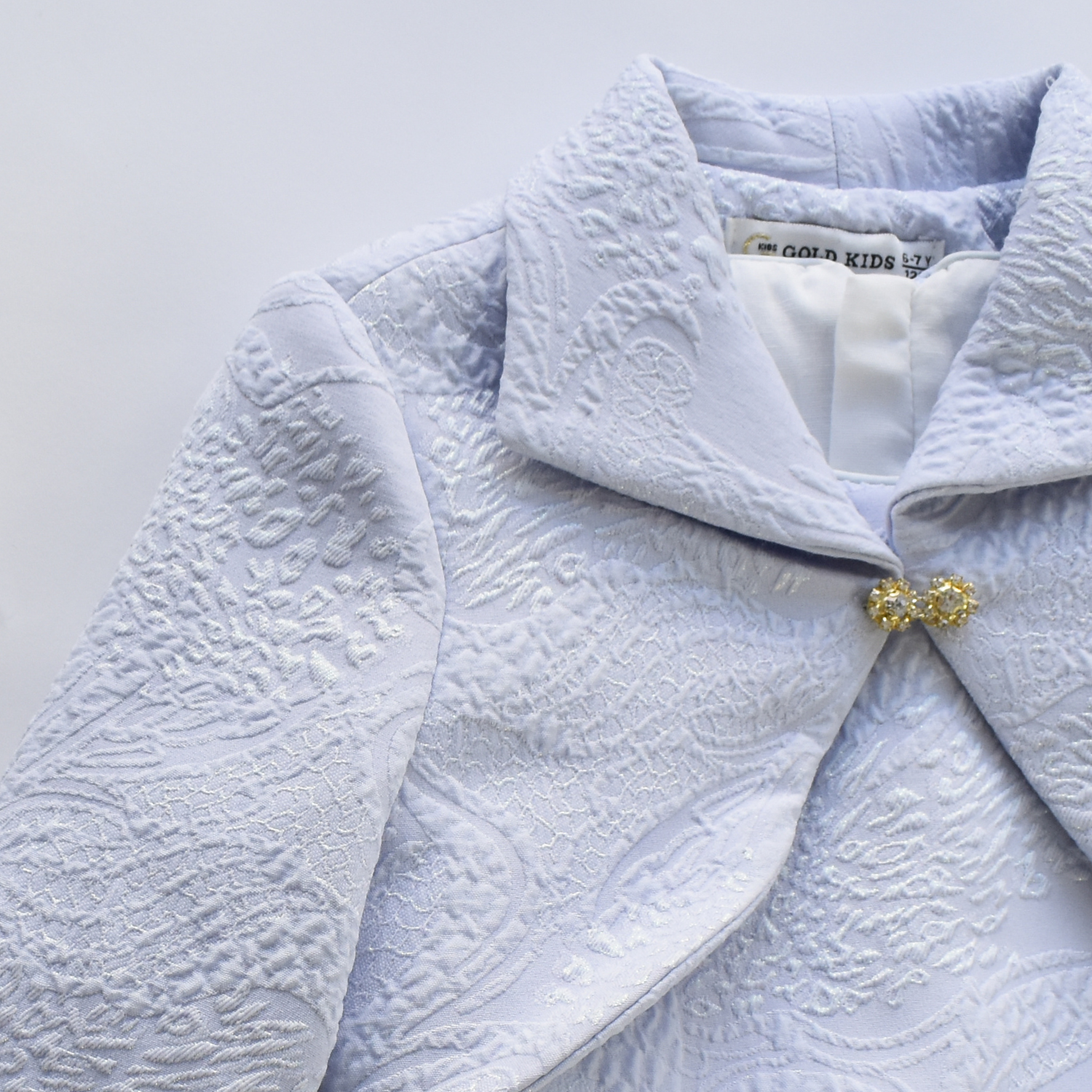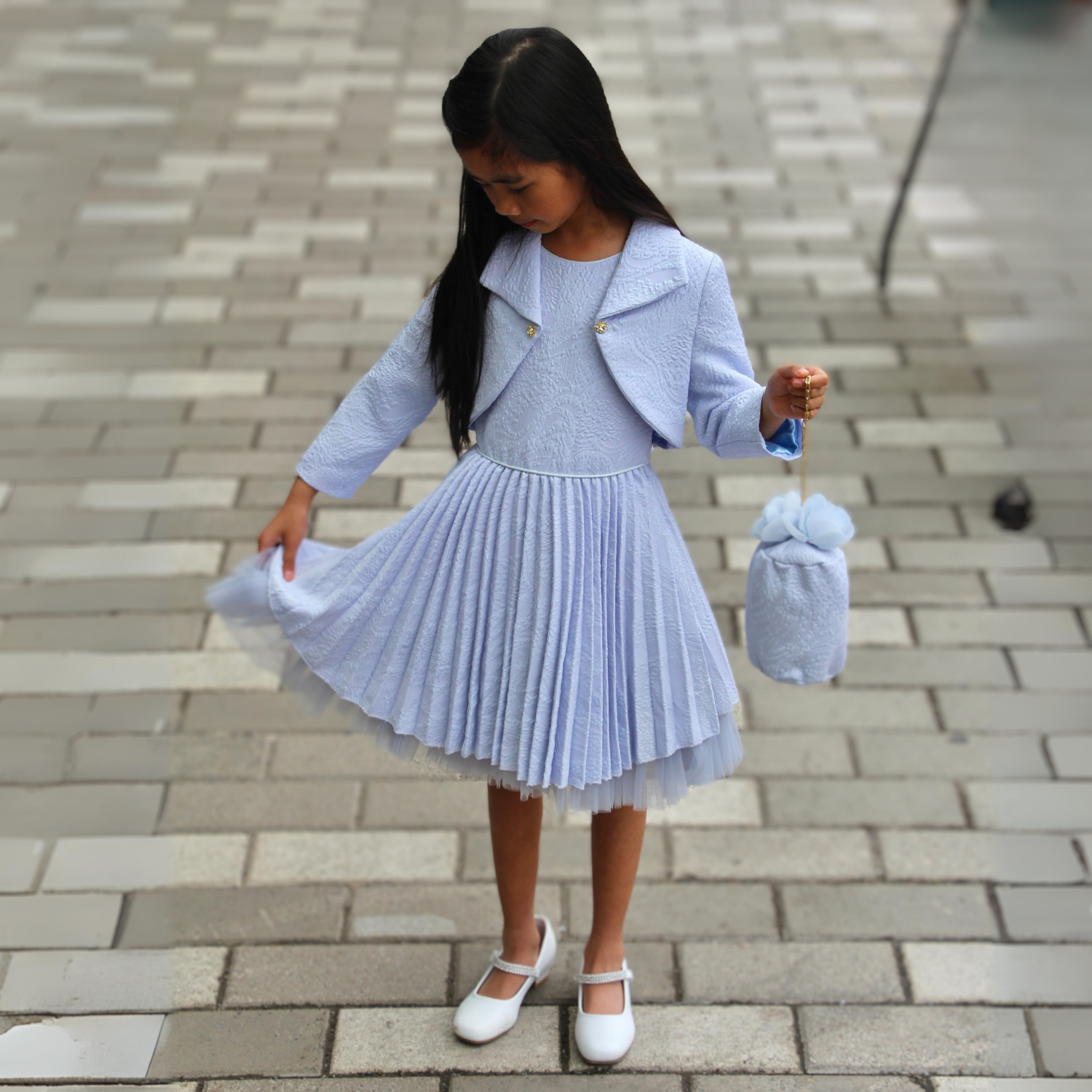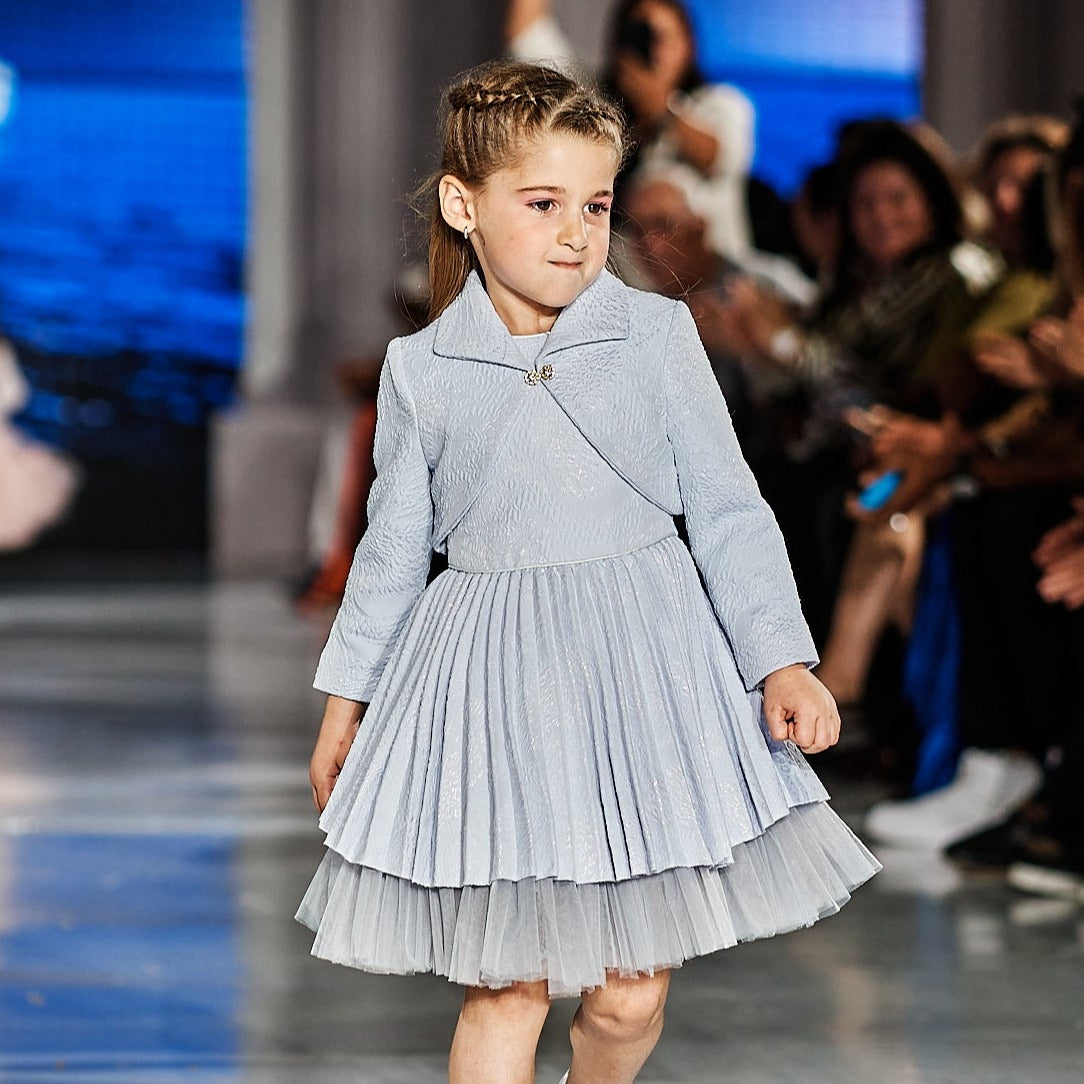 Superbe robe en jacquard brillant avec un bas plissé de style accordéon et une garniture de strass sur la taille. Elle est accompagnée d'un élégant manteau en jacquard, court, avec une ouverture en V. L'intérieur de la robe a une doublure en coton pour un confort parfait. Un style exclusif, une création de JuniorKids.