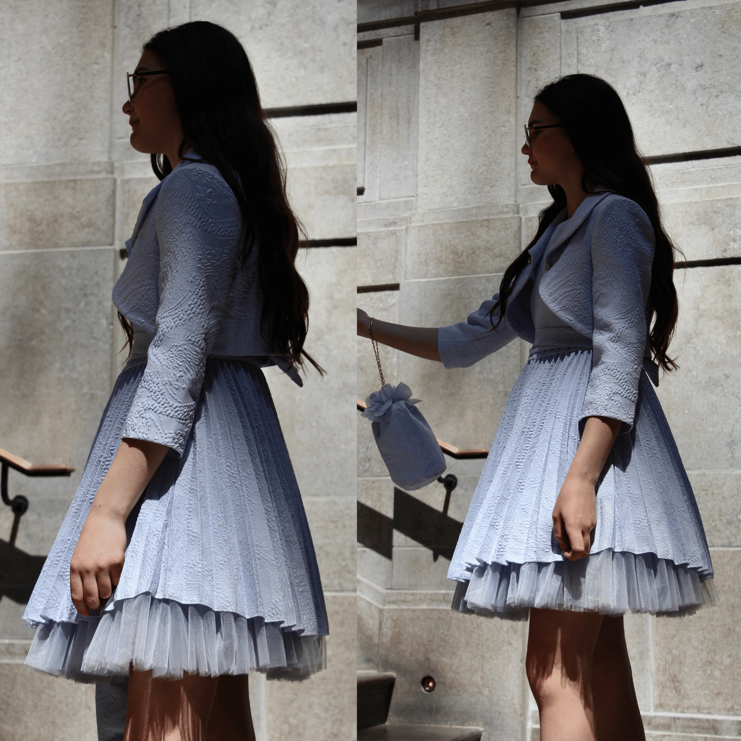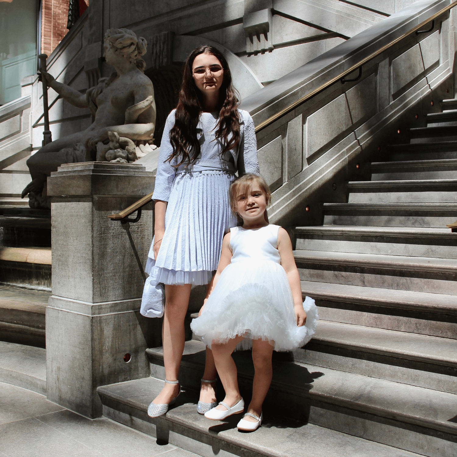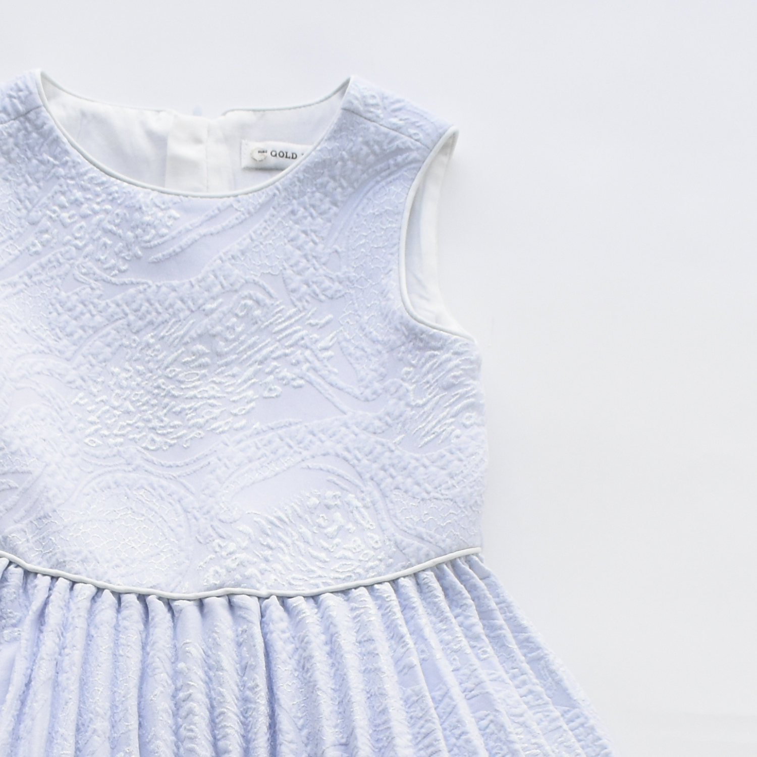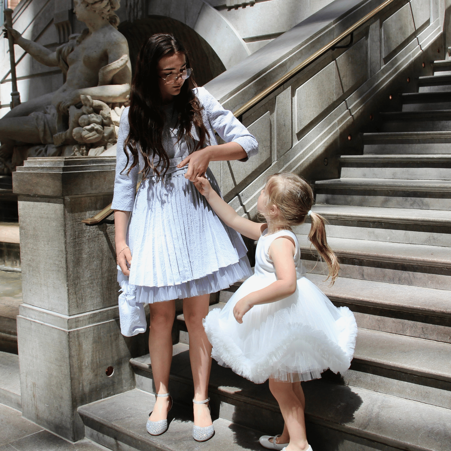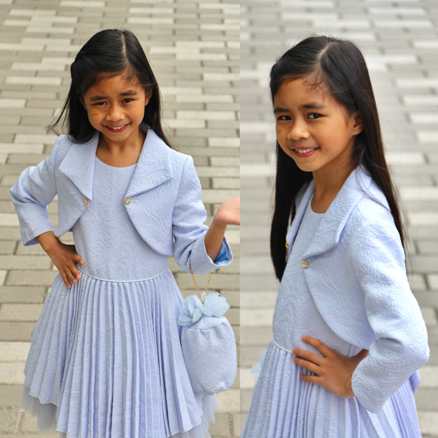 Superbe robe en jacquard brillant avec un bas plissé de style accordéon et une garniture de strass sur la taille. Elle est accompagnée d'un élégant manteau en jacquard, court, avec une ouverture en V. L'intérieur de la robe a une doublure en coton pour un confort parfait. Un style exclusif, une création de JuniorKids.