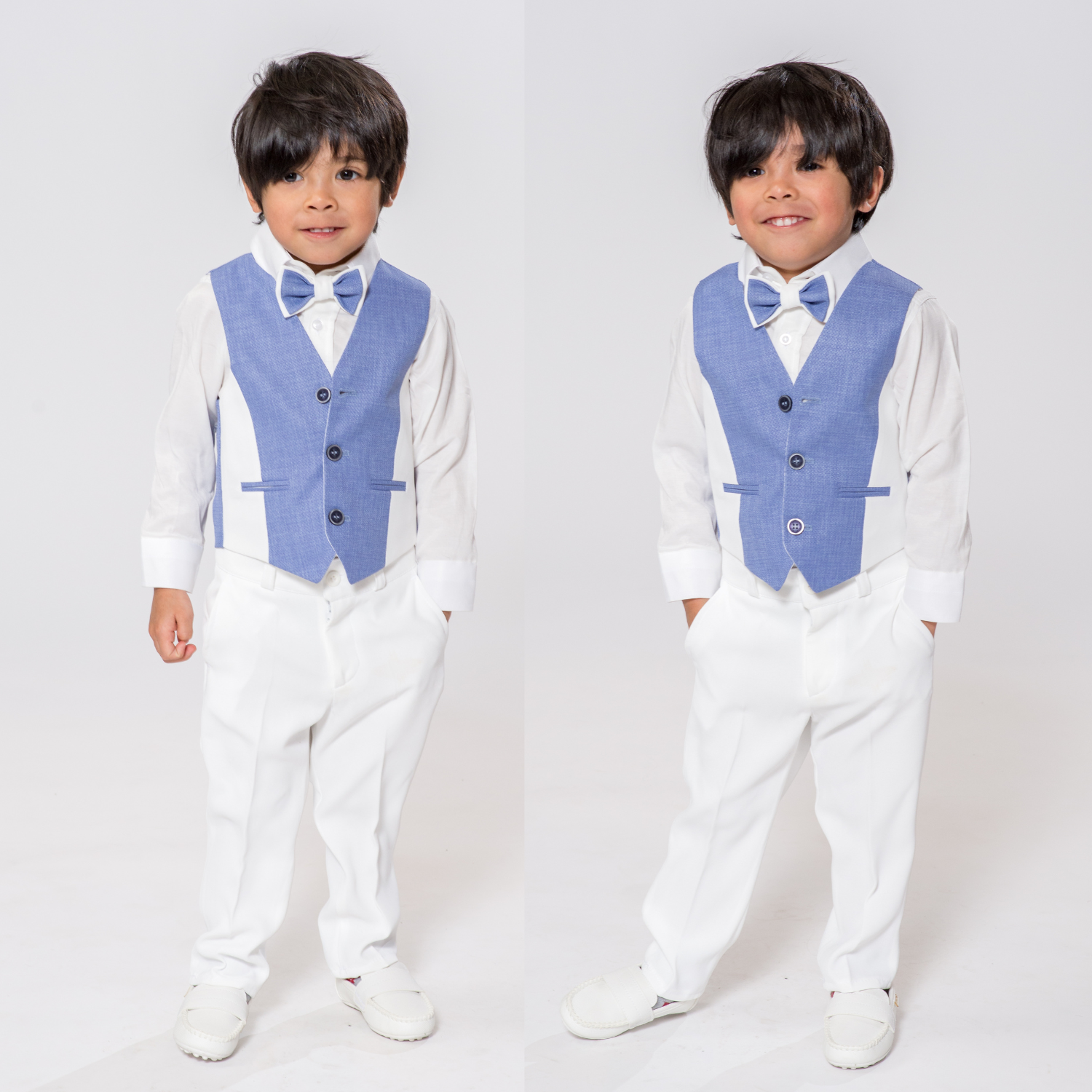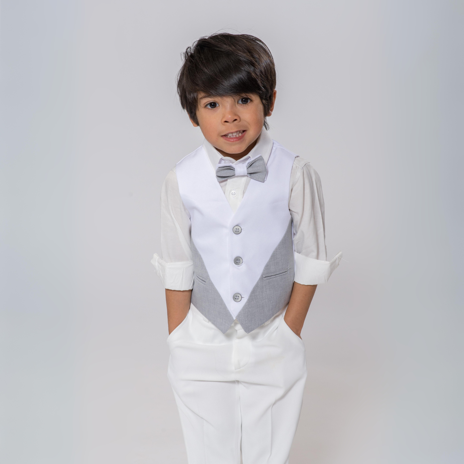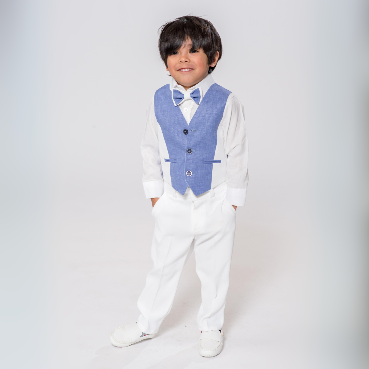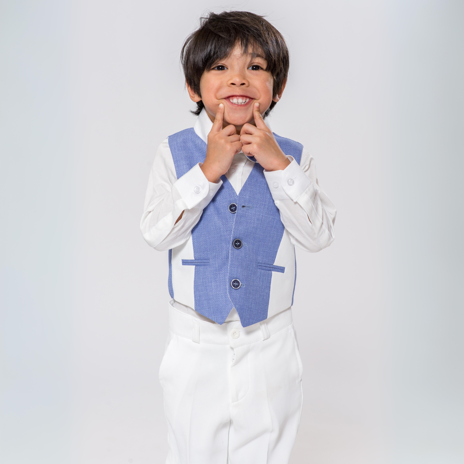 Ensemble de gilet élégant, y comprenant un gilet sans manches, une chemise en coton doux, un pantalon de coton à taille ajustable, slim fit et un noeud. Une vraie superstar JuniorKids !