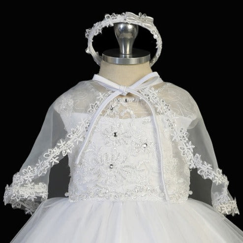 ROBE+CAPE+BANDEAU : Superbe robe avec des appliques de dentelle brodées, des accents d'arc et en tulle bouffant. Cape en organza et bandeau de baptême inclus. Cette robe de baptême en blanc est un style flatteur pour votre douce fille.