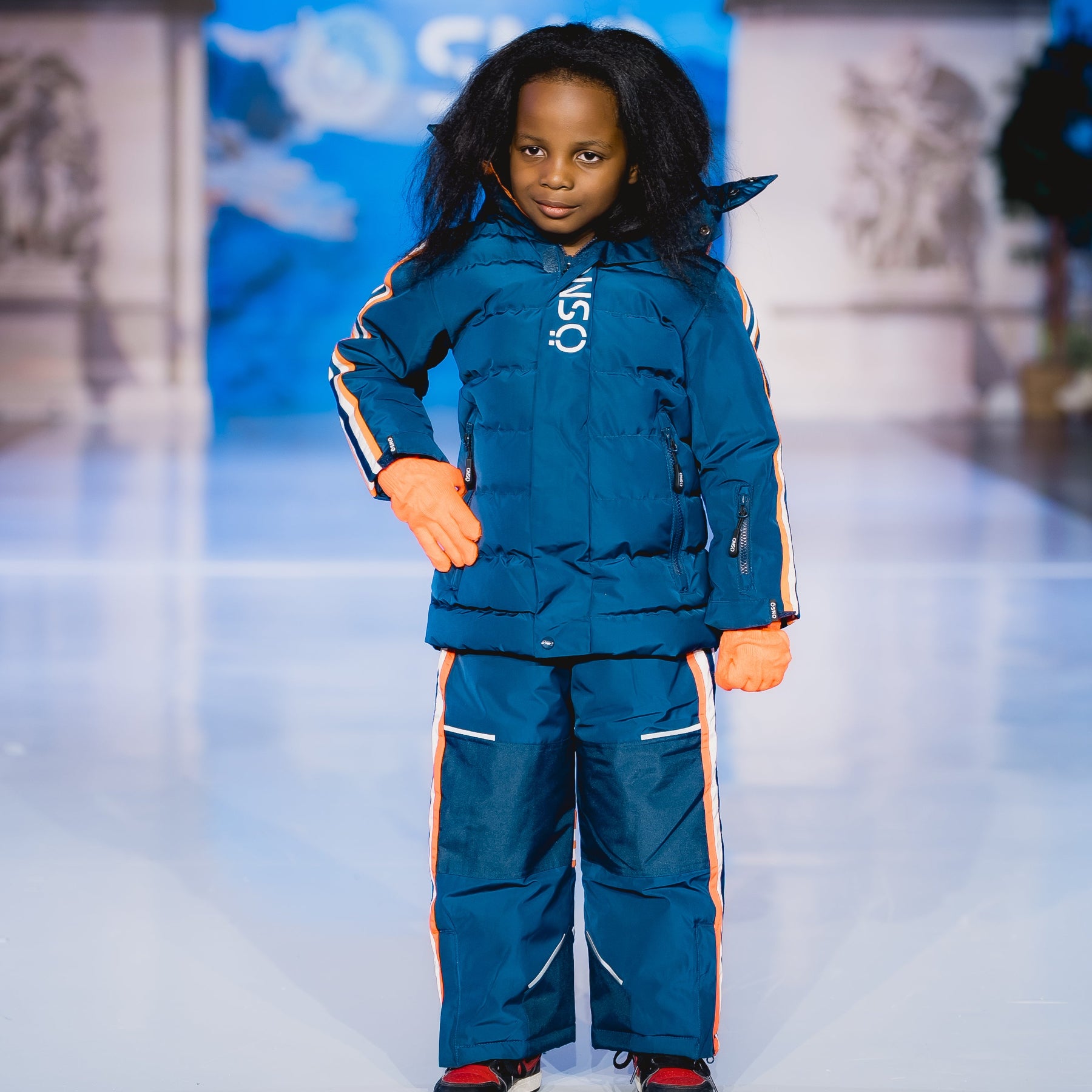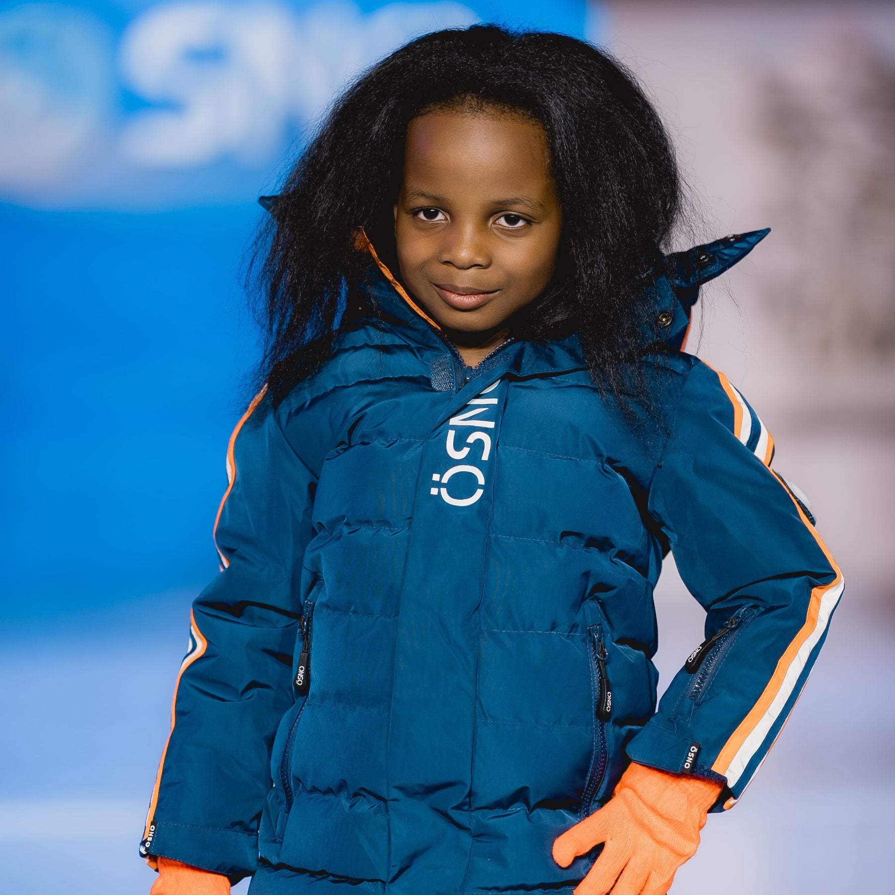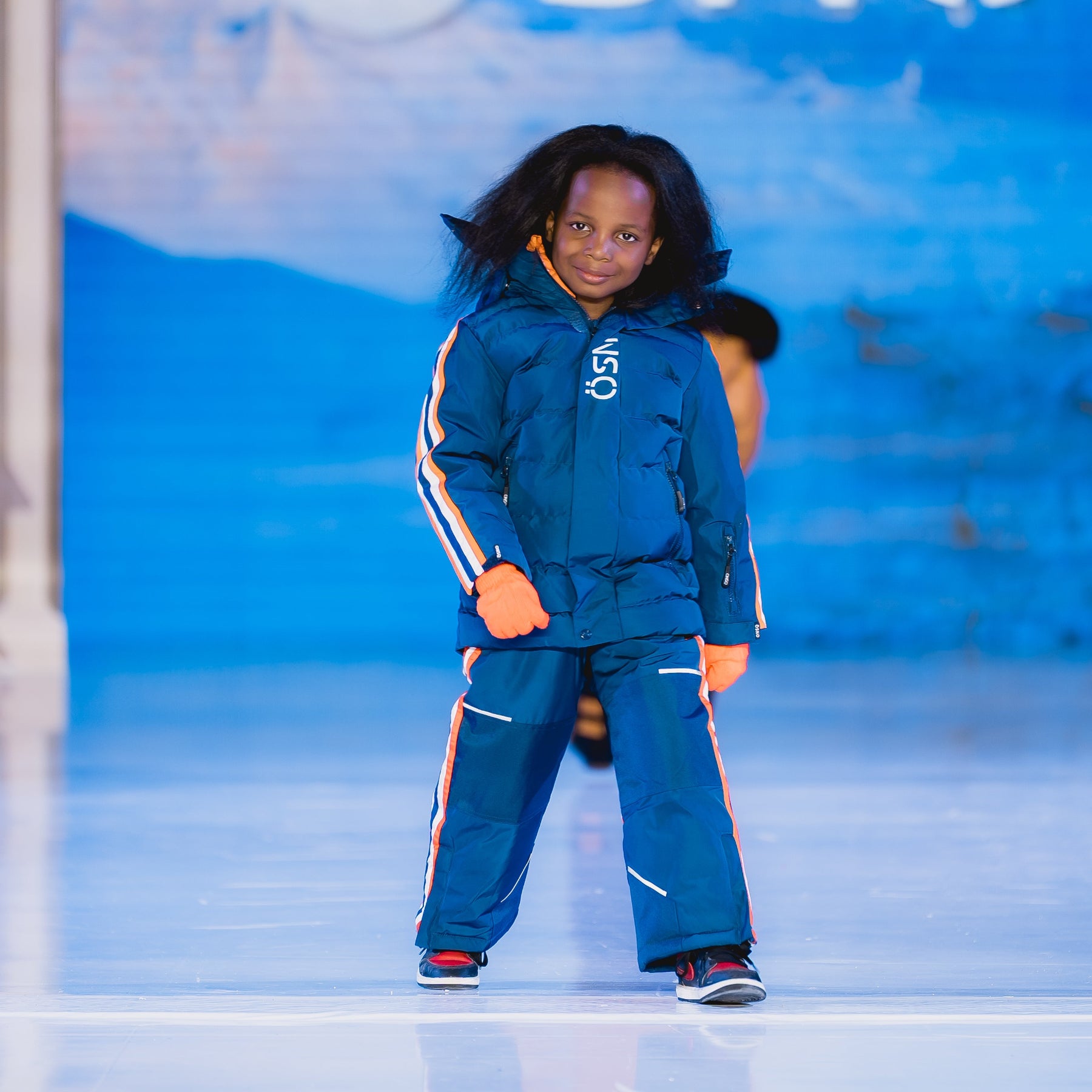 • Child wearing a blue winter coat with orange and white accents on a light gray background