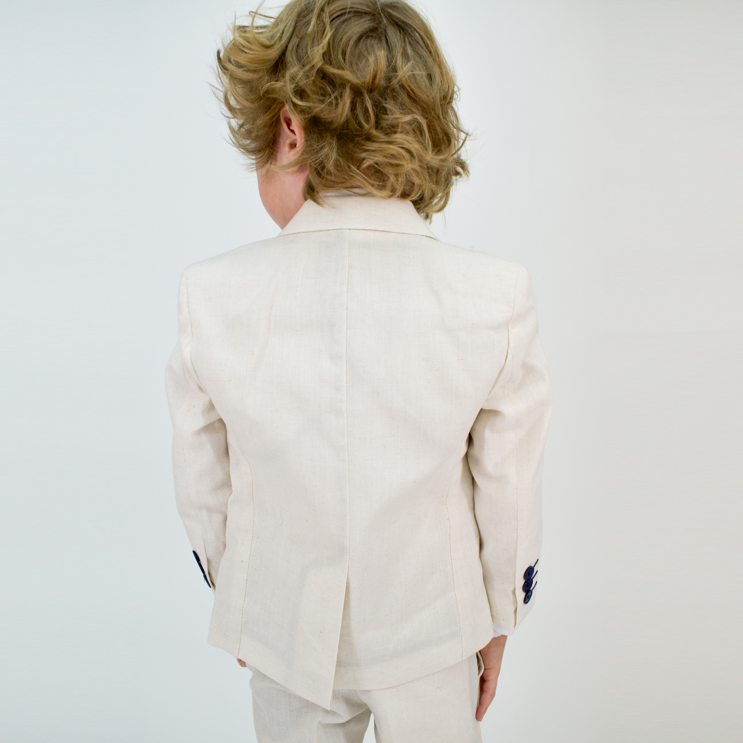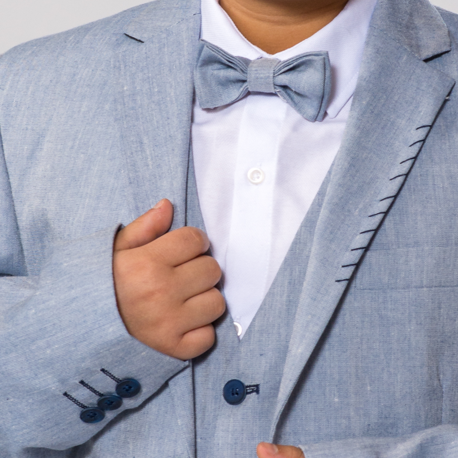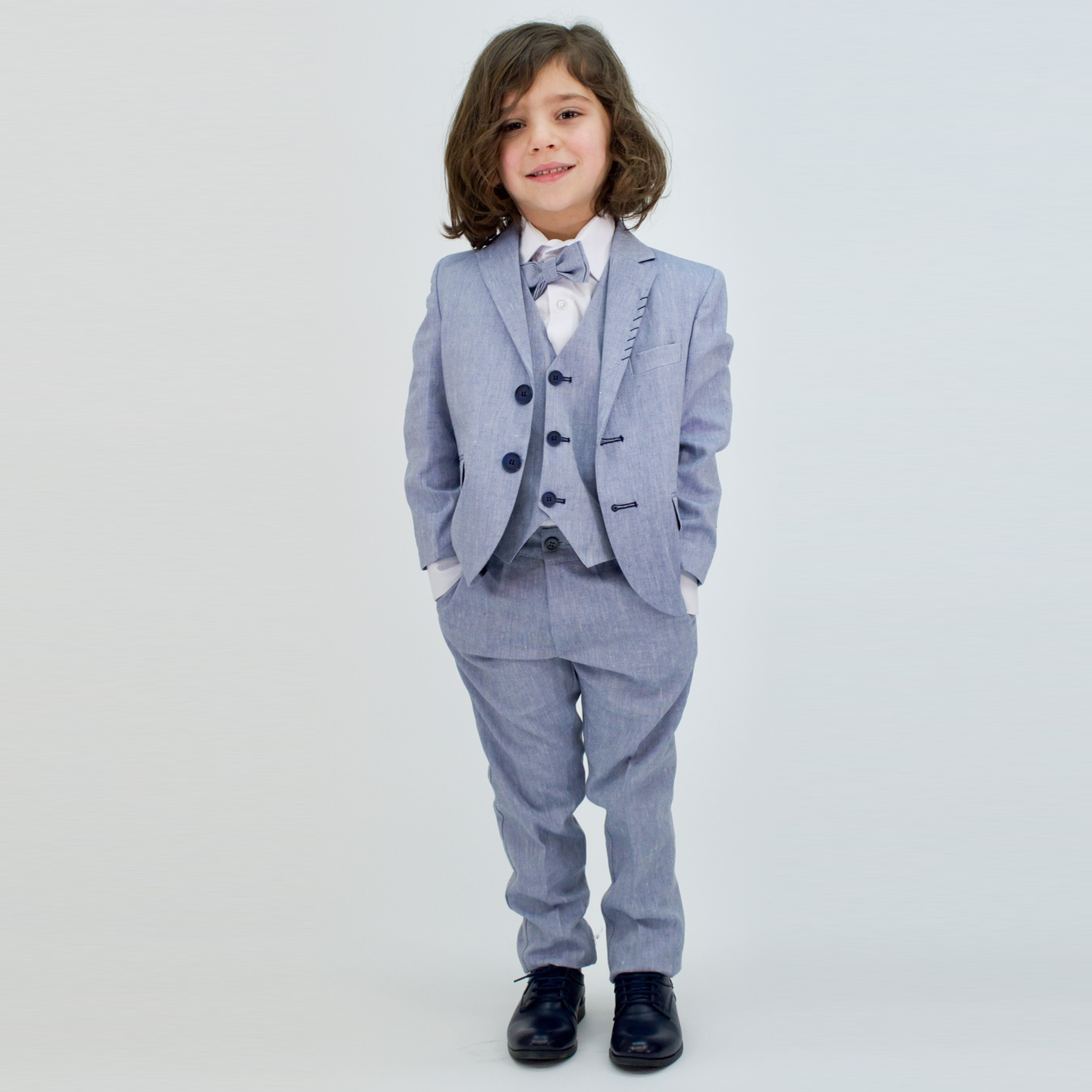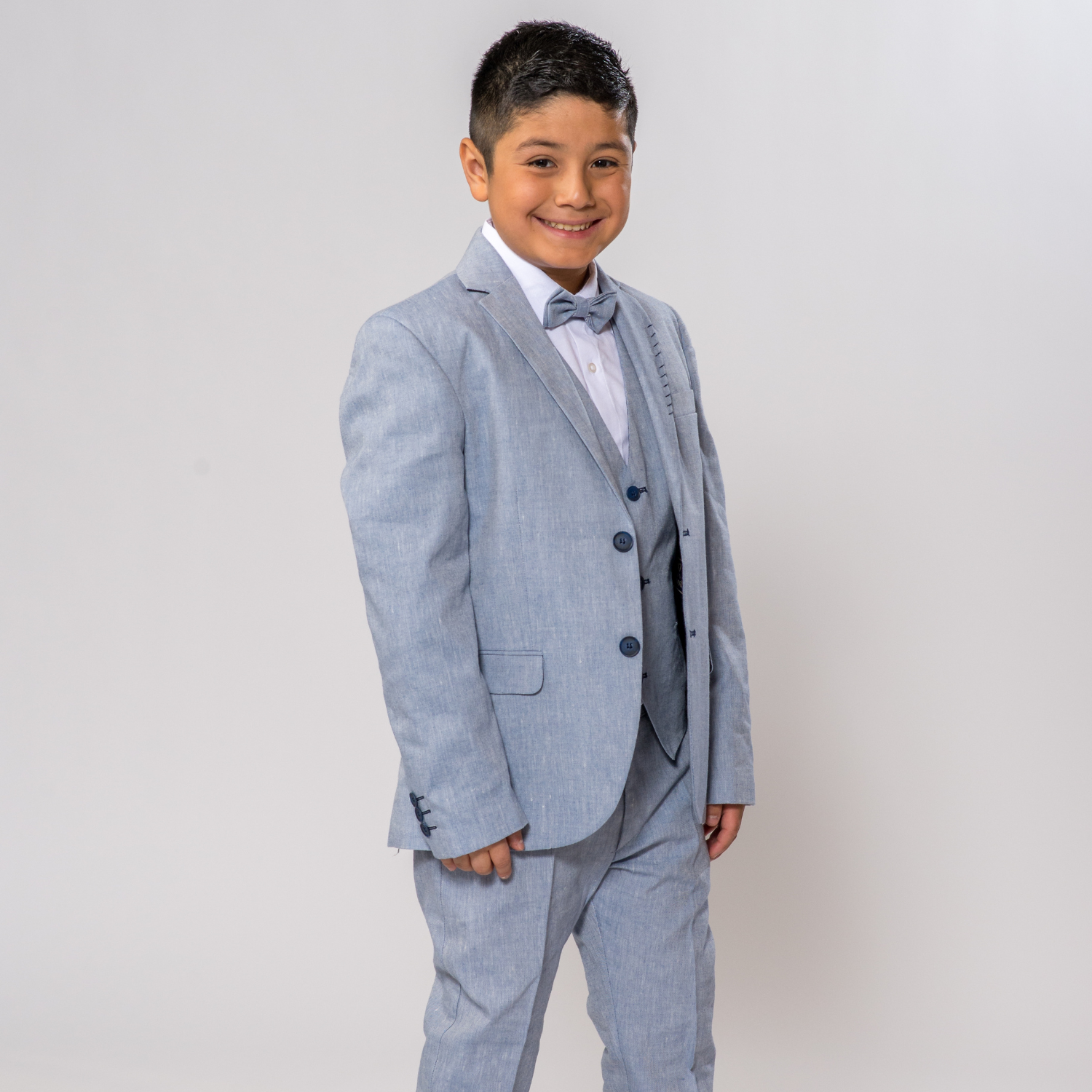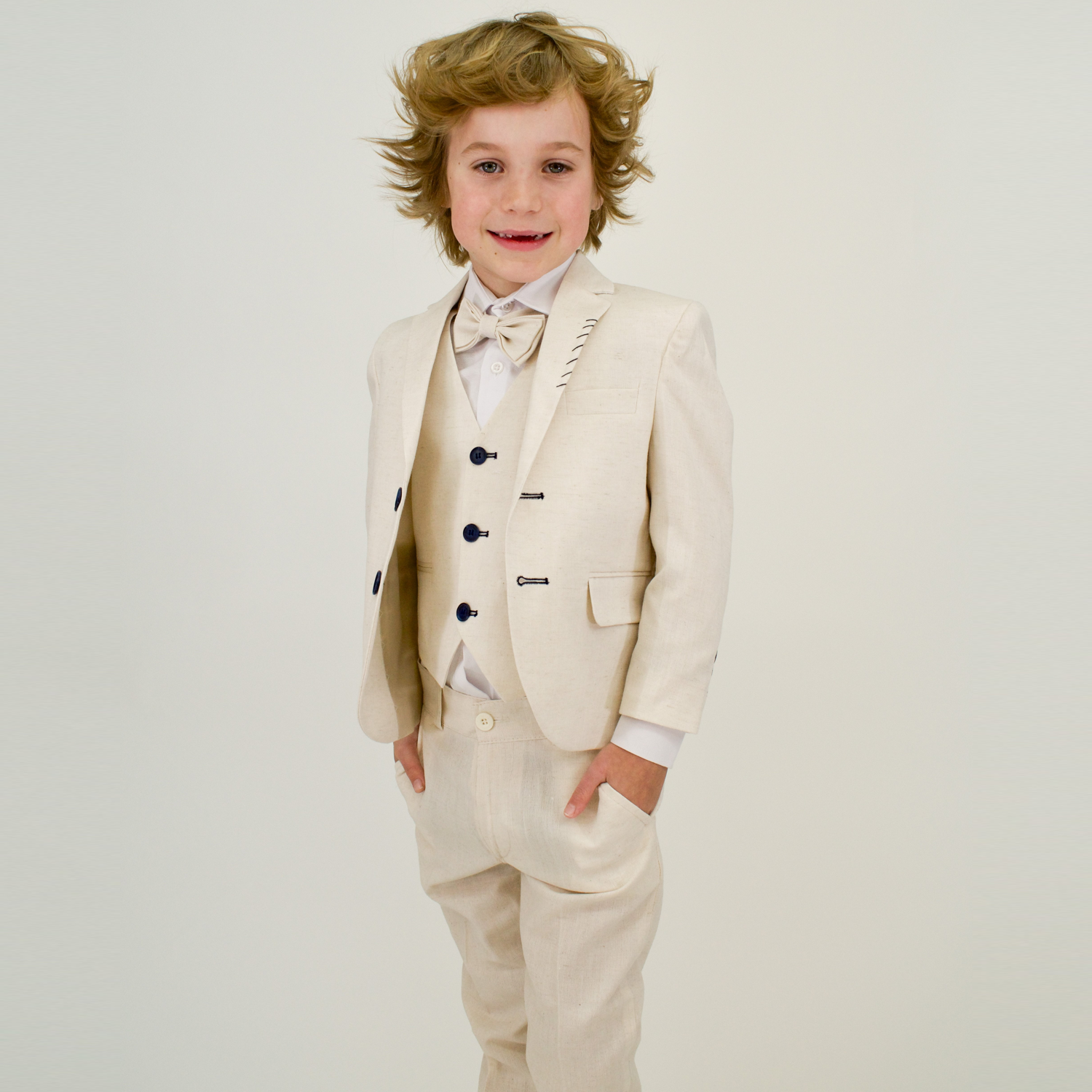 Un style très européen et un look exclusif pour JuniorKids, ce superbe costume en lin slim-fit comprend une veste (60 % lin, 20 % coton, 20 % viscose), un pantalon slim à taille ajustable (60 % lin, 20 % coton, 20 % viscose), un gilet à col en V (60 % lin, 20 % coton, 20 % viscose), une chemise skinny (80 % coton / 20 % polyester), et un nœud papillon pour parfaire le look.