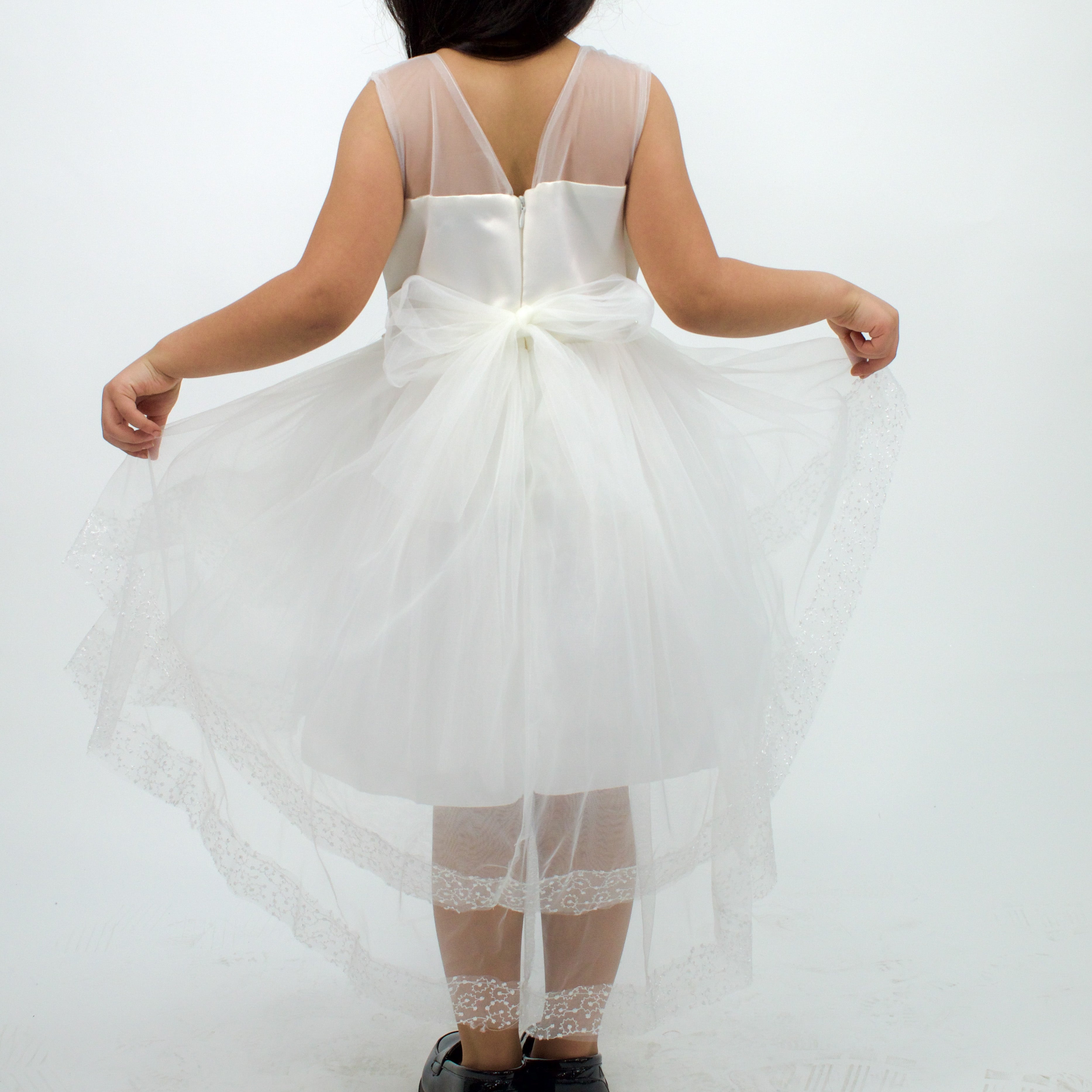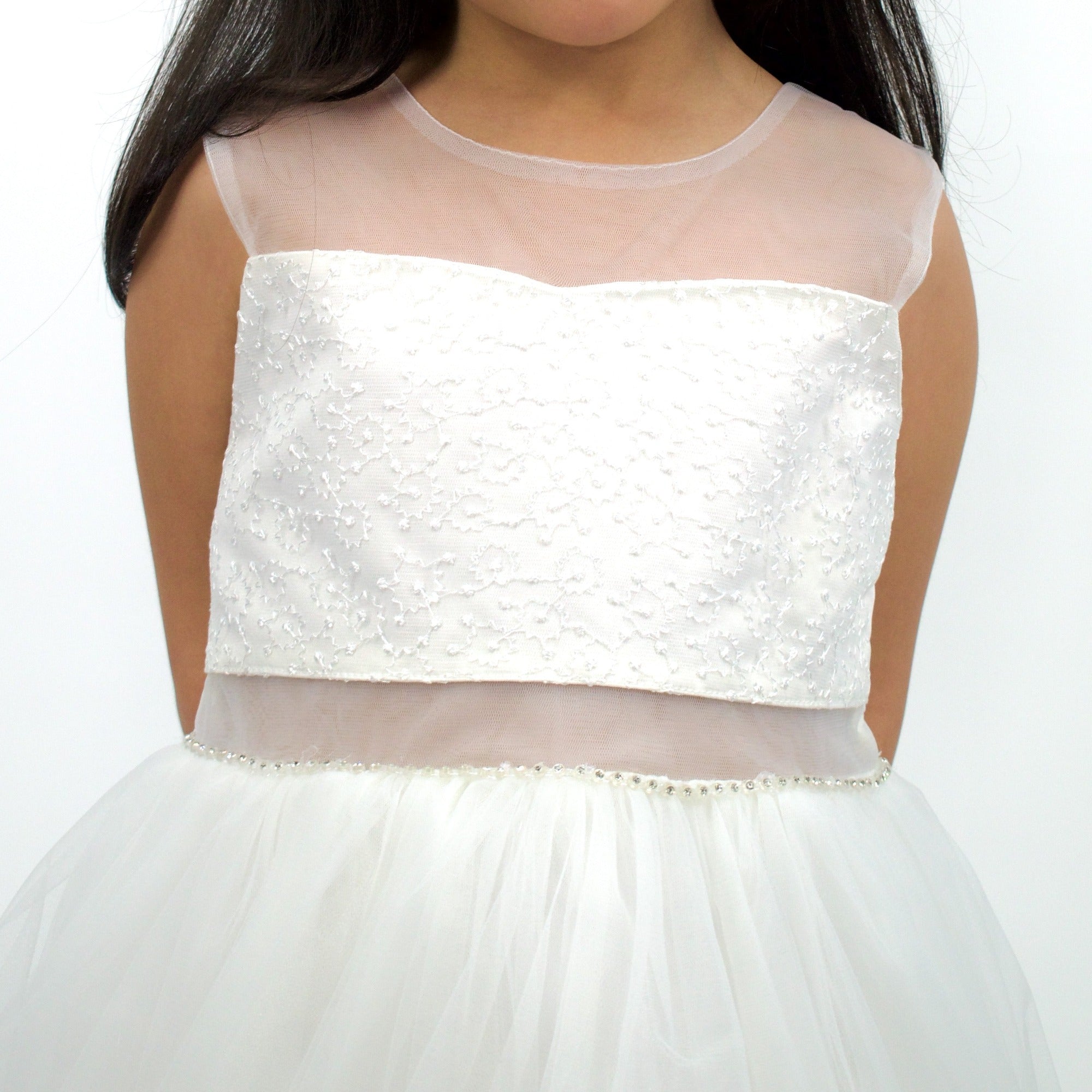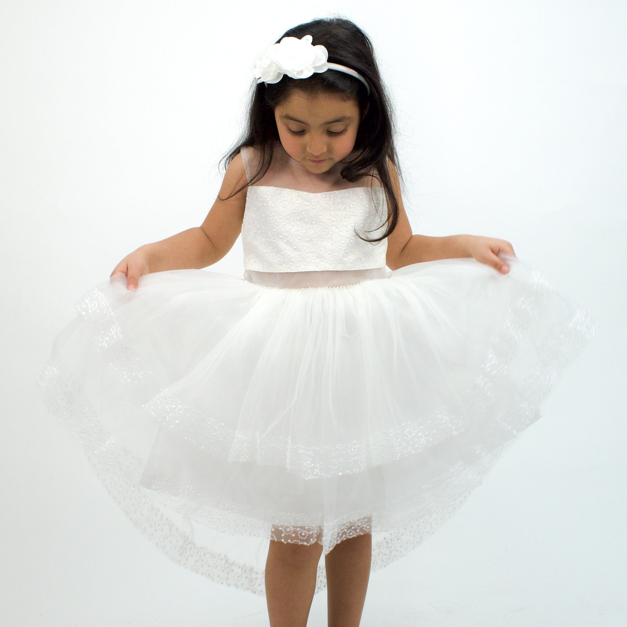 L'élégance à son paroxysme! Belle robe plissée en tulle brillant avec bordure en strass à la taille et bas à volants. Une exclusivité JuniorKids