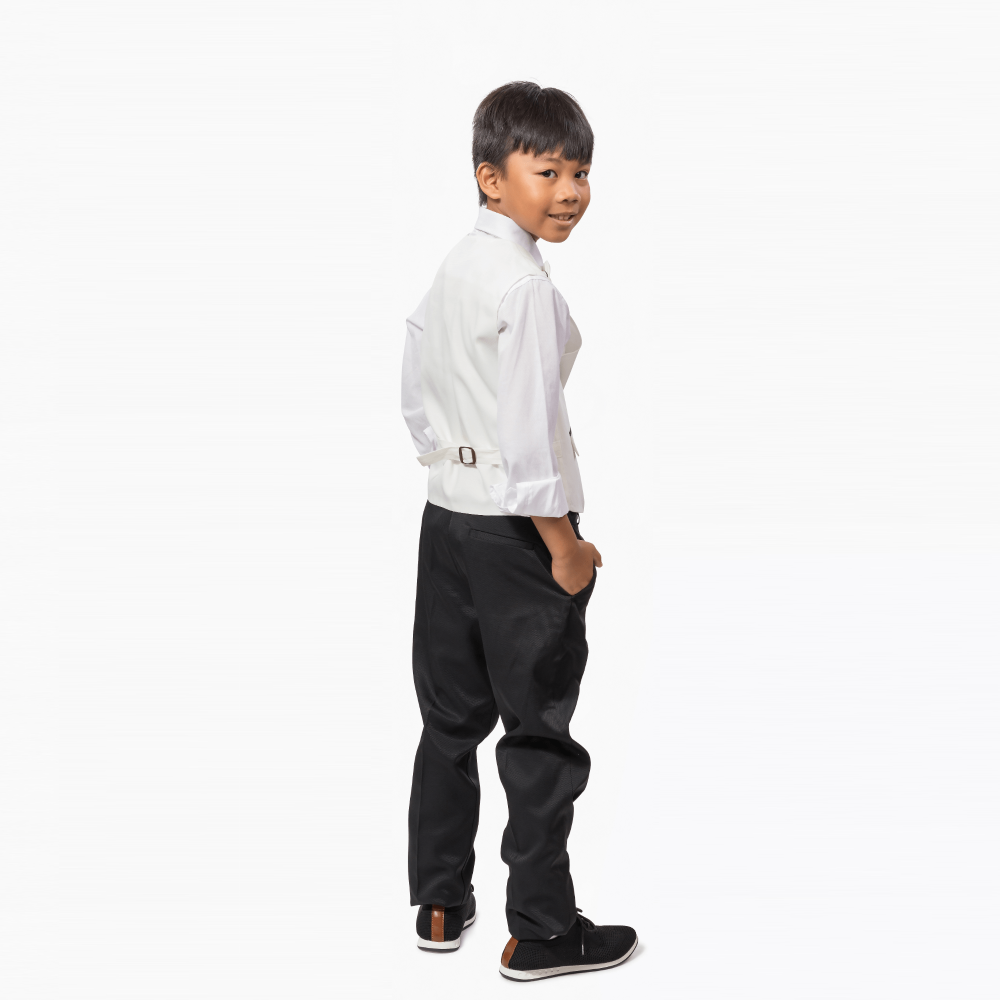 Cela porte le style de l'ensemble de gilets à un nouveau niveau. Ensemble de gilet élégant en coton tricoté comprenant un gilet à 3 poches, une chemise en coton Oxford et un pantalon en coton tricoté à taille ajustable et un nœud papillon assorti. Une véritable superstar en devenir!