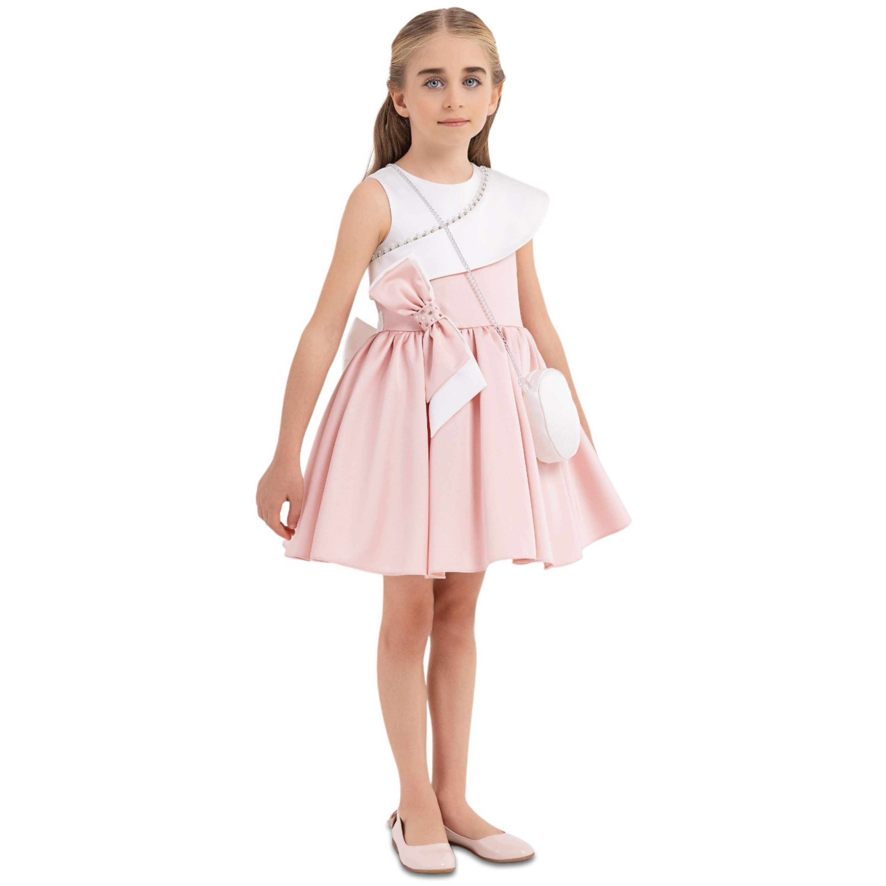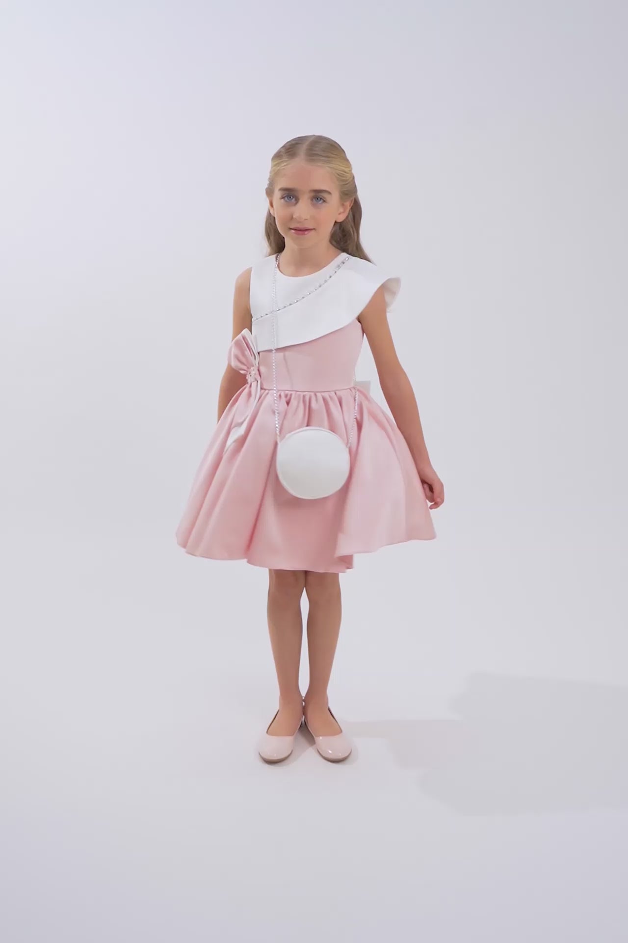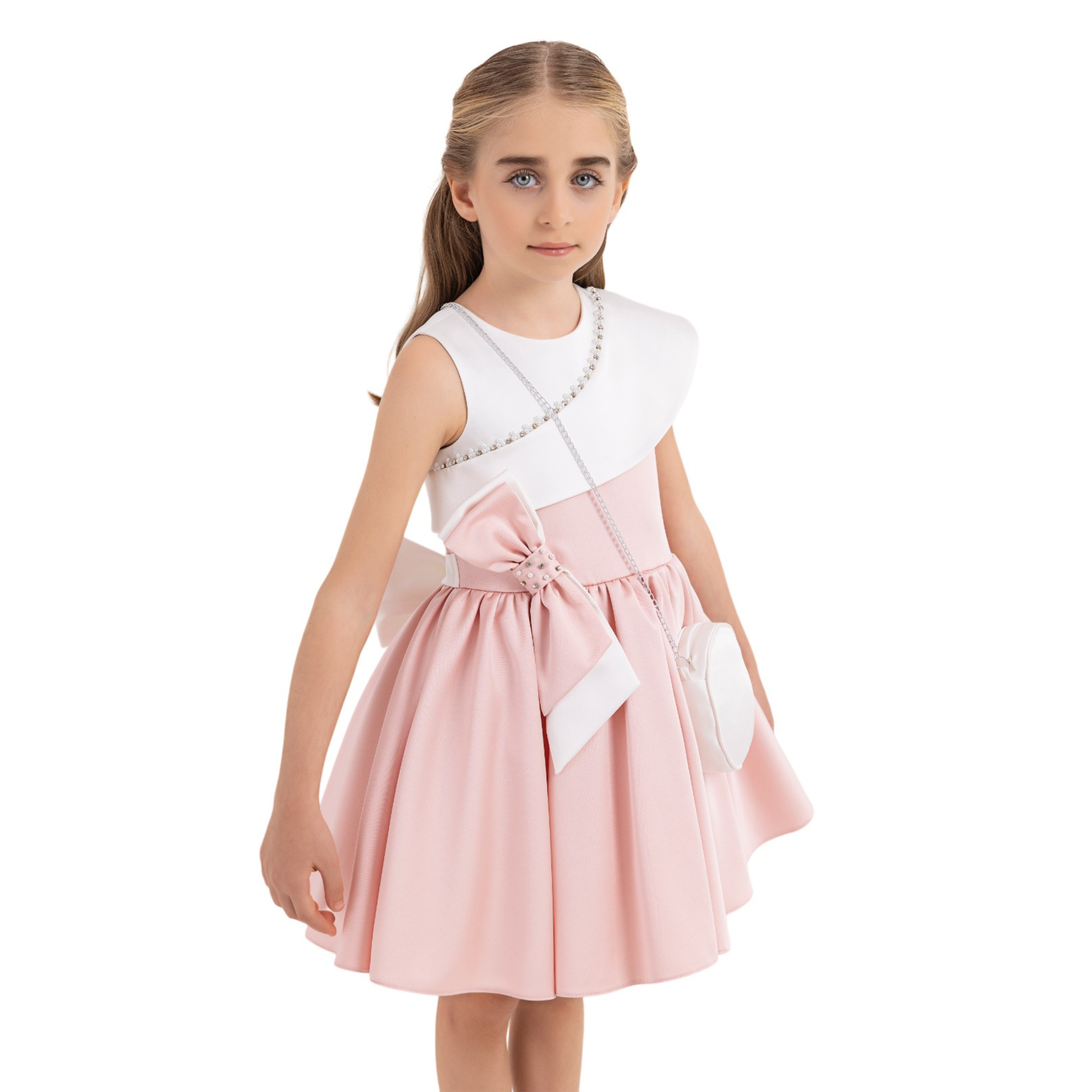 Rehaussez son élégance avec notre robe courte en satin pour filles. Ornée d'une délicate ligne de perles et de strass sur la poitrine, cette robe respire le charme intemporel. La silhouette évasée ajoute une touche de sophistication, tandis que le sac assorti complète le look, la rendant prête pour toute occasion spéciale.