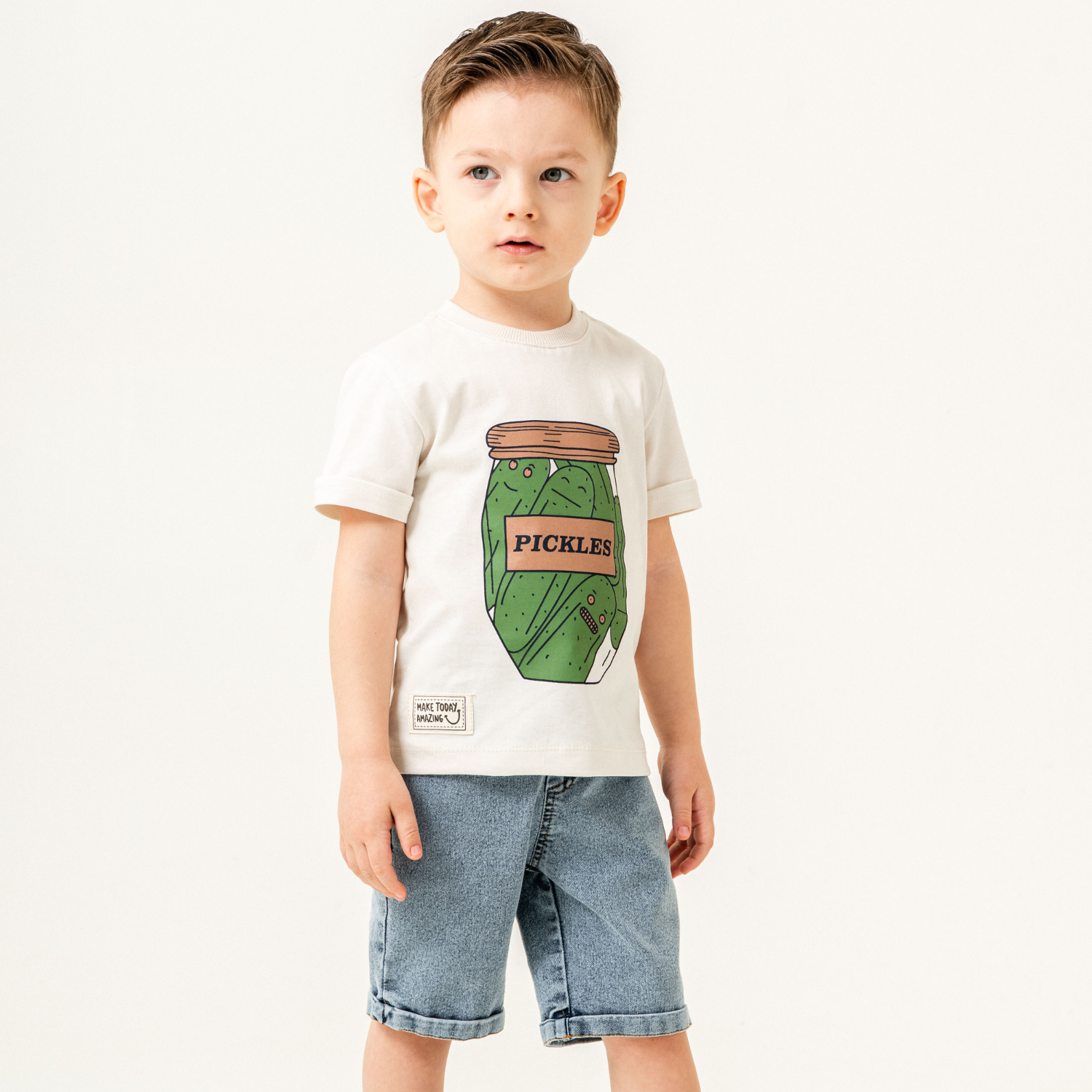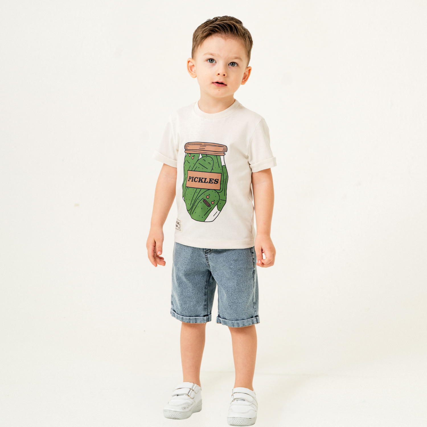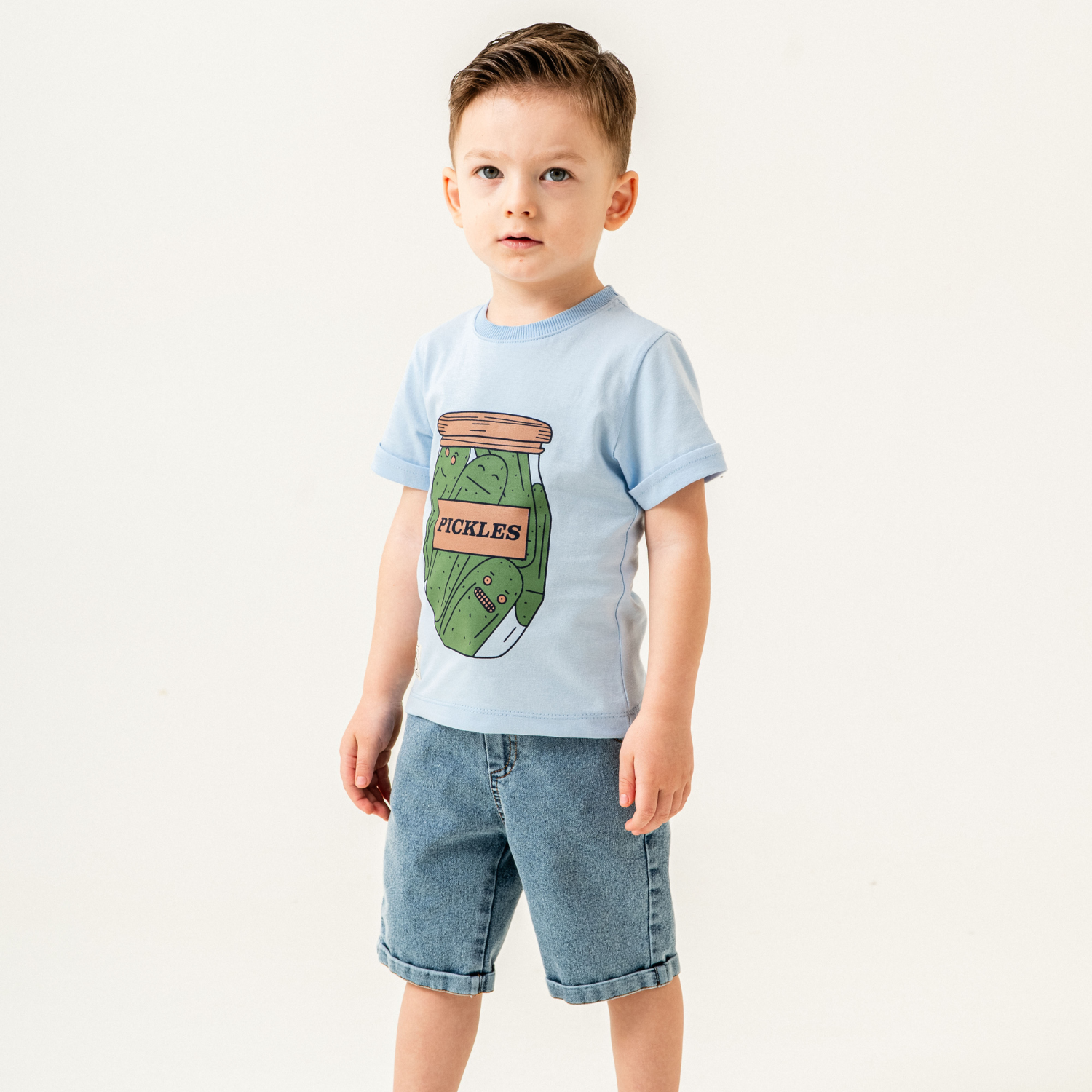 Préparez votre petit pour l'aventure avec cet ensemble amusant et stylé ! Le t-shirt en coton doux arbore un imprimé original de pot de cornichons, ajoutant une touche ludique à sa garde-robe. Assorti à un short en jean classique, cet ensemble allie confort et résistance pour toutes les activités du quotidien. Idéal pour les sorties décontractées, les jeux et les journées ensoleillées !