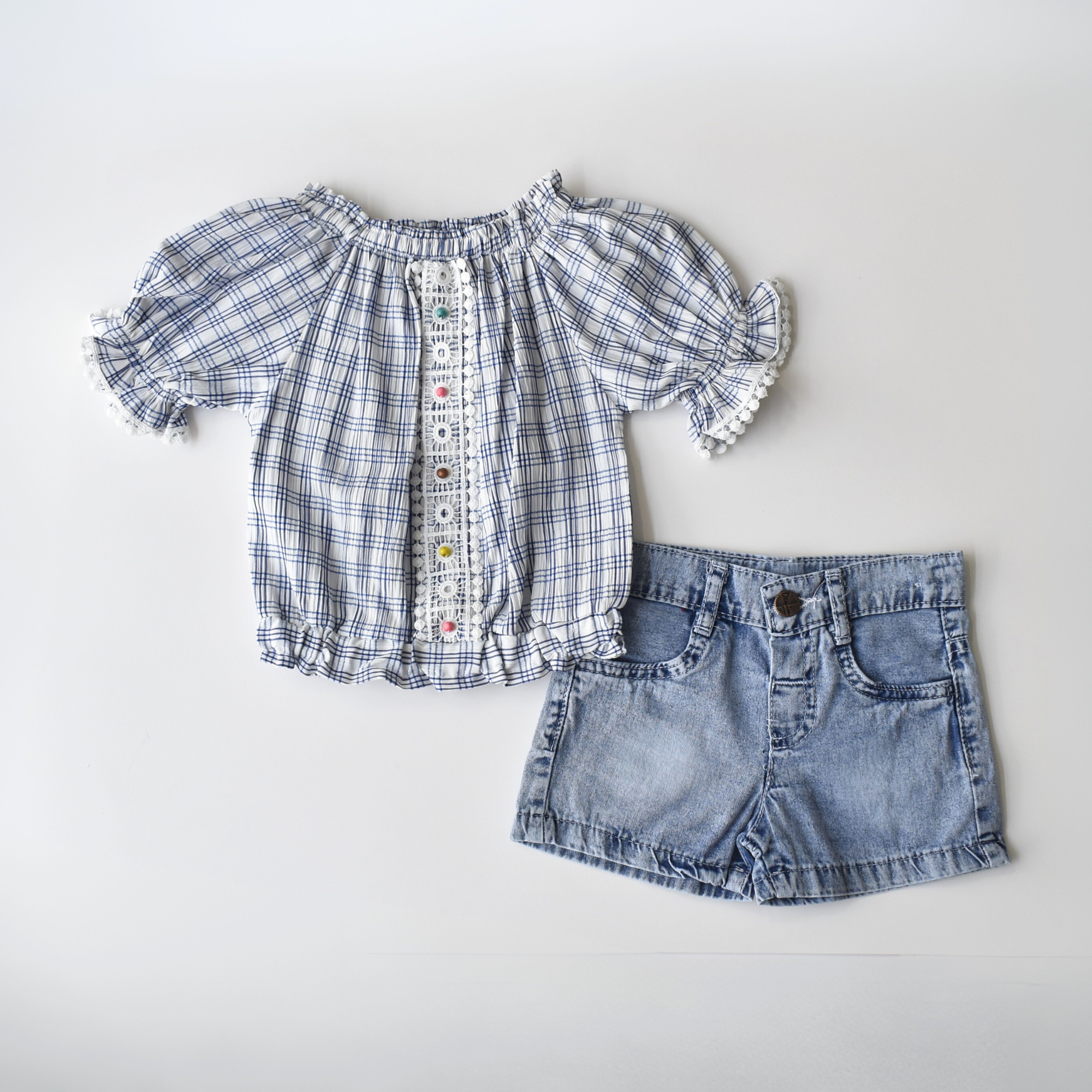 Habillez votre petite avec style grâce à cet ensemble blouse à motifs carrés et short en denim pour filles. Composé d'une blouse respirante aux motifs modernes et d'un short en jean intemporel, cet ensemble est idéal pour les sorties décontractées, les jeux ou les aventures estivales. Le tissu léger assure un confort optimal, tandis que le design tendance ajoute une touche de charme.