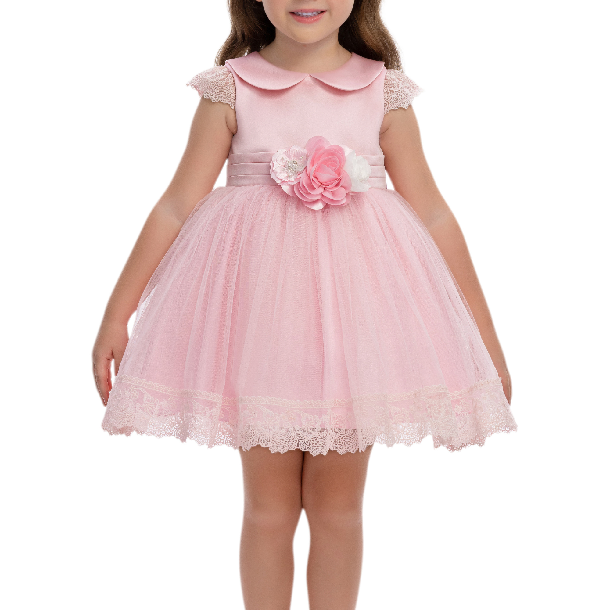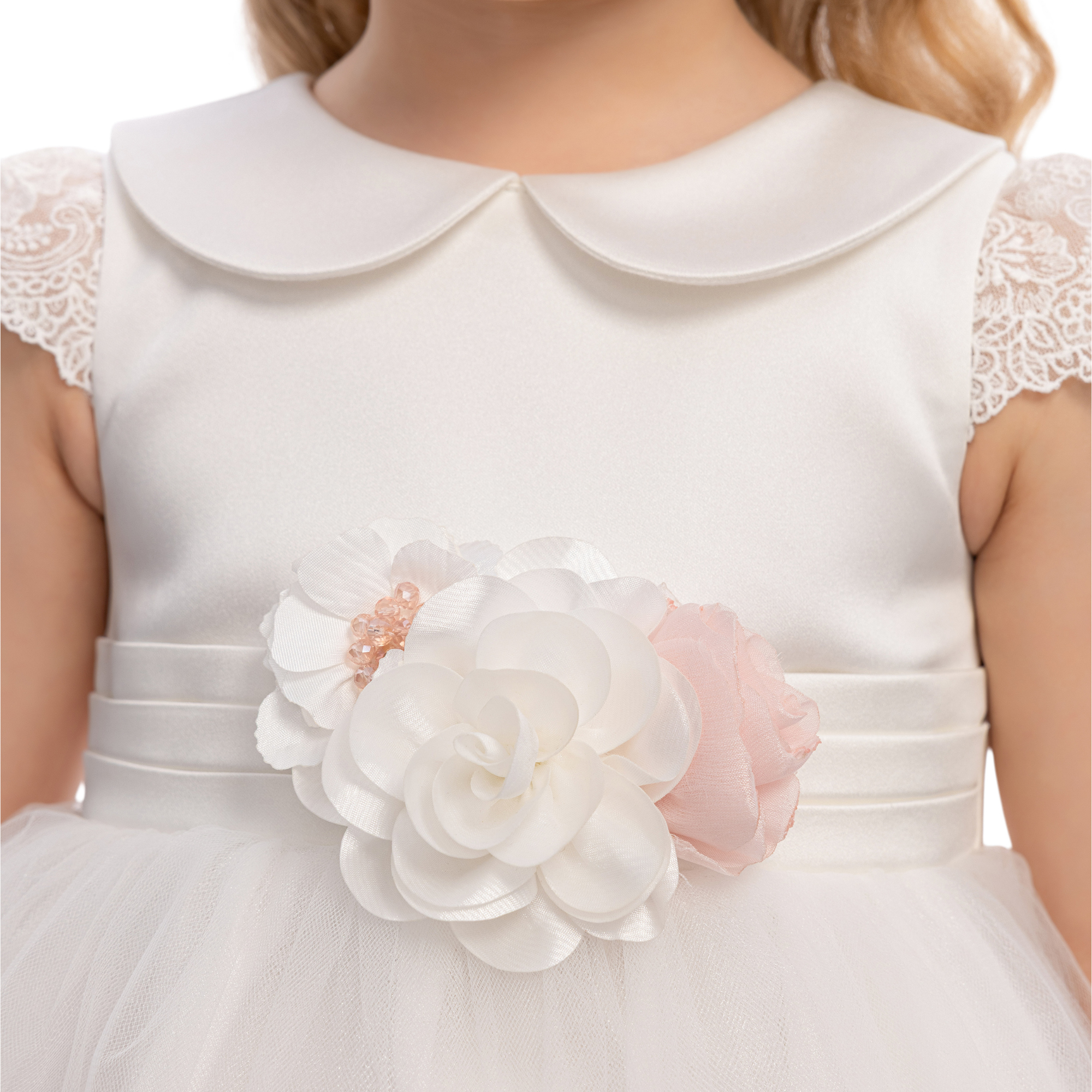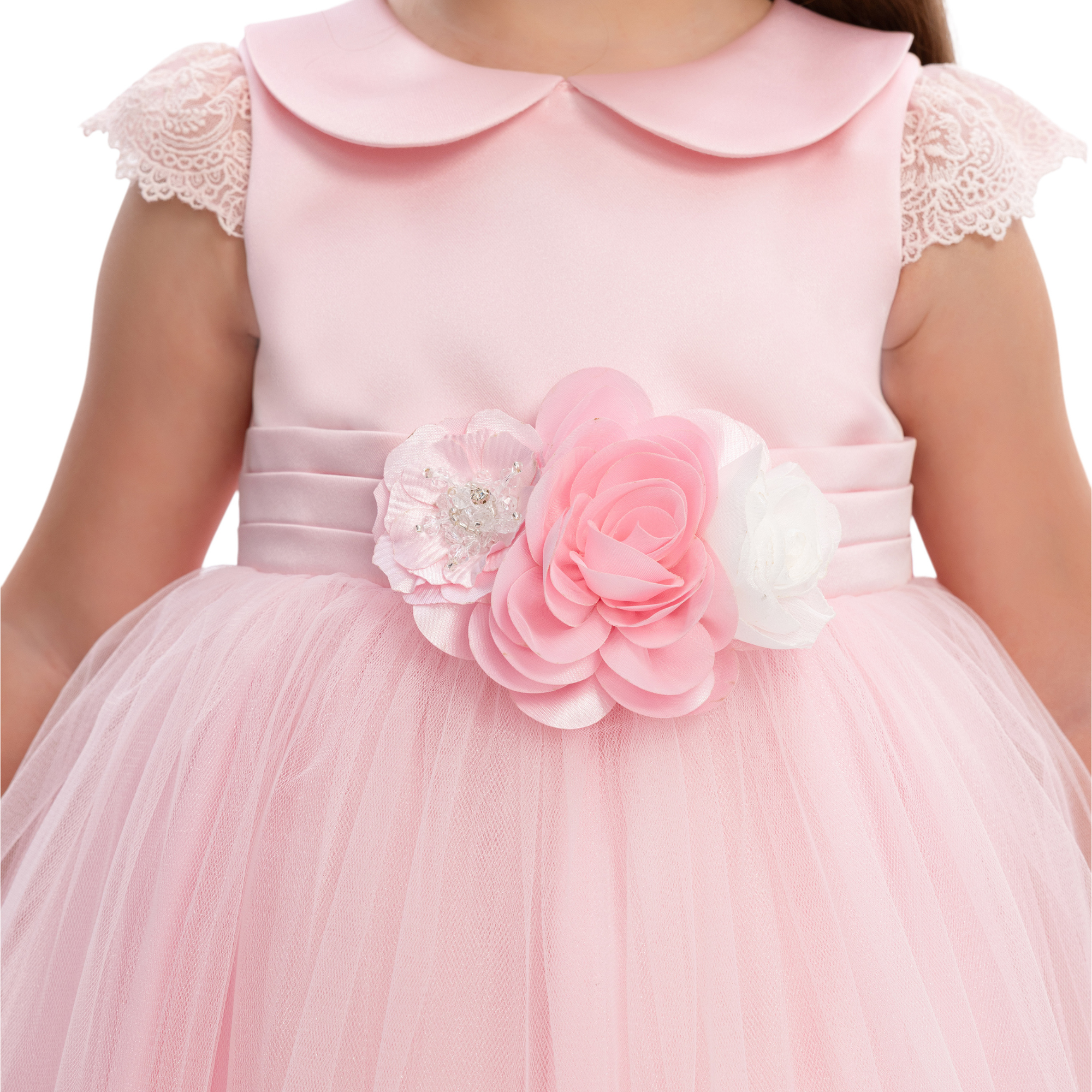 This elegant girls’ dress is designed to capture timeless charm with a soft, modern touch. Crafted in a delicate powder pink jacquard fabric, it features a subtle textured pattern that adds depth and refinement. The classic Peter Pan collar and cap sleeves create a graceful silhouette, perfect for special occasions.