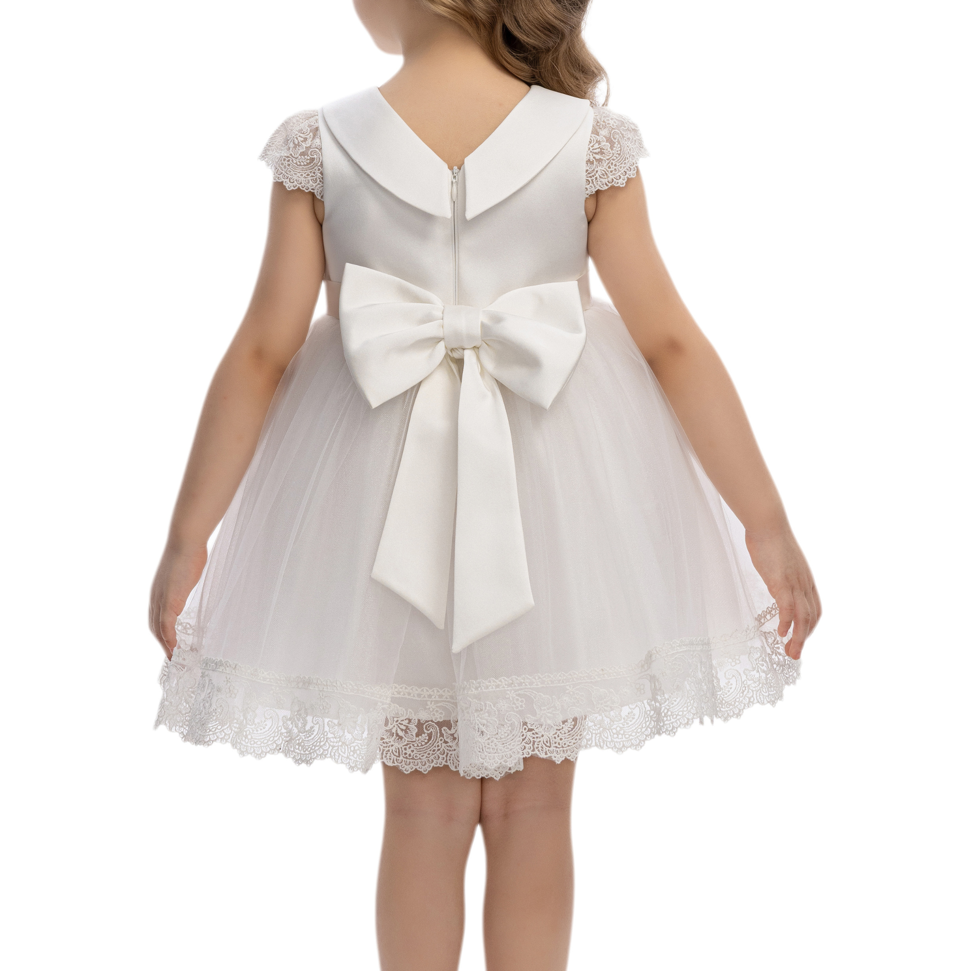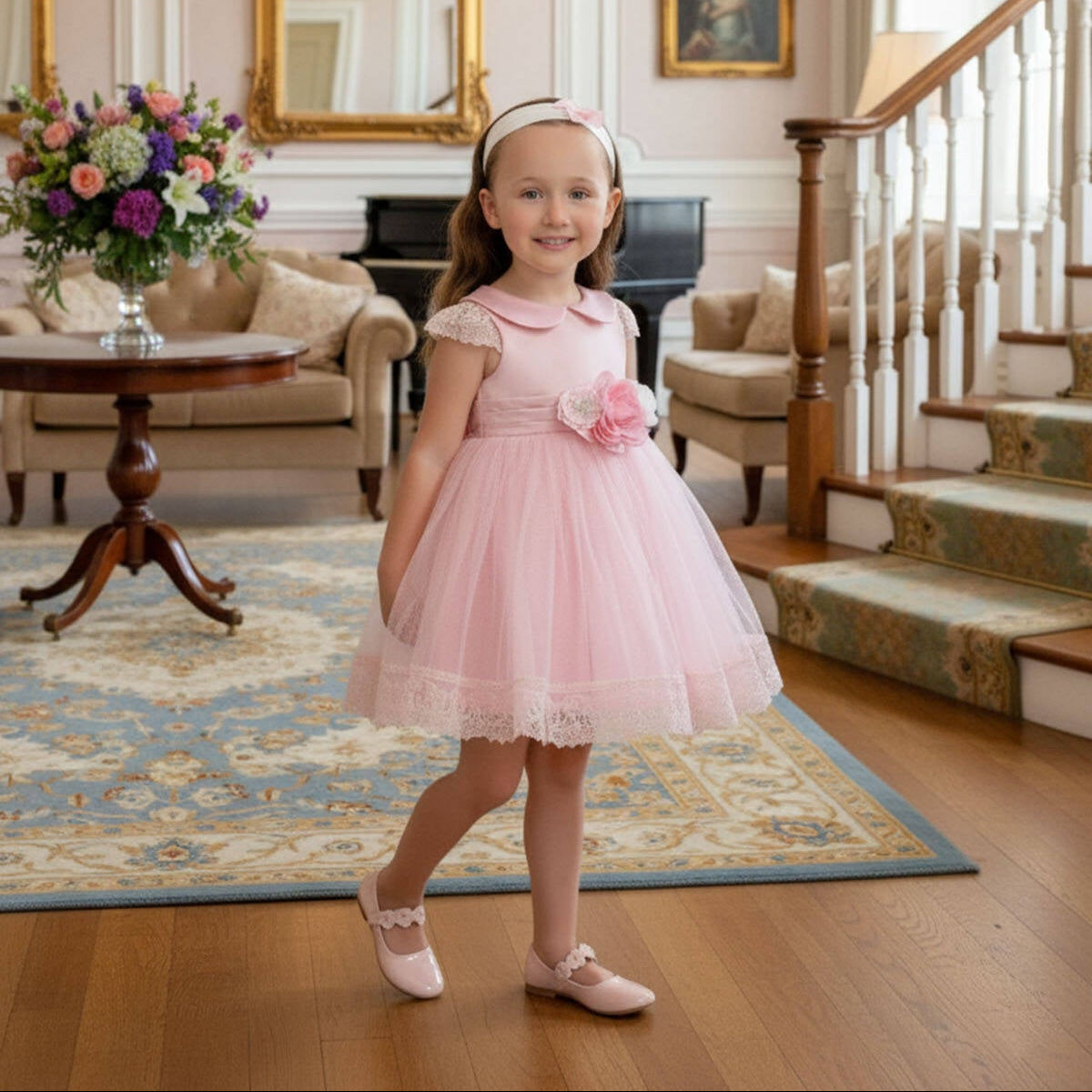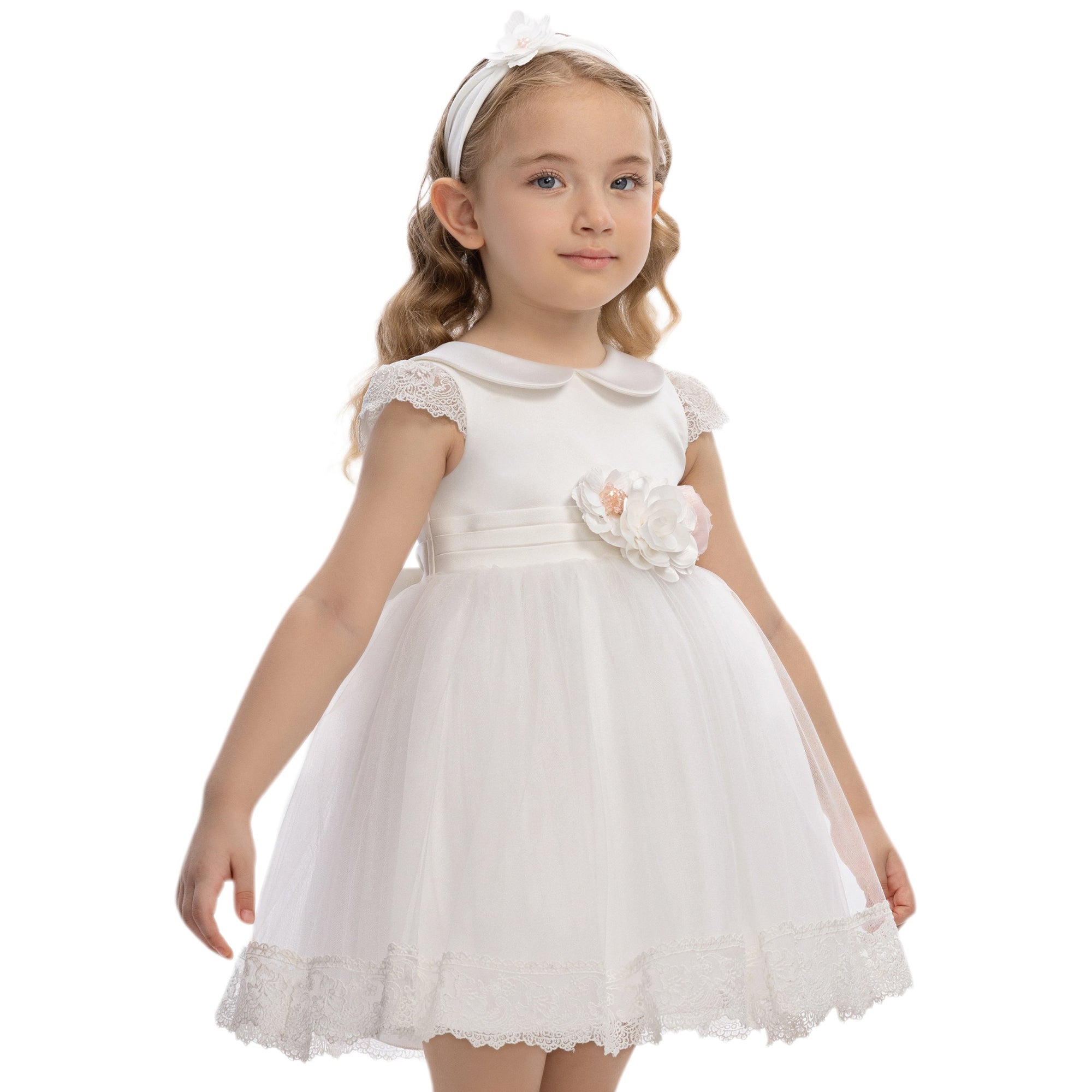 This elegant girls’ dress is designed to capture timeless charm with a soft, modern touch. Crafted in a delicate powder pink jacquard fabric, it features a subtle textured pattern that adds depth and refinement. The classic Peter Pan collar and cap sleeves create a graceful silhouette, perfect for special occasions.