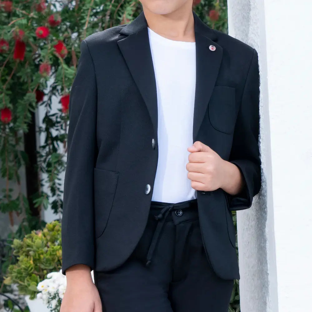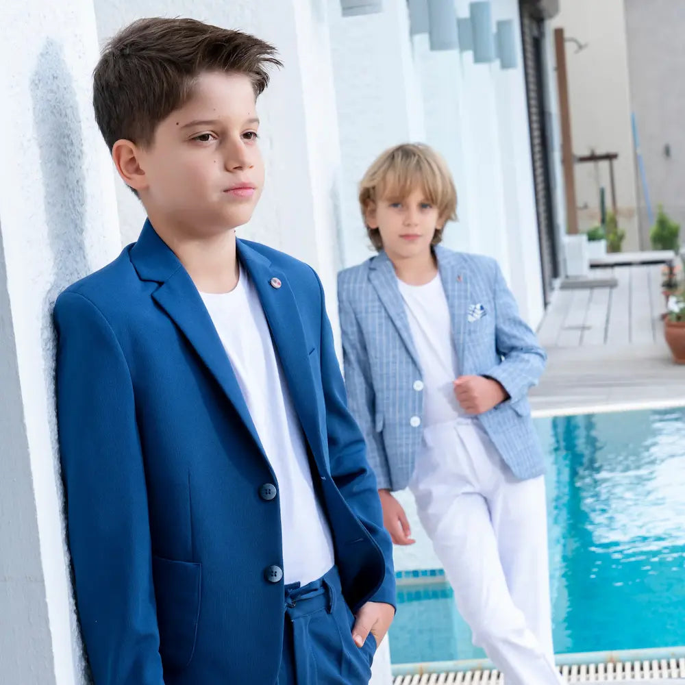 Un style très européen et un look exclusif JuniorKids, l’ensemble comprend une blazer, un pantalon slim ajusté à la taille, un t-shirt 100% coton de haute qualité et une belle épinglette.