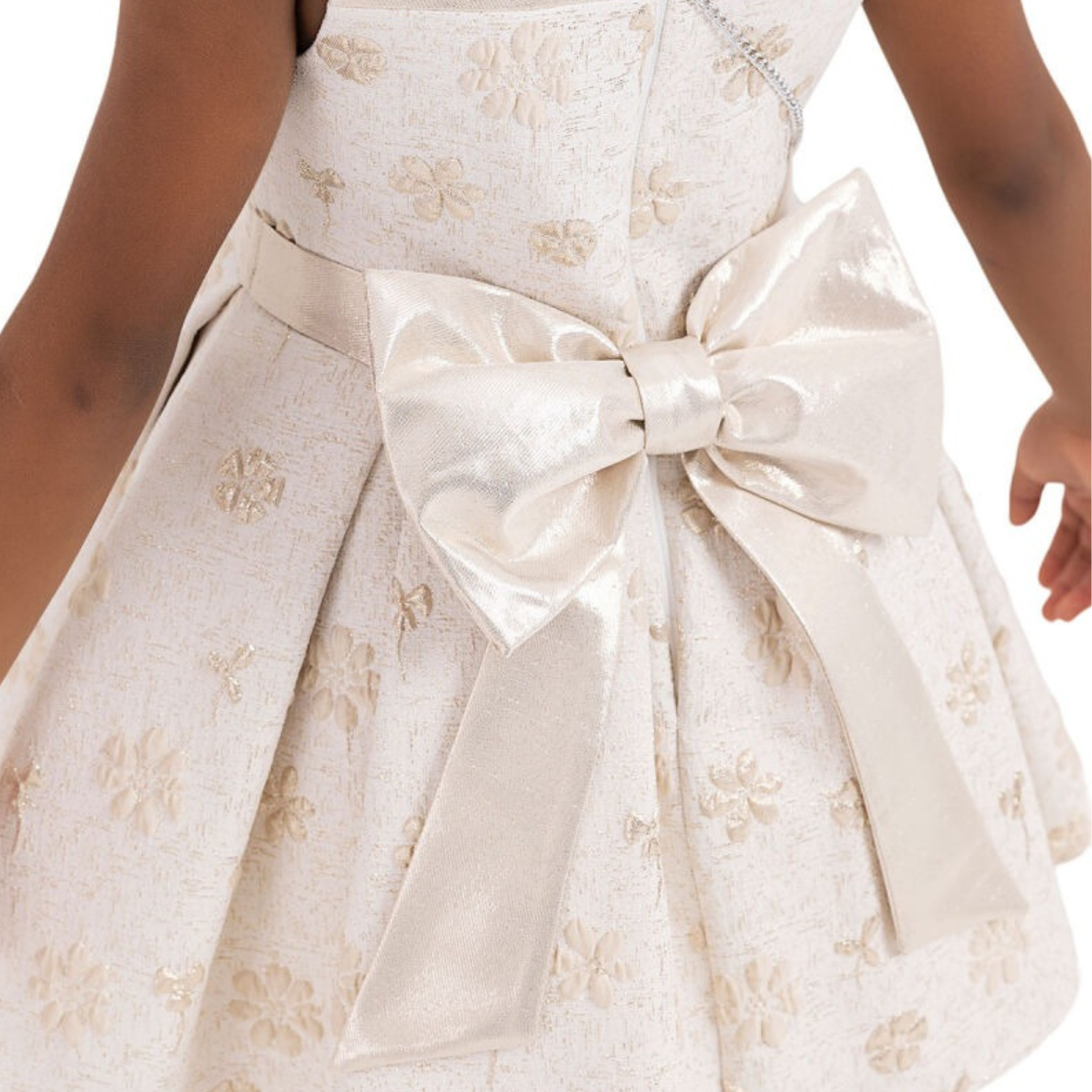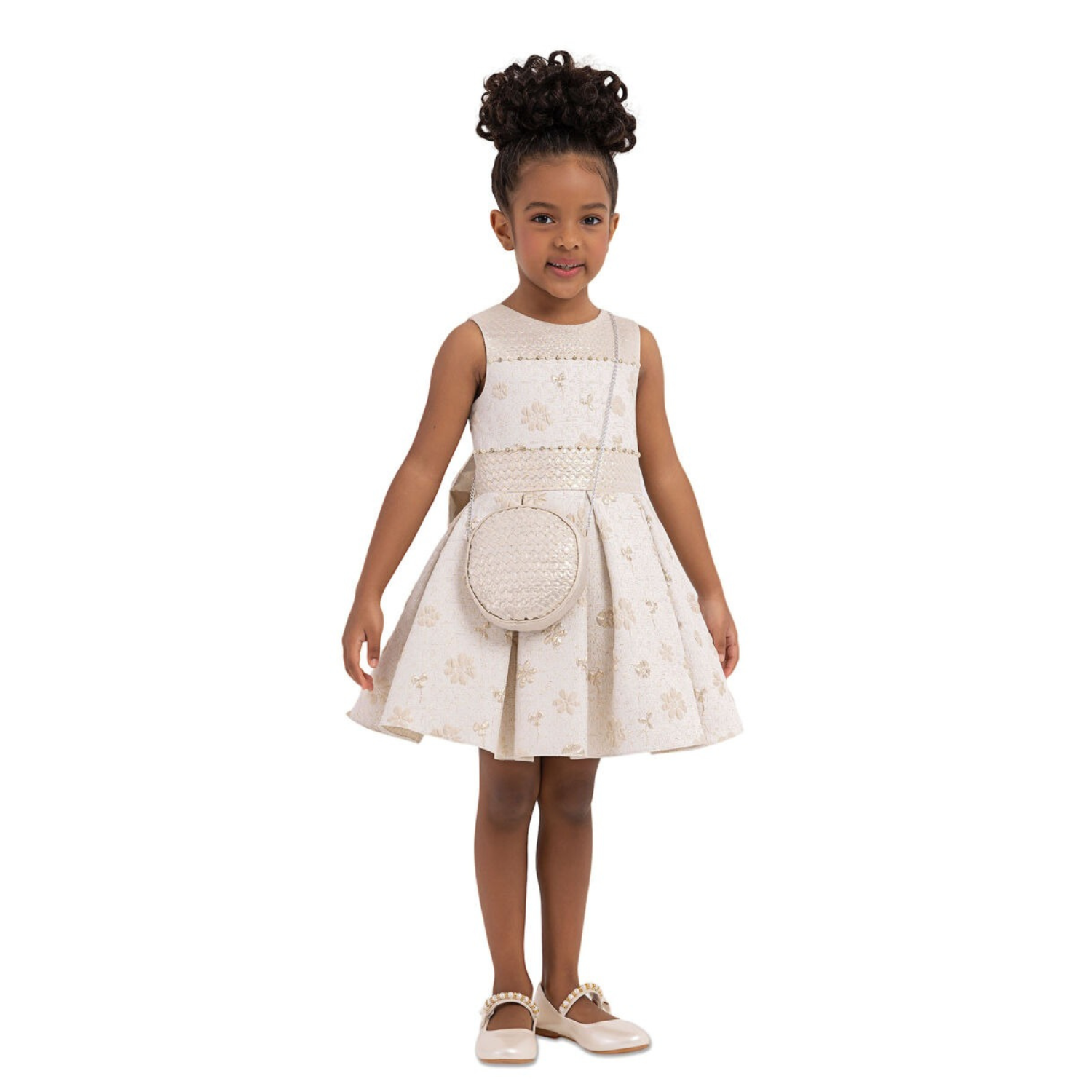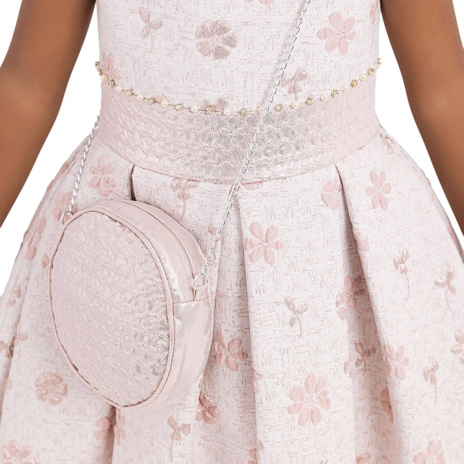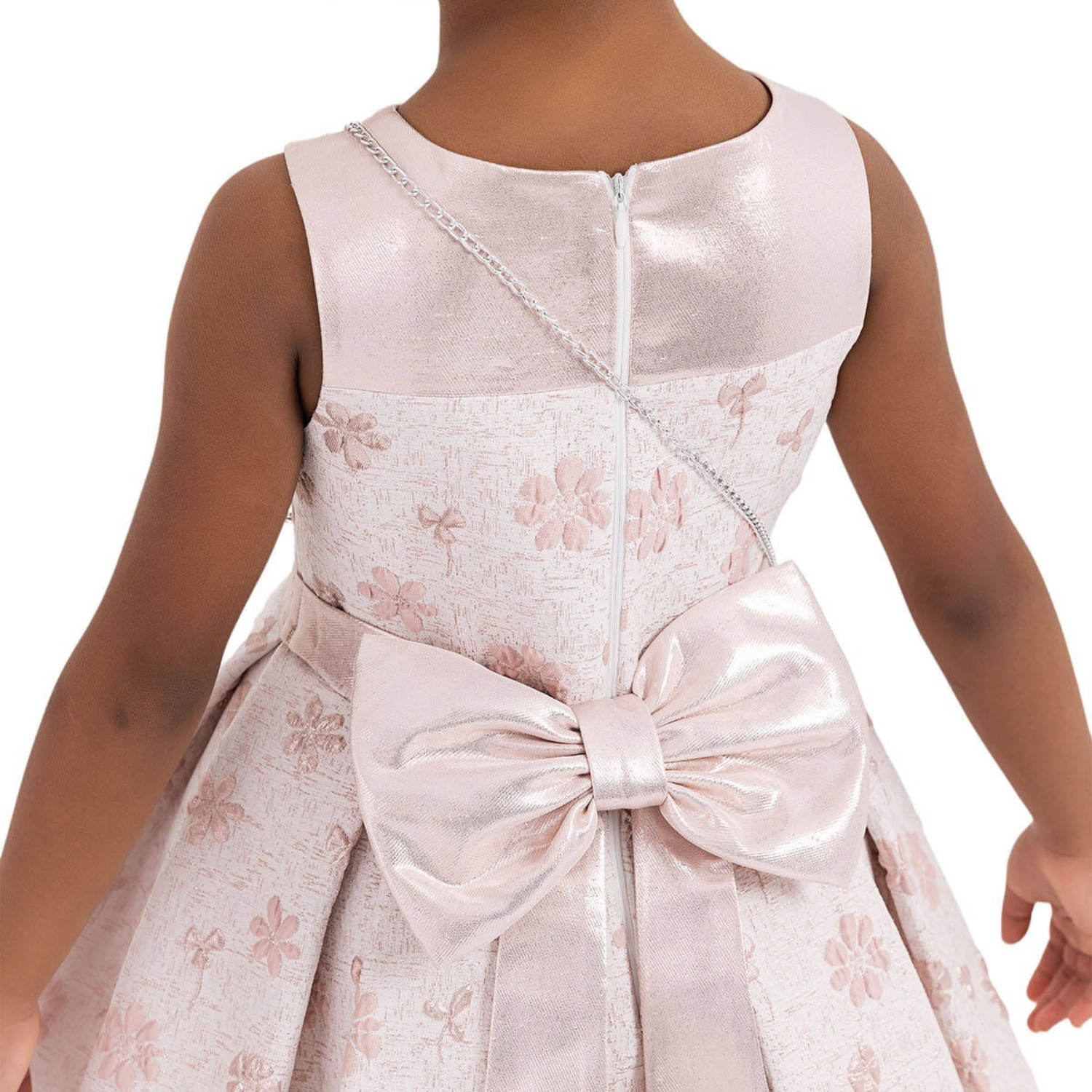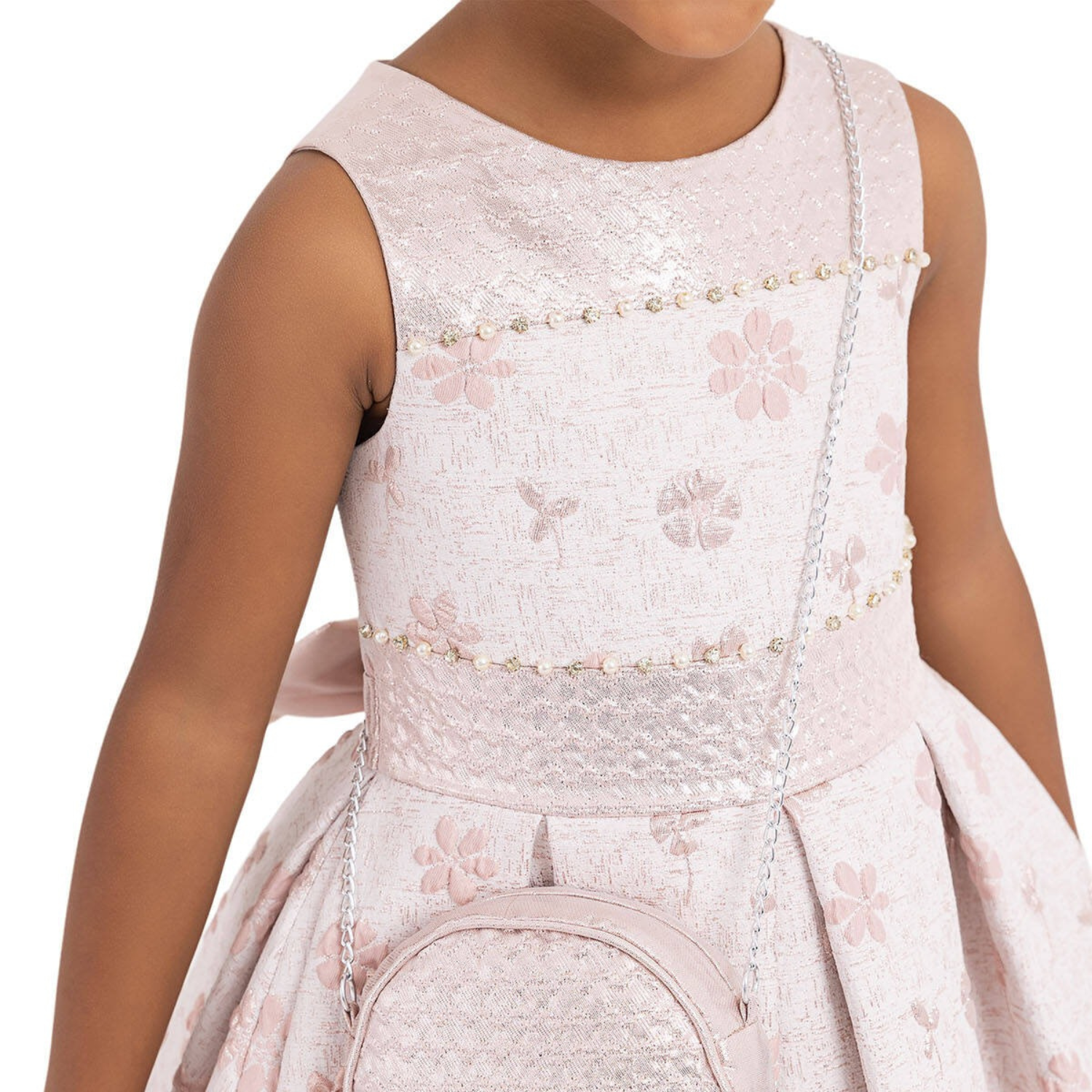 Elegant and charming, this sleeveless dress is perfect for special occasions. Crafted with a soft cotton lining for comfort, it features a shimmering jacquard fabric with a delicate floral pattern. The bodice is beautifully adorned with pearl and stone embroidery, adding a touch of sophistication. A stylish bow and matching bag complete the look, making this dress a must-have for any little fashionista.