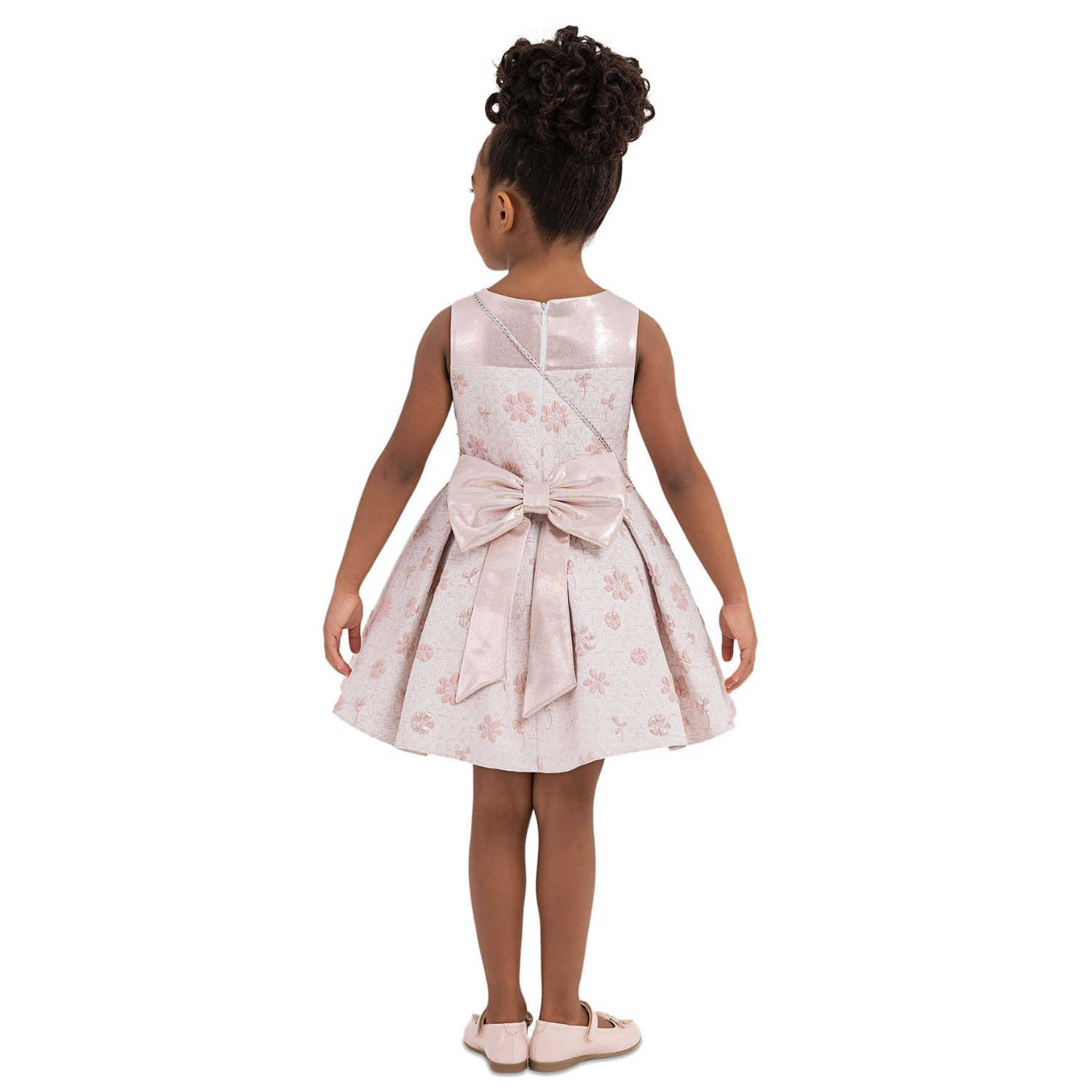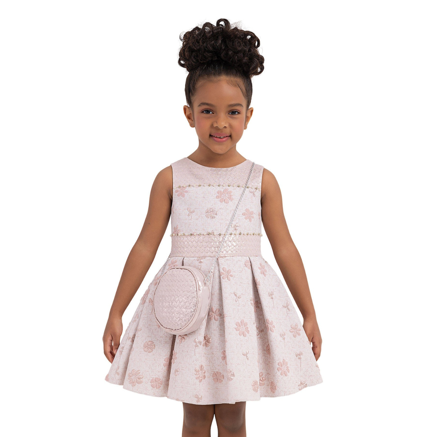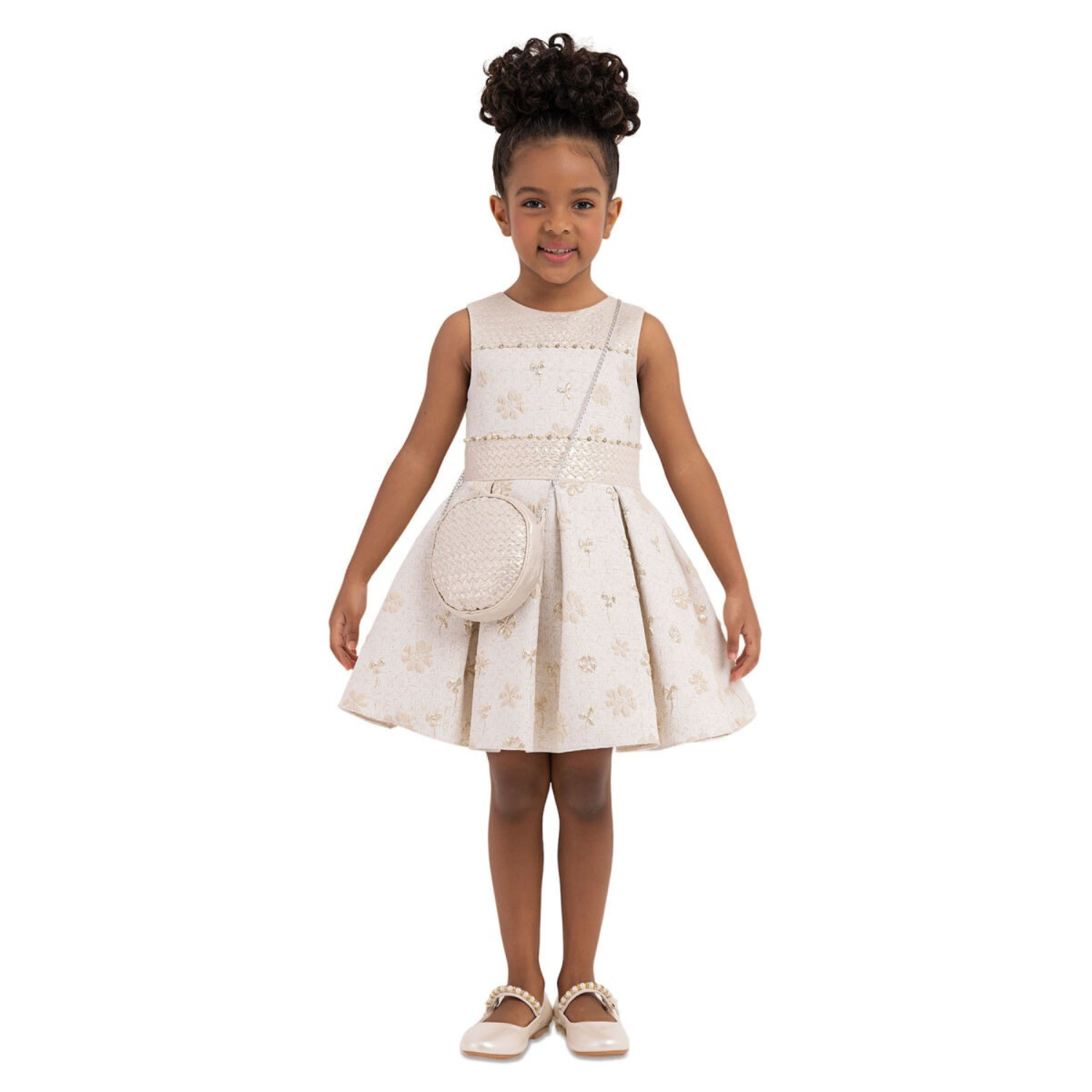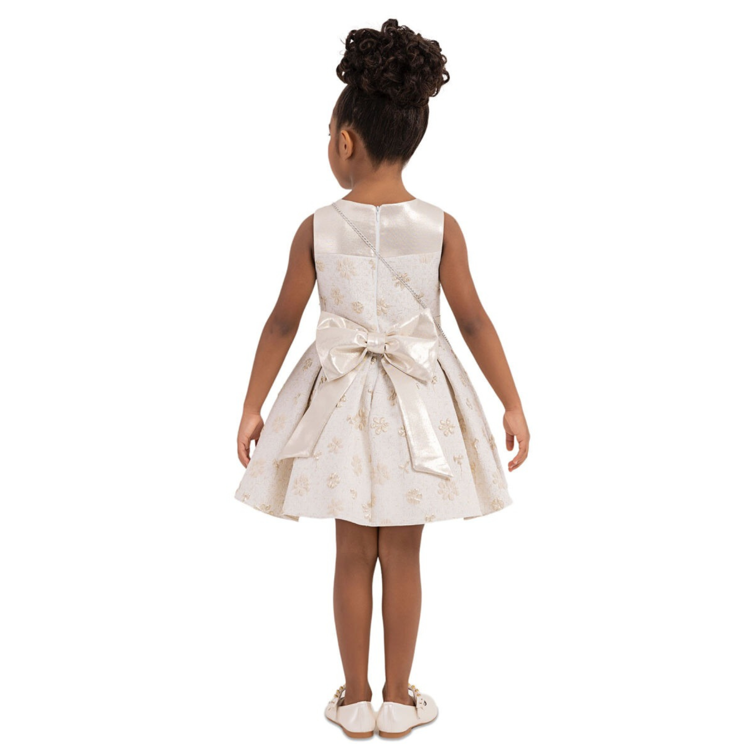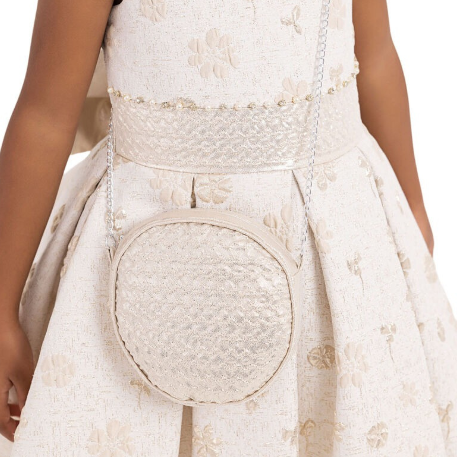 Elegant and charming, this sleeveless dress is perfect for special occasions. Crafted with a soft cotton lining for comfort, it features a shimmering jacquard fabric with a delicate floral pattern. The bodice is beautifully adorned with pearl and stone embroidery, adding a touch of sophistication. A stylish bow and matching bag complete the look, making this dress a must-have for any little fashionista.