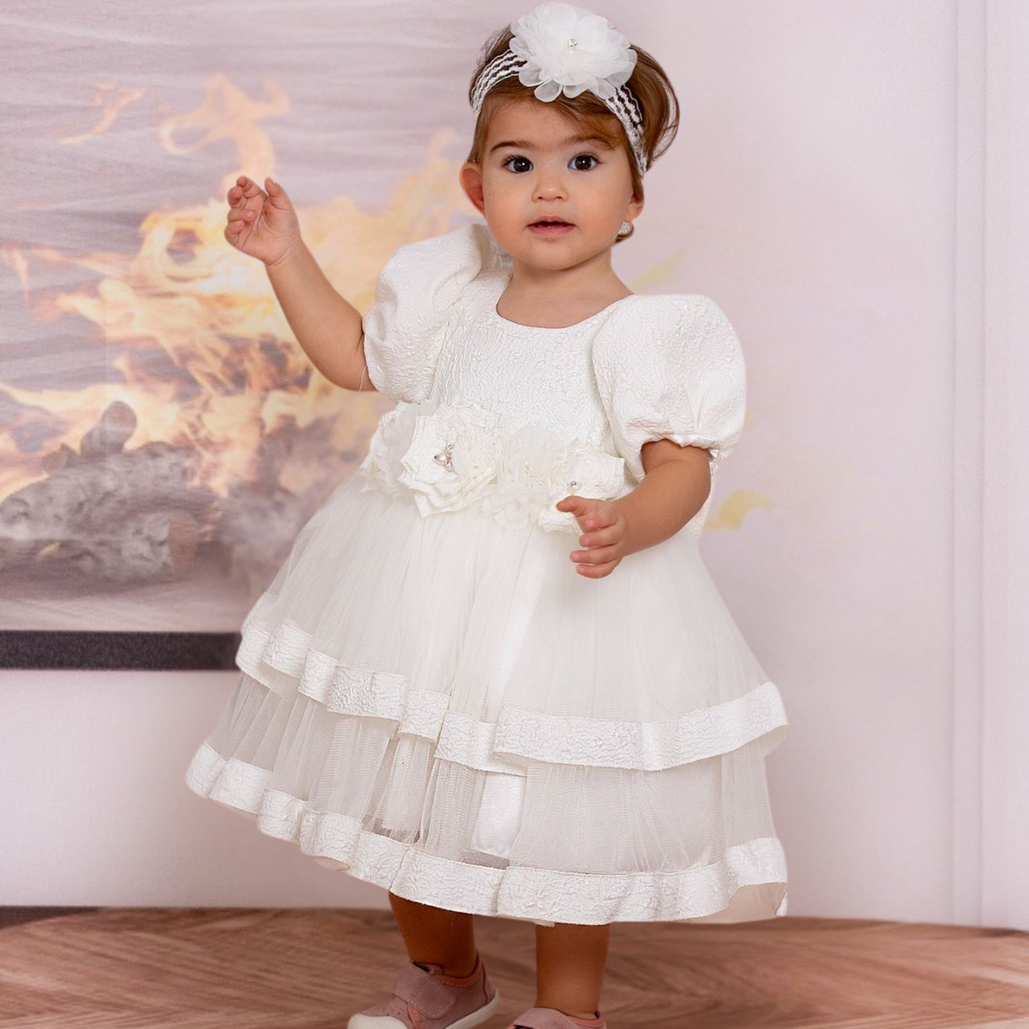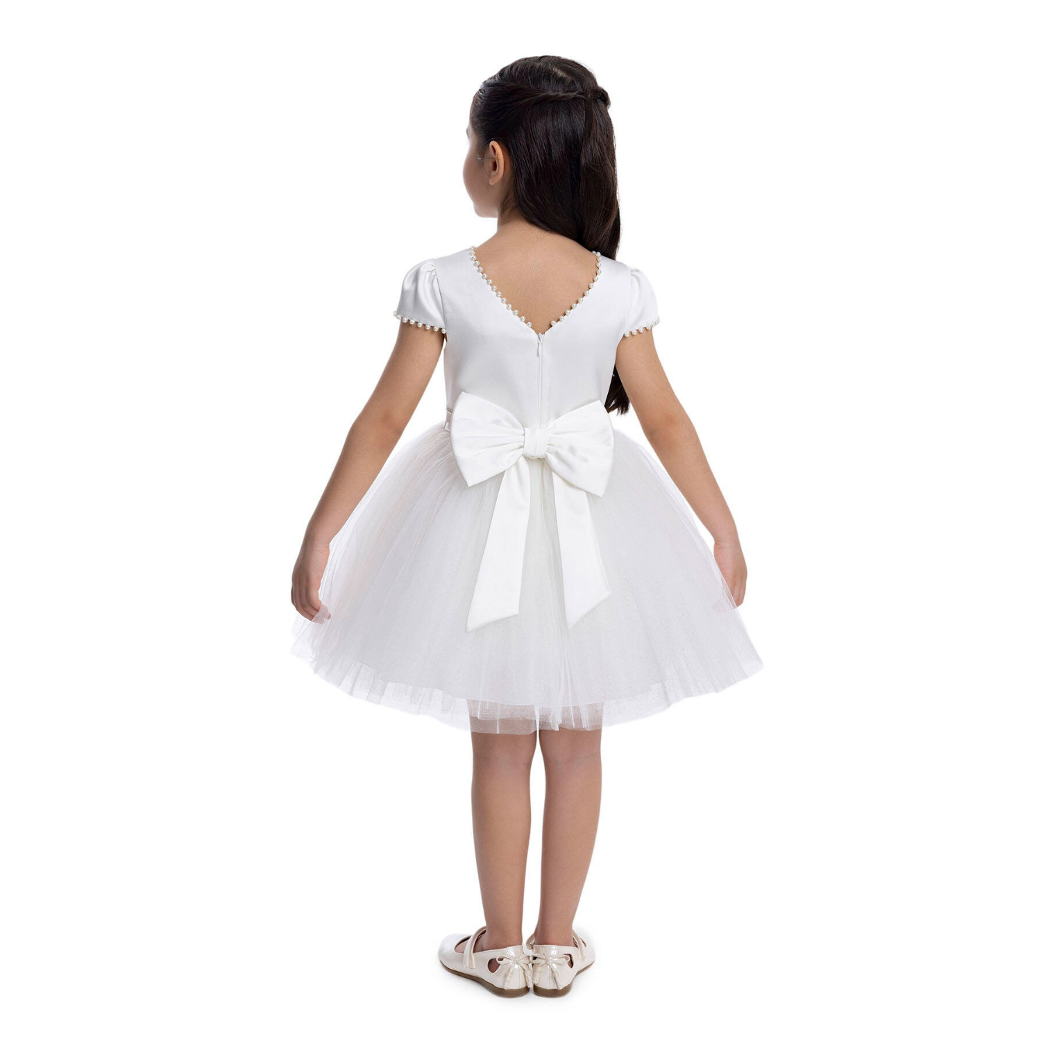This elegant girls' dress is a perfect blend of sophistication and charm. The satin bodice features delicate pearl embellishments on the neckline and sleeve cuffs, adding a touch of refinement. The sparkling tulle skirt creates a magical effect, perfect for any special occasion. A beautifully adorned V-shape line with pearls and gems enhances the dress’s back while an oversized bow completes the look with a graceful touch.