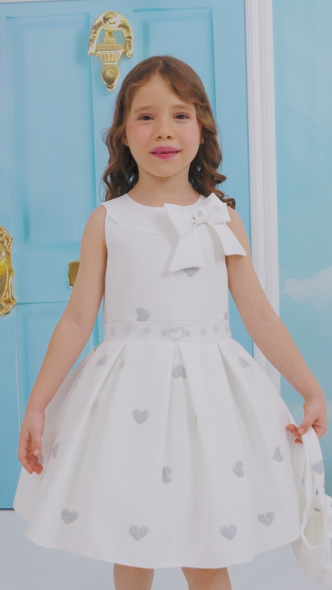 Make your little one shine with this charming sleeveless dress, designed for grace and sophistication. Crafted from luxurious jacquard fabric, this dress features a delicate bow at the neckline and a voluminous pleated skirt, perfect for formal occasions, birthdays, and celebrations.