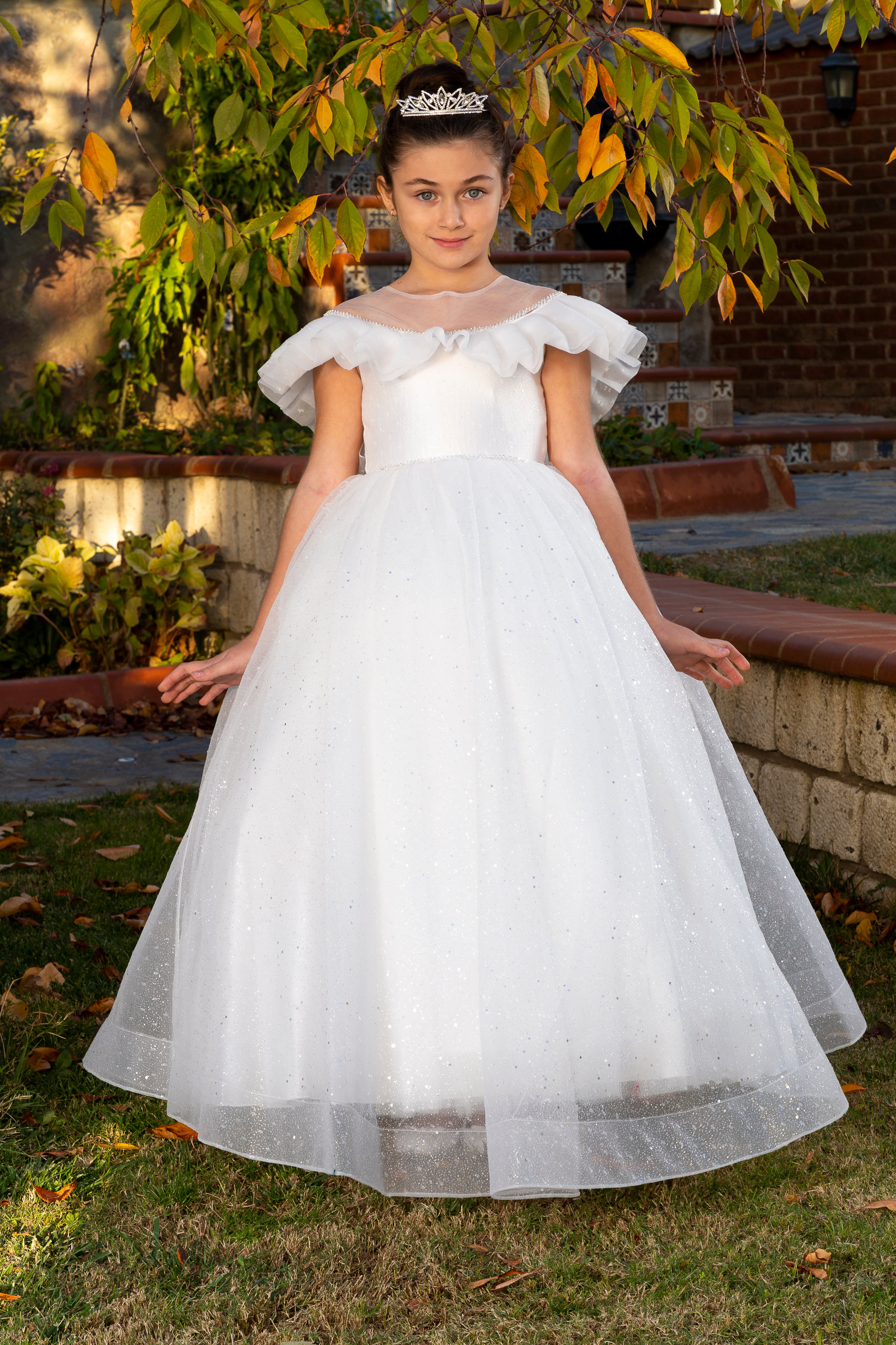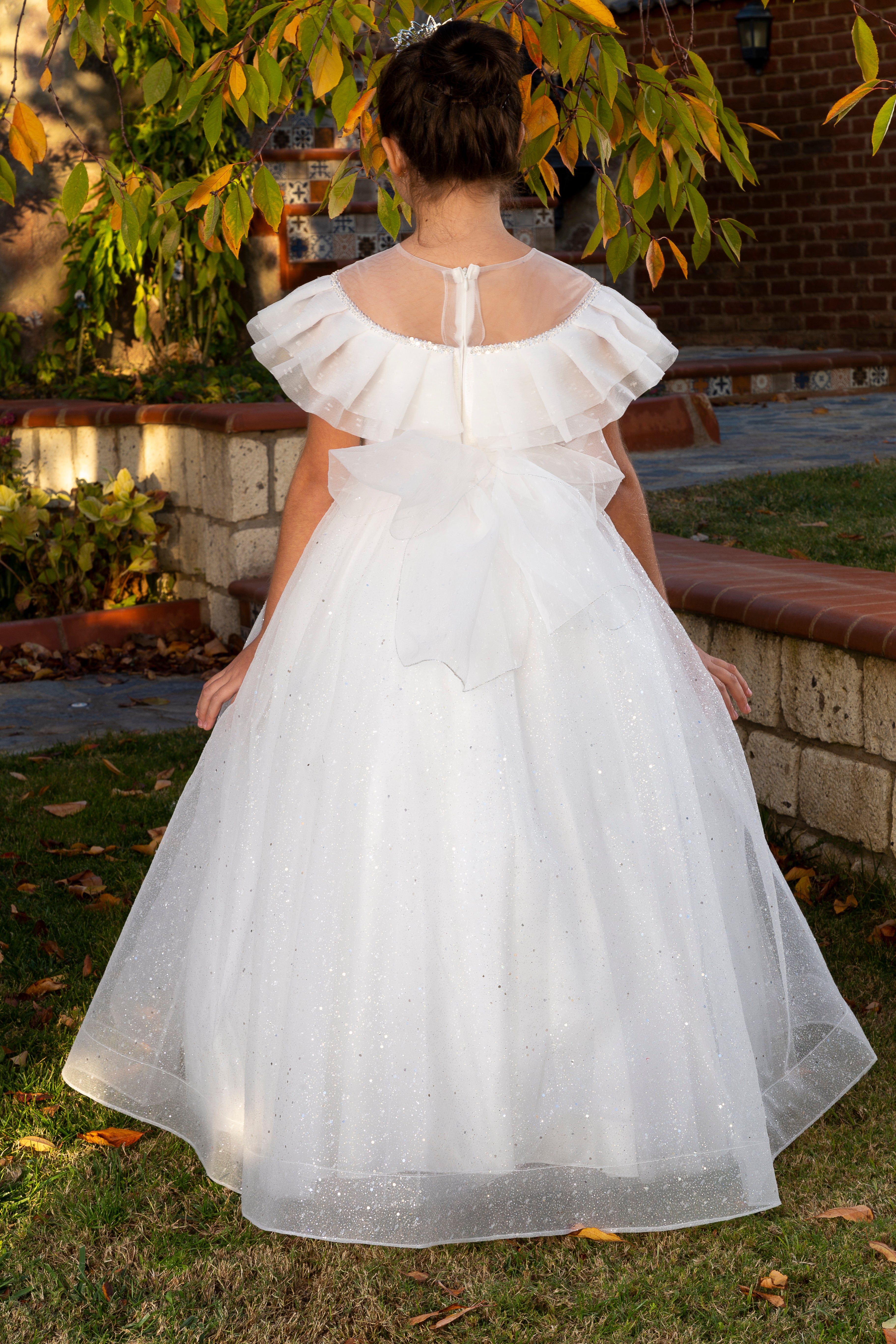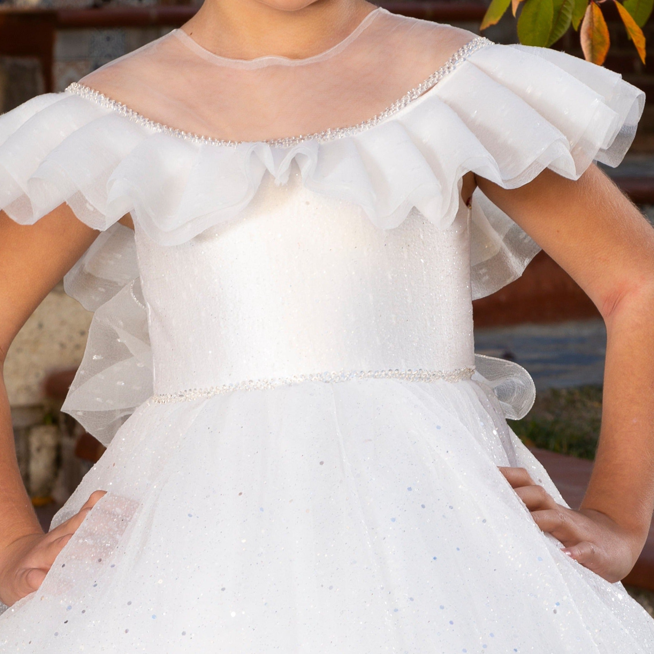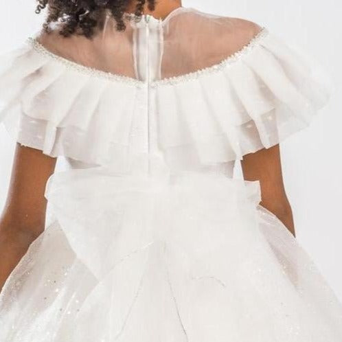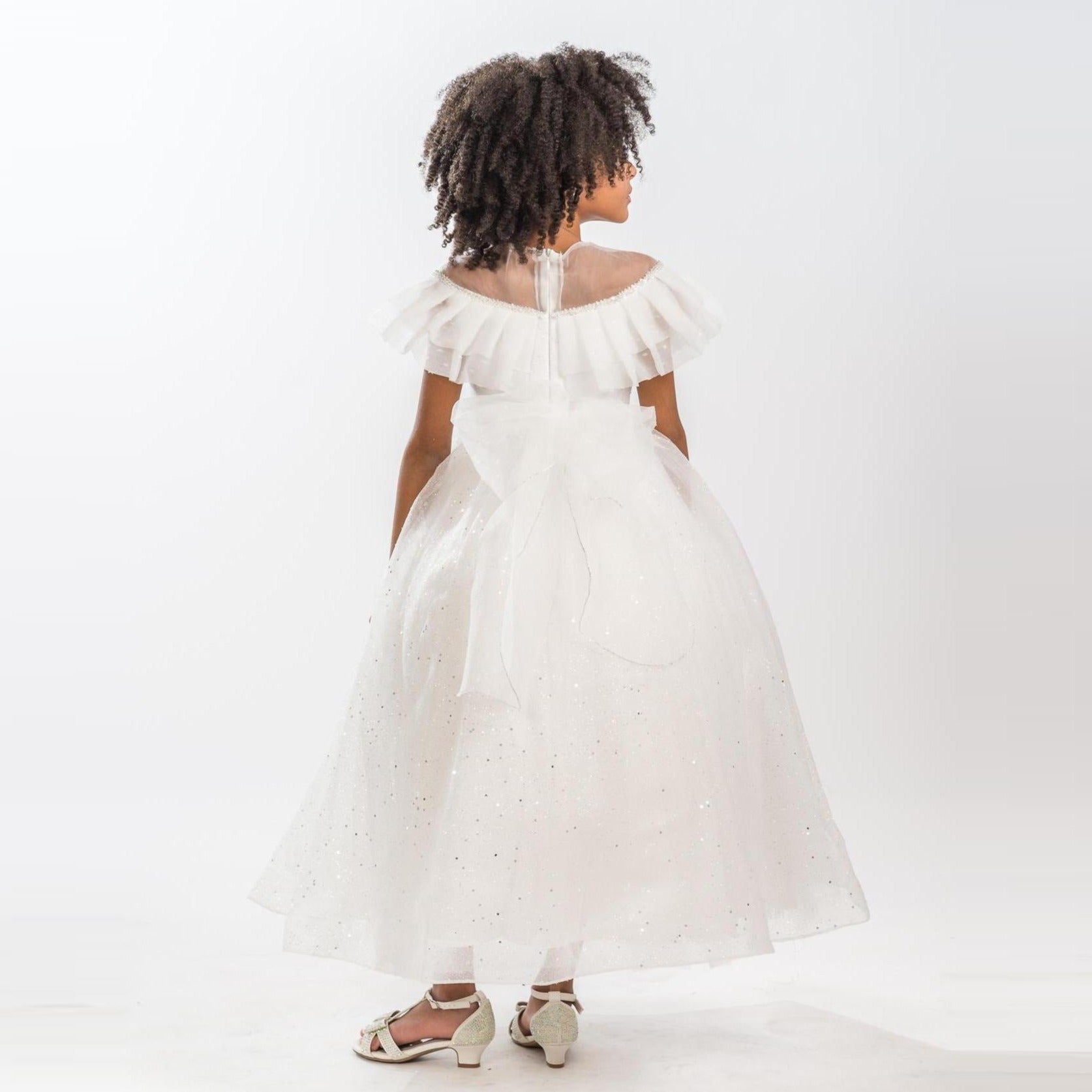 A real wedding gown...for kids! Elegant, very poufy dress with bridal rhinestones and removable big matching bow in the back. An exclusive JuniorKids creation!