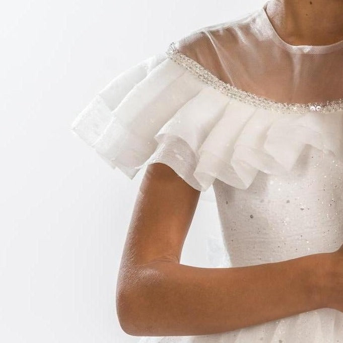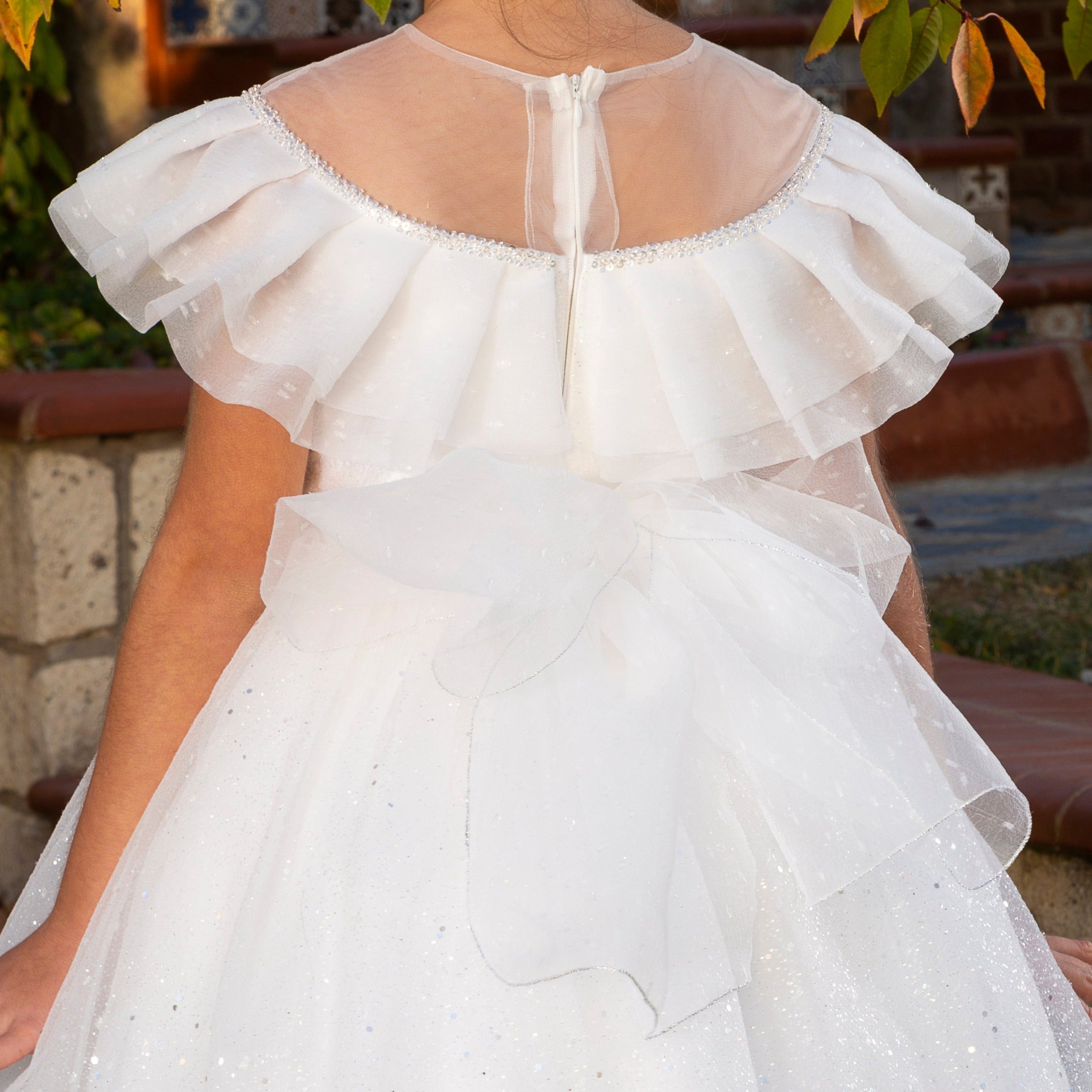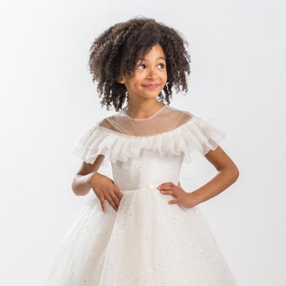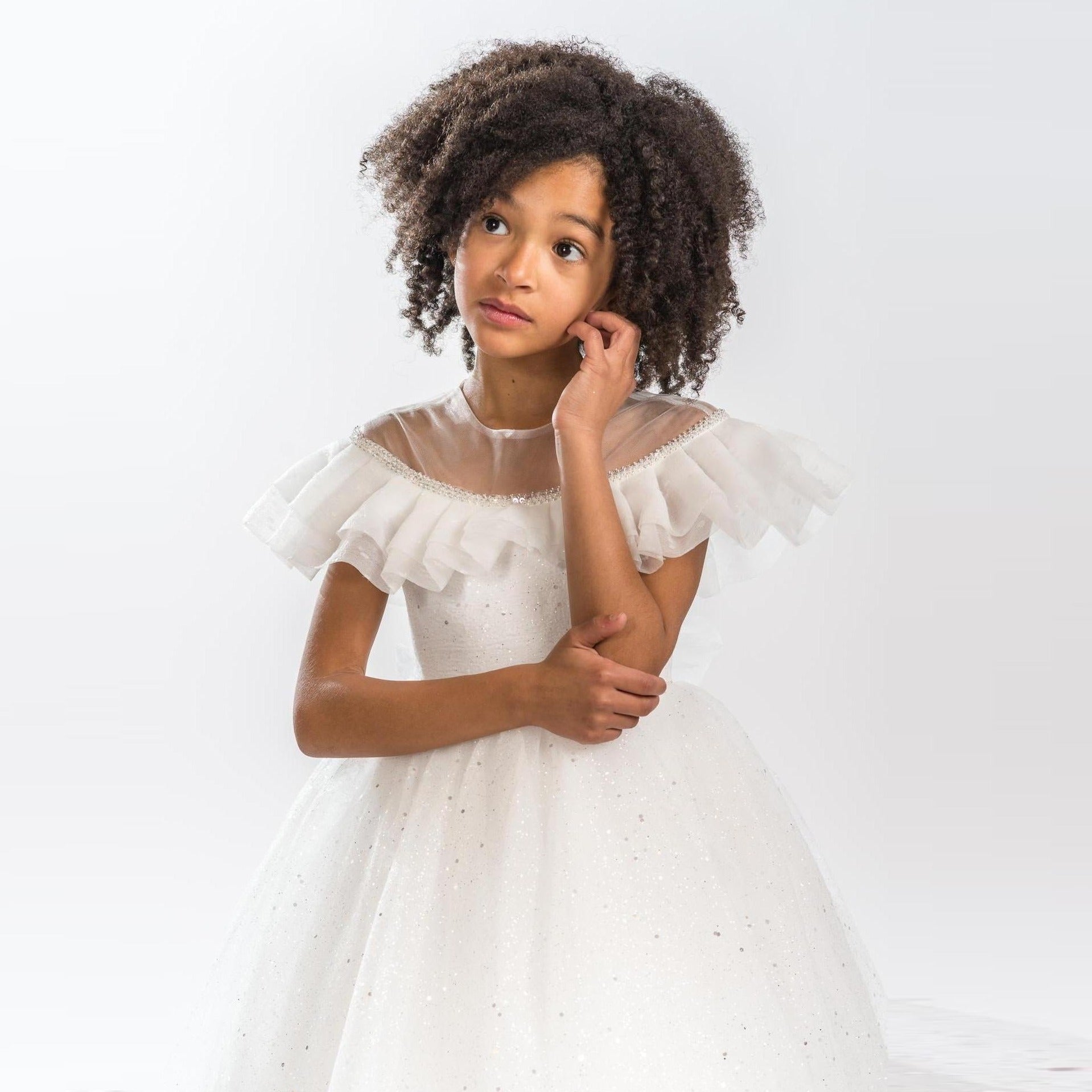 Une vraie robe de mariée... pour nos princesses! Elégante robe très bouffante avec diamant tel que sur les robes de mariée et gros noeud amovible dans le dos. Un style unique en son genre, une création JuniorKids!