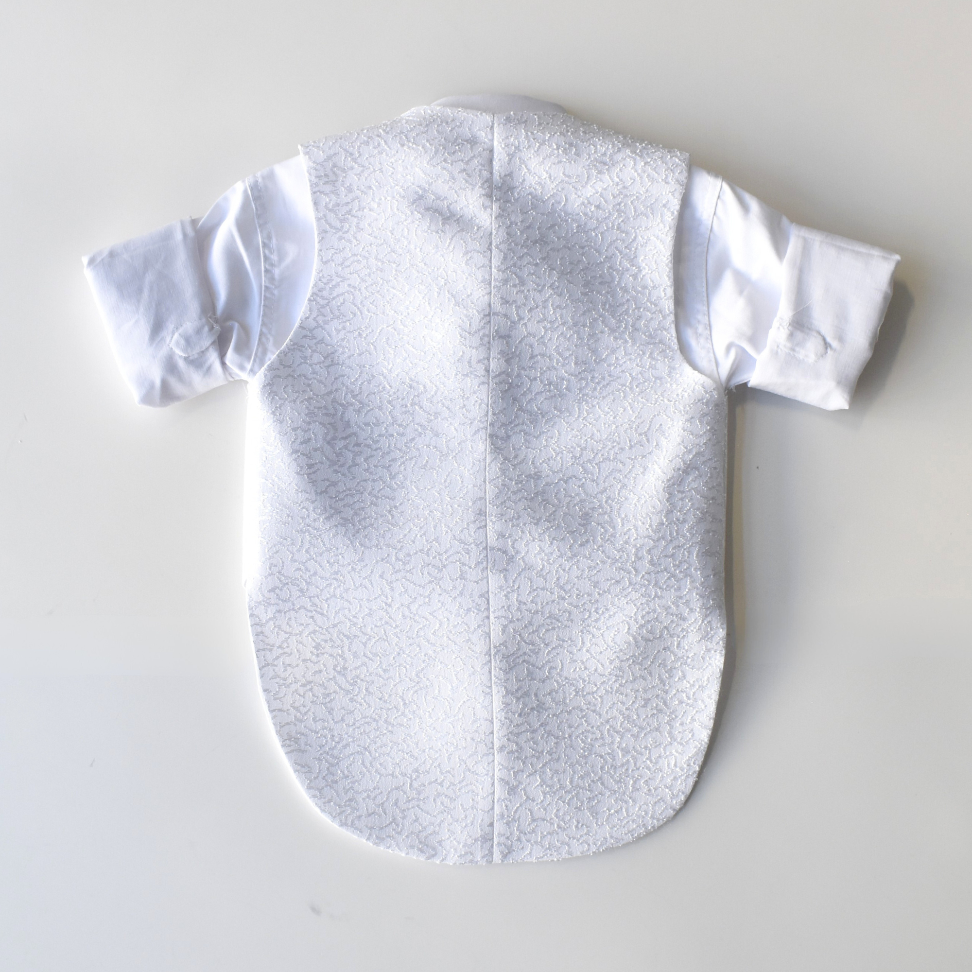 Embrace elegance and comfort on your special day with this stylish baptism set. Featuring a trendy, UK-inspired design, this set includes a white cotton shirt, a penguin tail sleeveless vest adorned with a tone on tone jacquard pattern, a matching bowtie, and slim pants. Make a statement with this must-have ensemble.