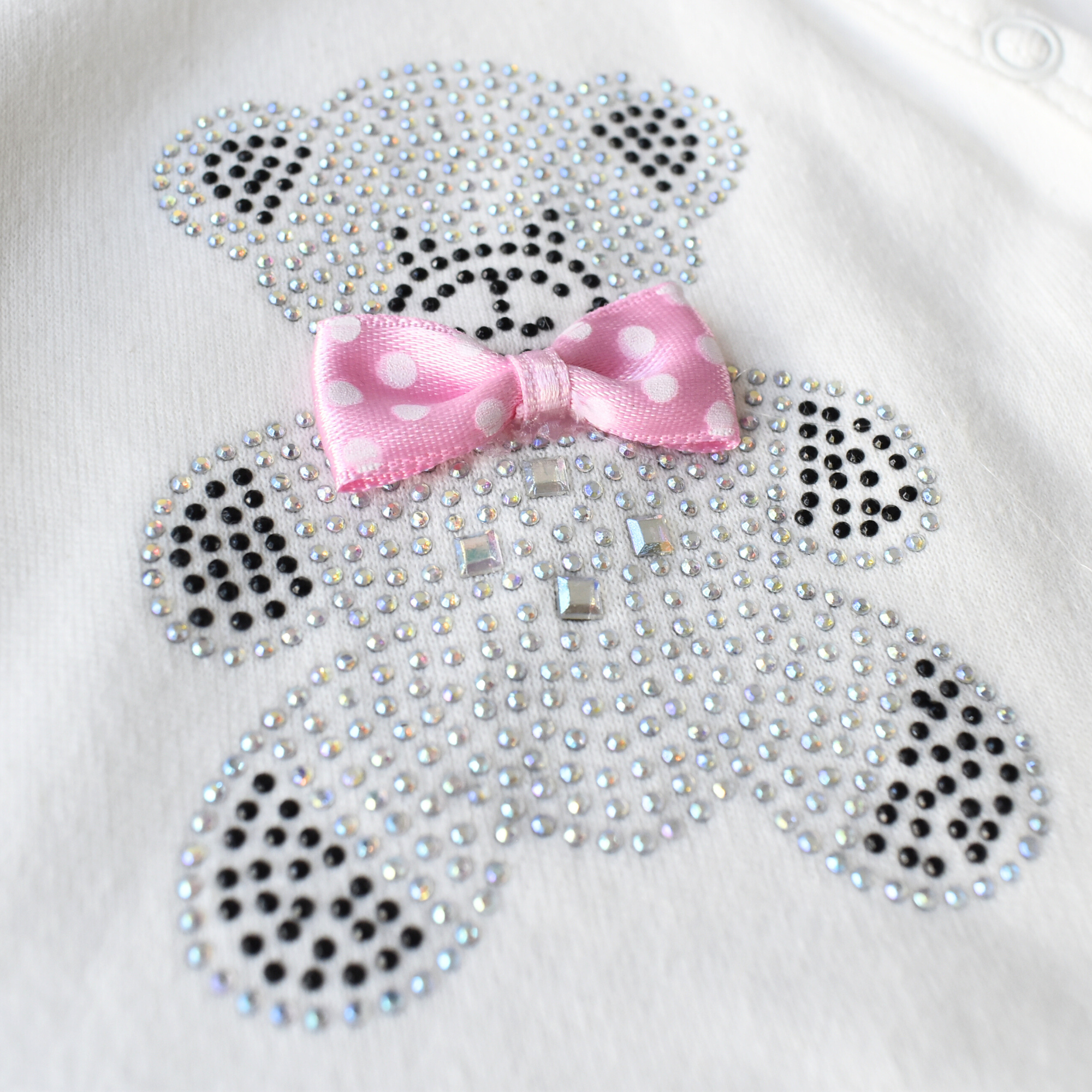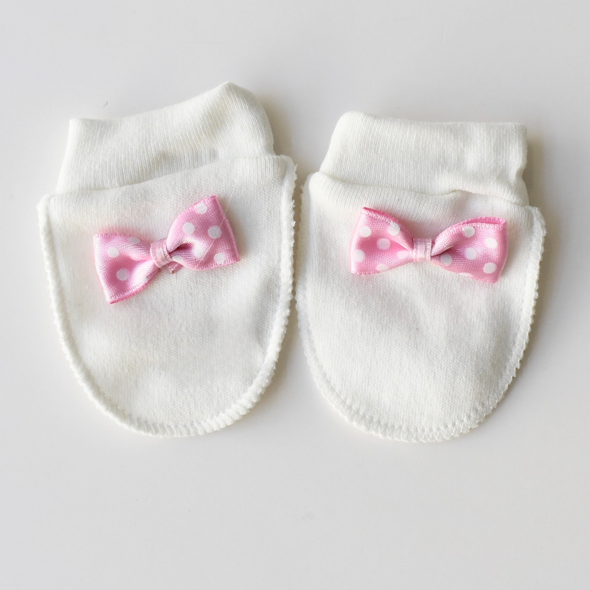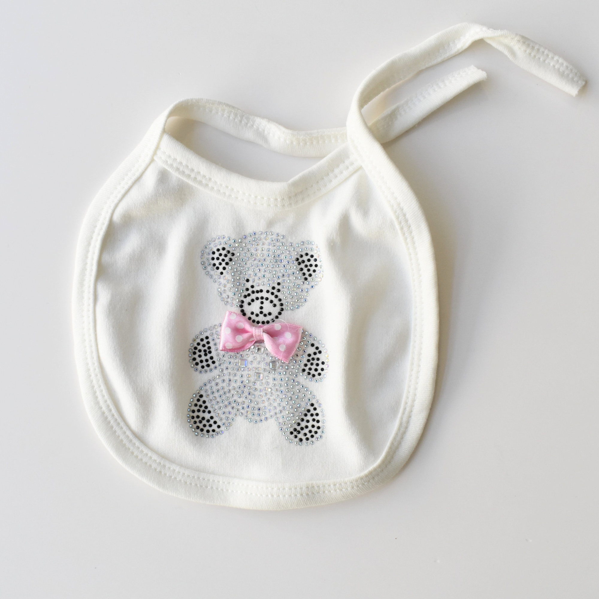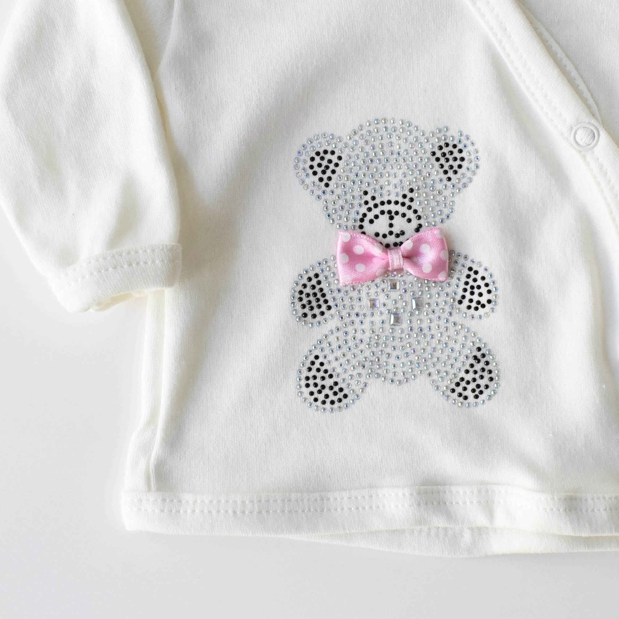 Style from day one with these beautiful teddy bear-themed 5-piece pajamas, including an asymmetrical opening sweater (100% Cotton), pants with closed bottoms (100% Cotton), anti-itching mittens, and a bib hat for your little one new.
