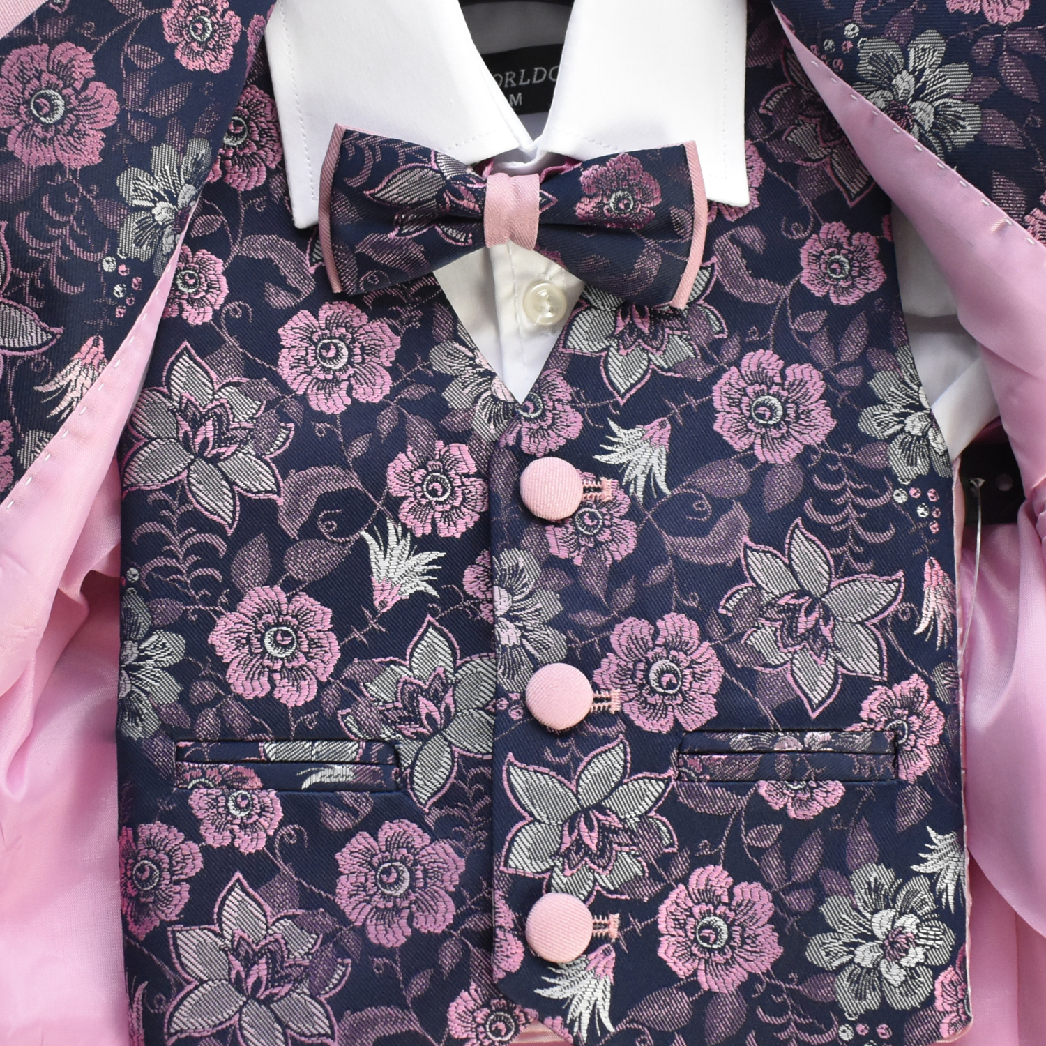 Stunning slim fit suit including blazer with floral print lapel, elastic waist pants, slick floral sleeveless vest, skinny side-collar white shirt, and matching bowtie.
