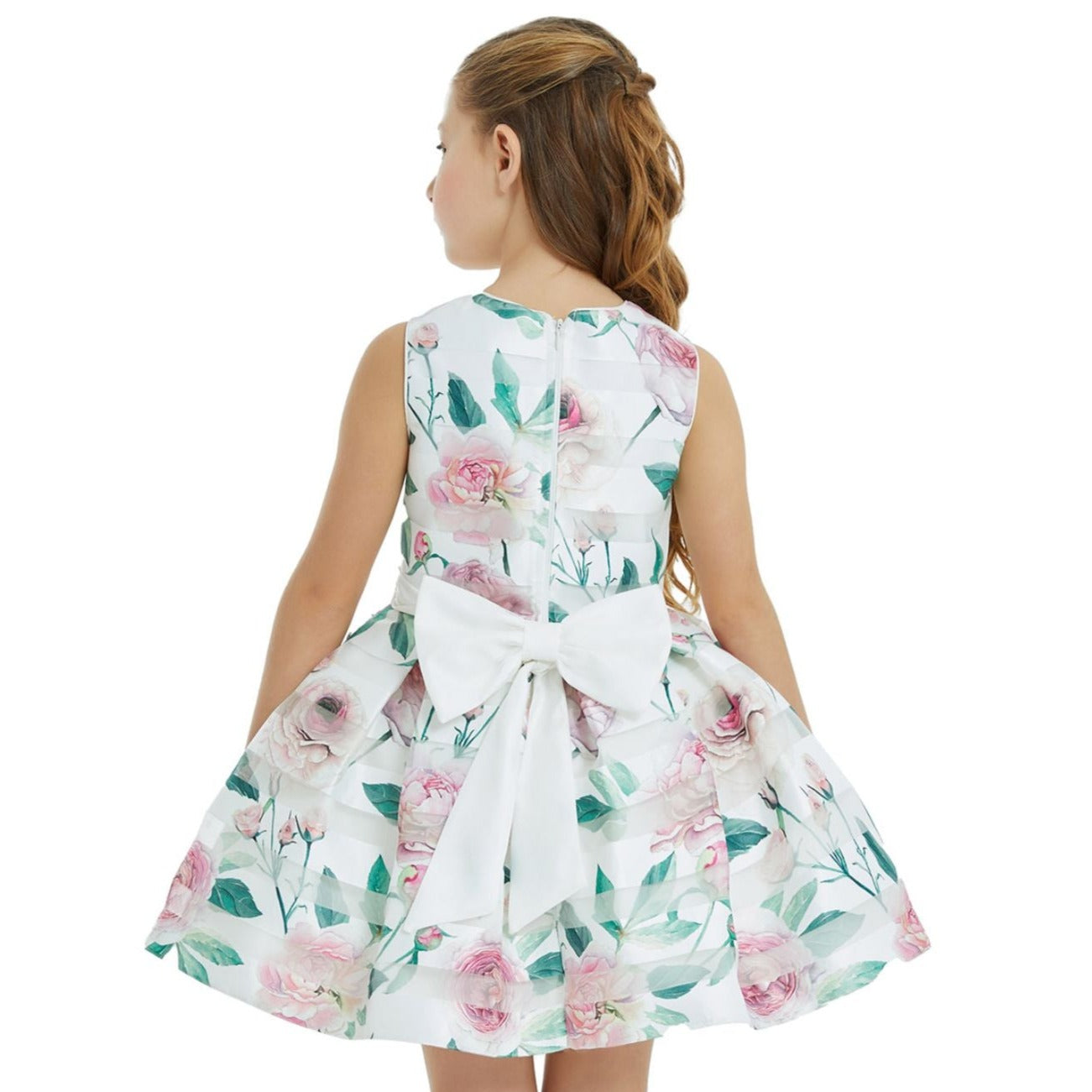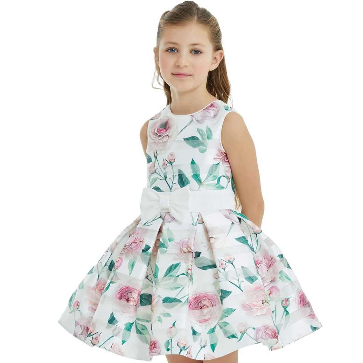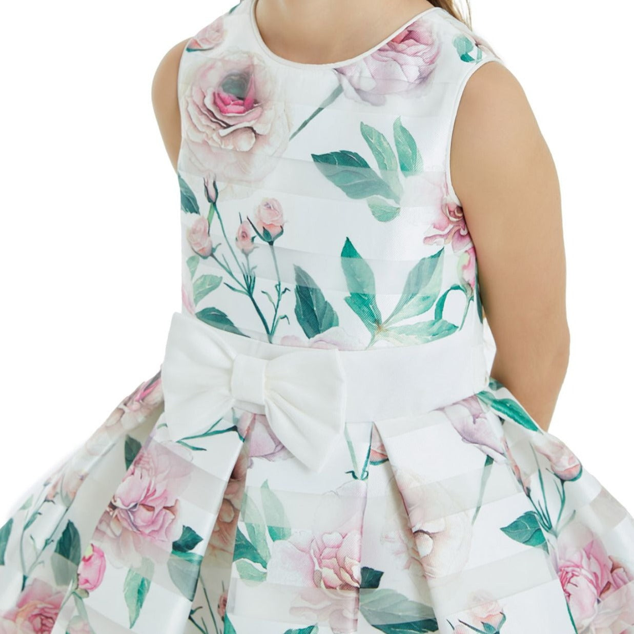 Robe sans manches en satin rayé avec un bel imprimé floral sur la grandeur de la robe, un nœud à la taille et un gros nœud amovible dans le dos. Livré avec un boléro à manches longues pour les journées plus fraîches. Les filles se sentiront très à l'aise avec sa doublure en tissu de coton. Un design exclusif de JuniorKids Luxury.