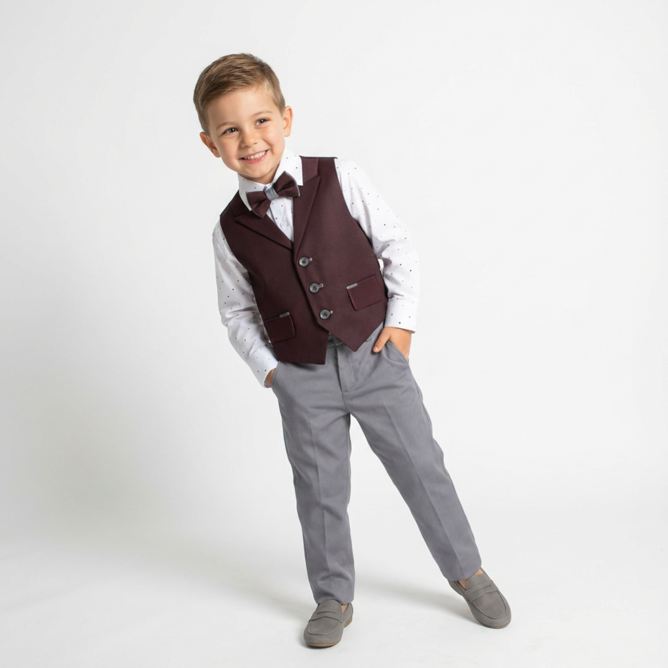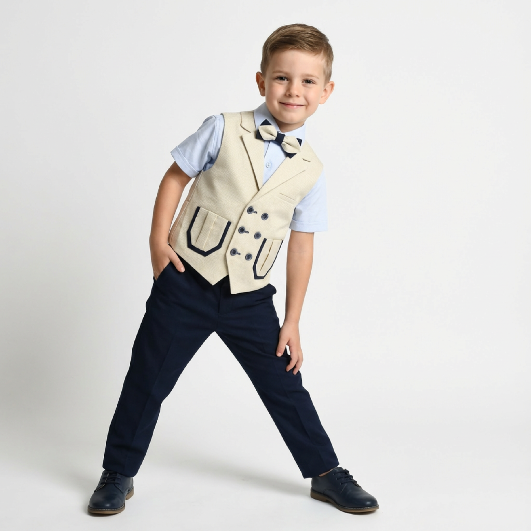 Habit de garçon élégant en coton tricoté comprenant un blazer en coton confortable, une chemise en coton, un pantalon en coton tricoté à taille ajustable et un nœud papillon. Un design exclusif JuniorKids!