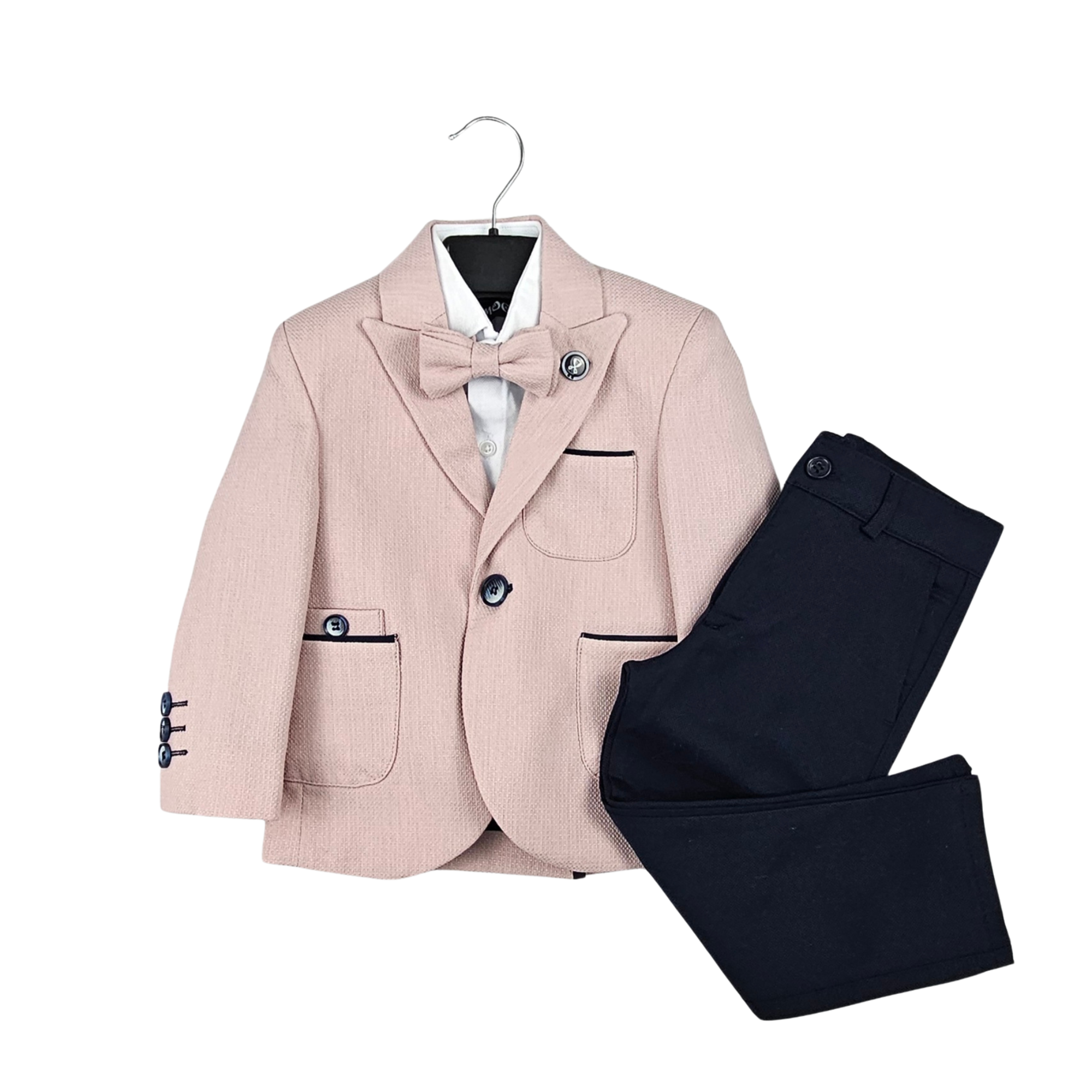 Bow Tie and Navy Pin: Finishing touches make all the difference. The matching bow tie and navy pin add charm and character, elevating the suit’s overall look.