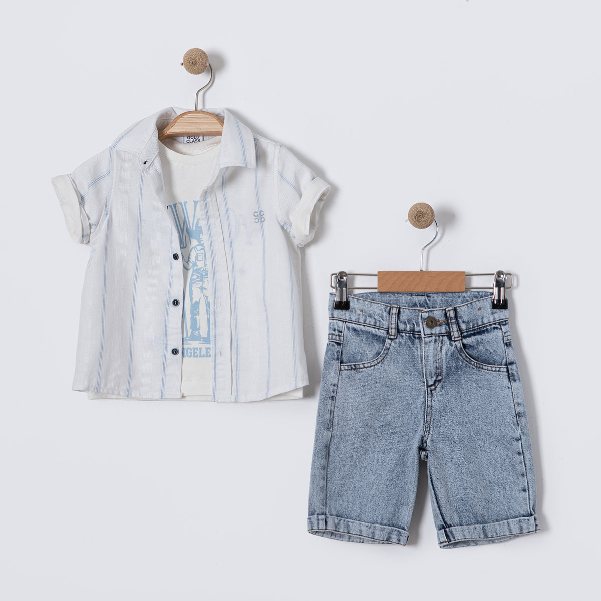 Keep him cool and stylish with this 3-piece summer outfit set, designed for sunny days and playful moments. This set features a sleeveless striped shirt in a lightweight linen blend, a fun graphic print t-shirt, and classic denim shorts for a perfectly balanced look.