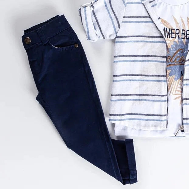 Stylish and casual boy's clothes for his beautiful summer outings including a comfortable knitted cotton shirt with a hood (70% Cotton 30% polyester), a sweater (95% Cotton 5% lycra), cotton pants with adjustable waist (98% Cotton 2% lycra).