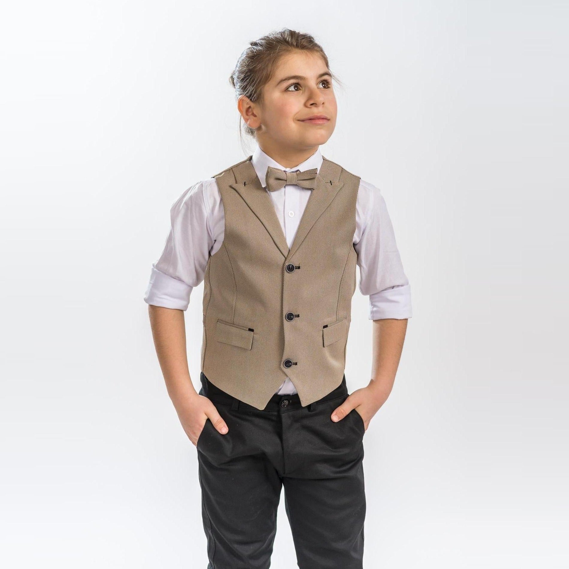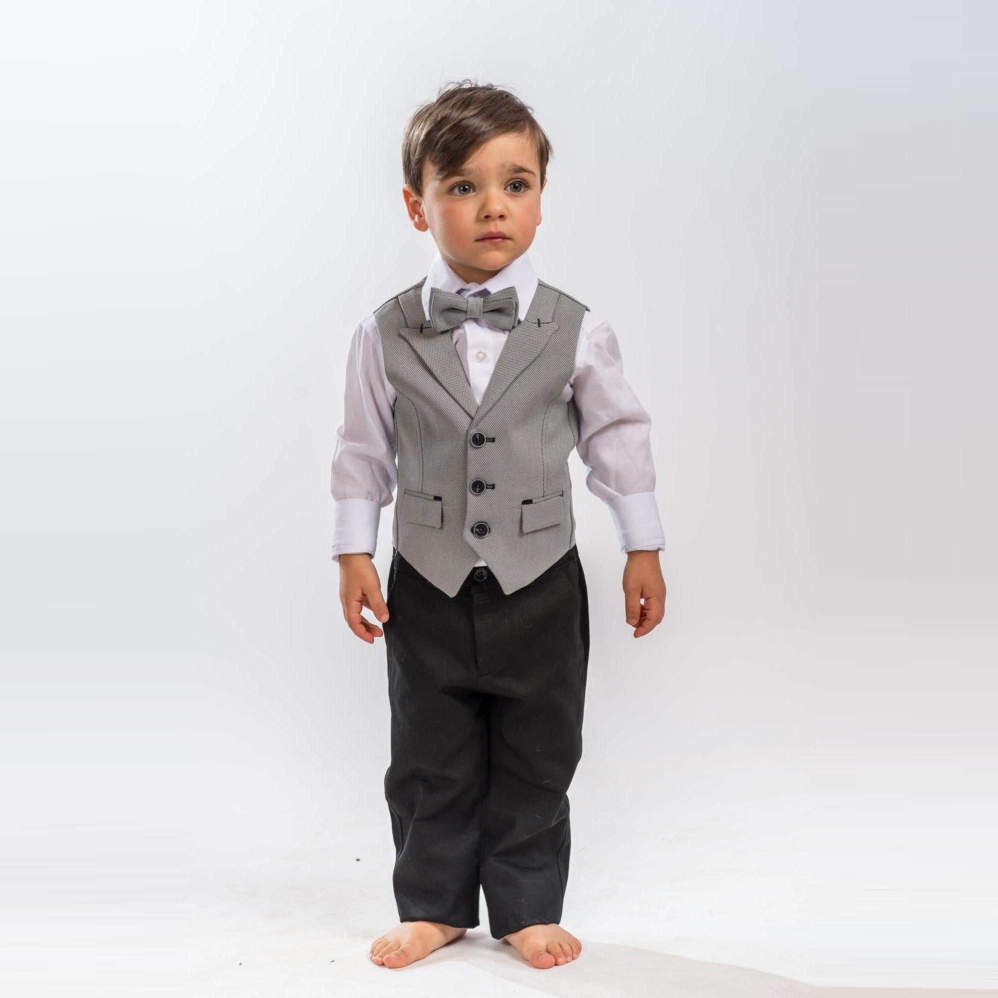 Ensemble de gilet élégant en coton tricoté comprenant un veste sans manches, une chemise en coton, un pantalon slim en coton à taille ajustable et un nœud papillon. Une vraie superstar, signé JuniorKids!