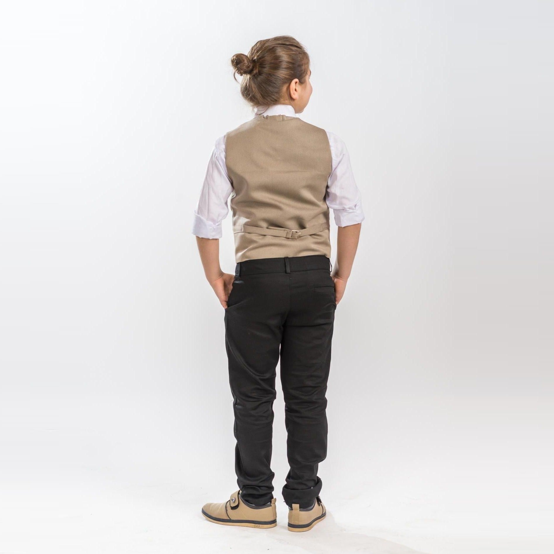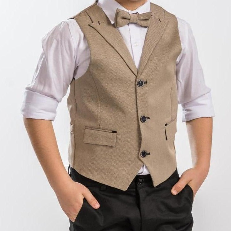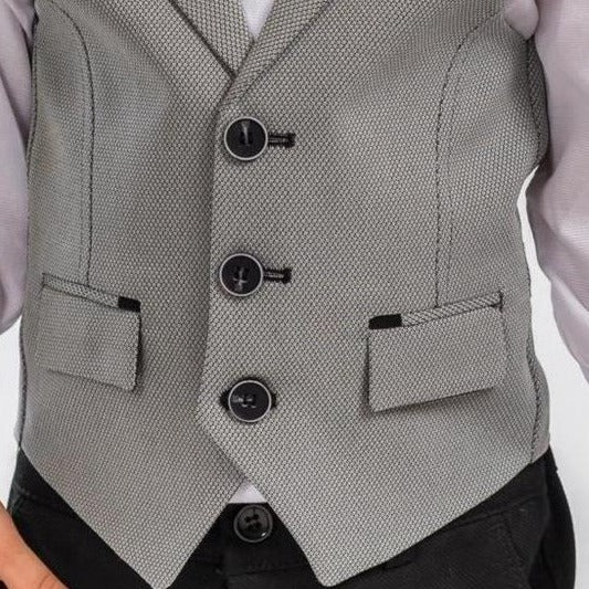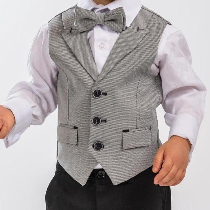 This is taking the vest set style to a new level. Stylish knit cotton vest set including sleeveless vest, soft cotton shirt, and slim fit adjustable waist knit cotton pants, and matching bowtie. A real superstar in the making!