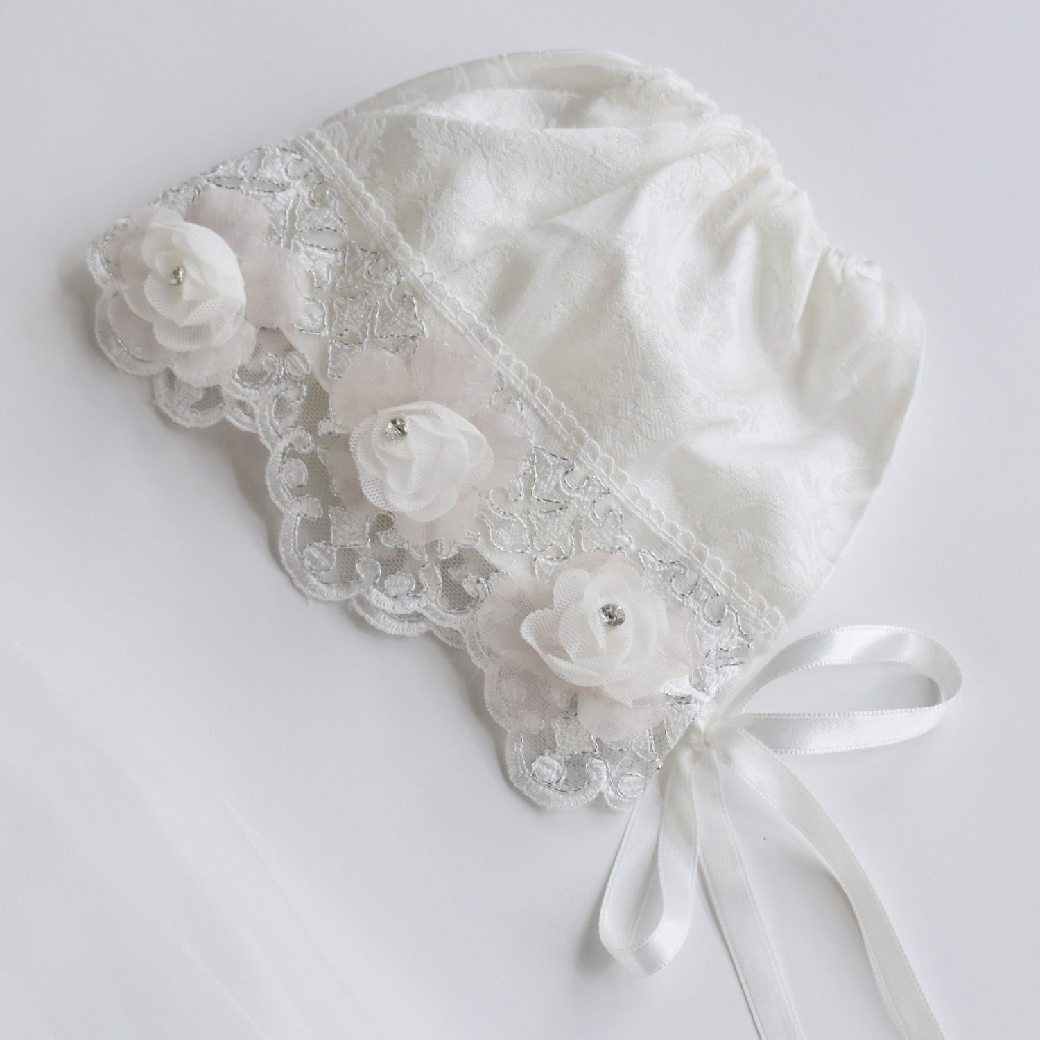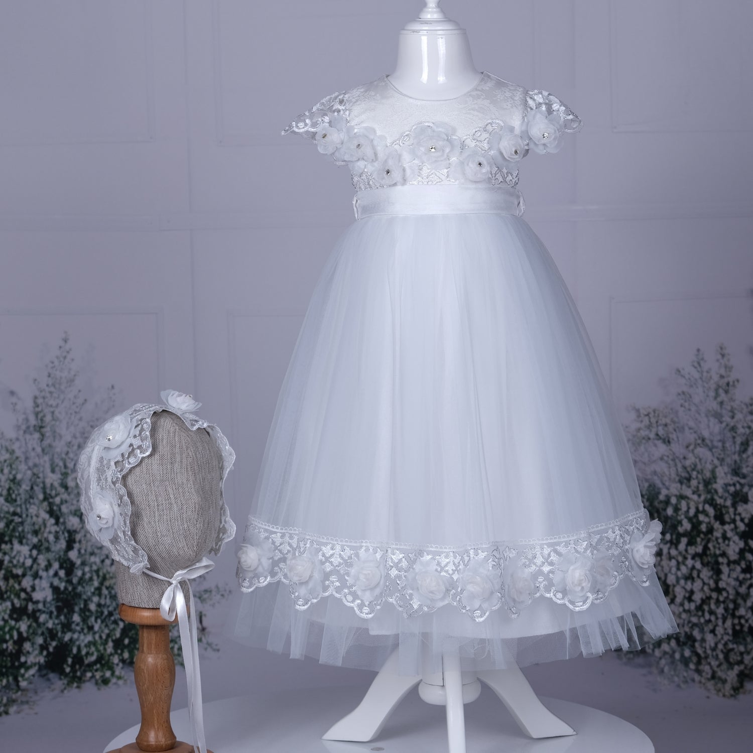 Get ready to capture the essence of elegance with our exquisite lace cap sleeve baptism dress. Featuring delicate diagonal embroidery, a top adorned with refined lace appliques and soft cotton lining, this dress is the perfect choice to shine for her baptism. Comes with matching hat to complete the look!