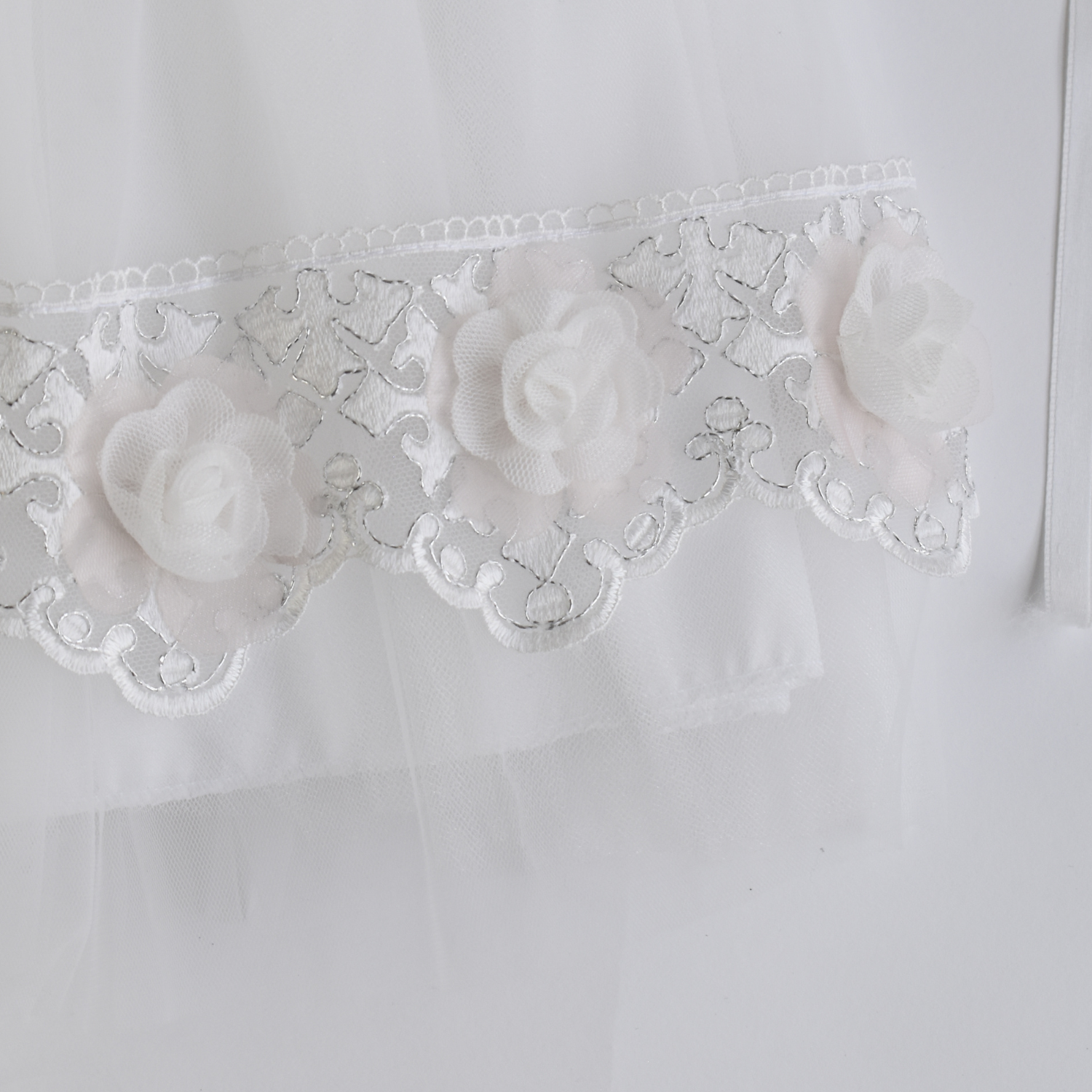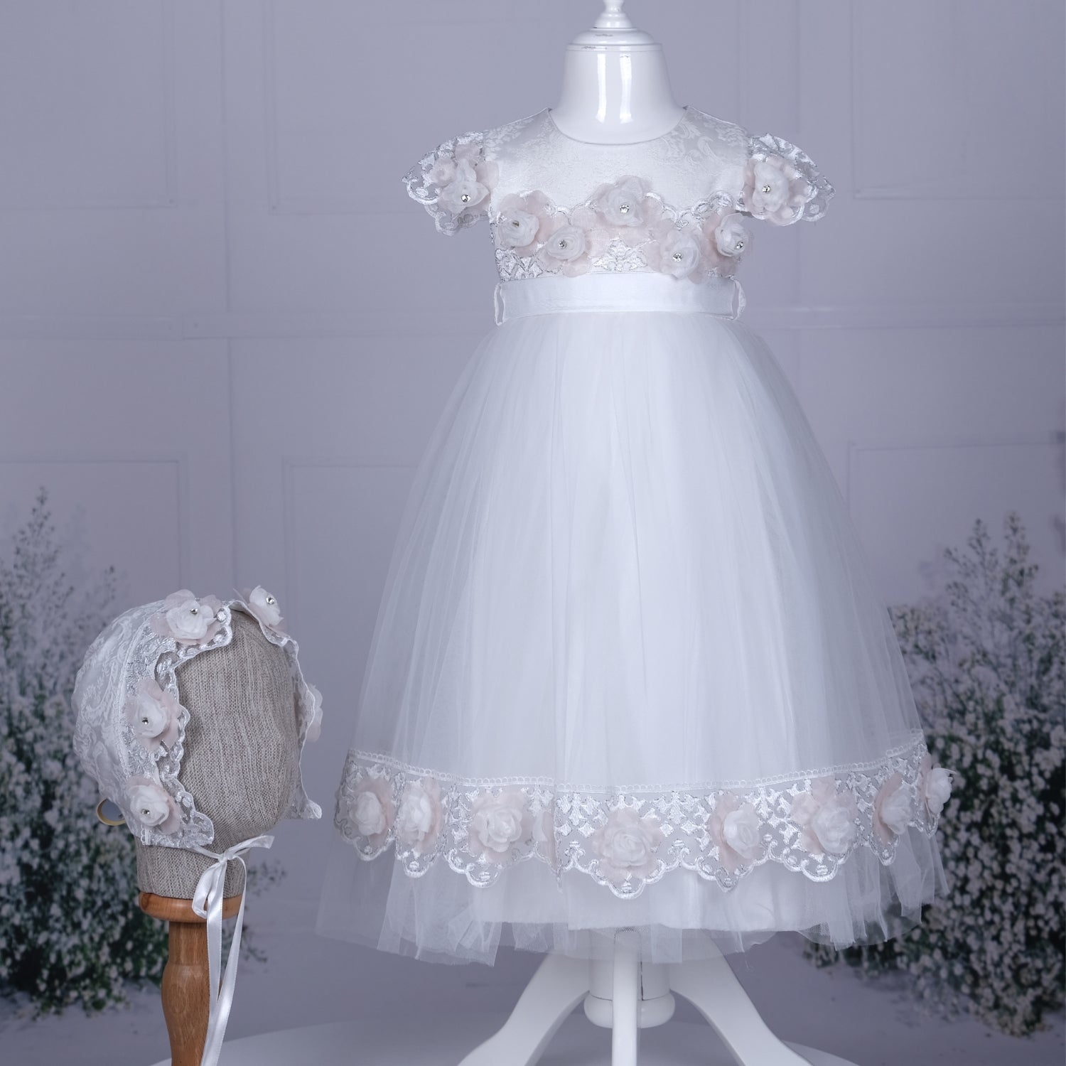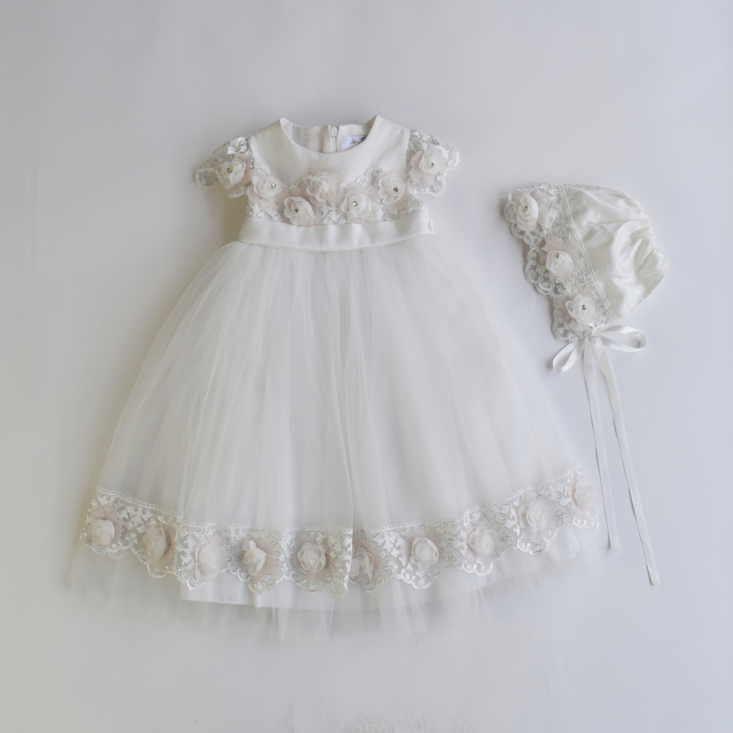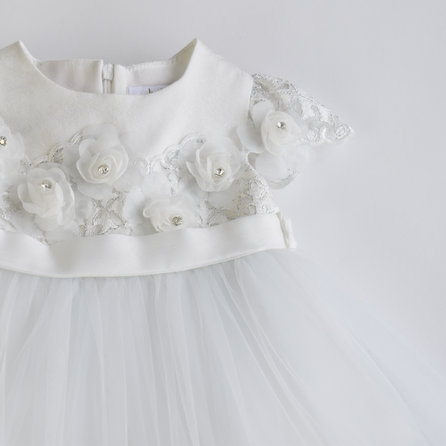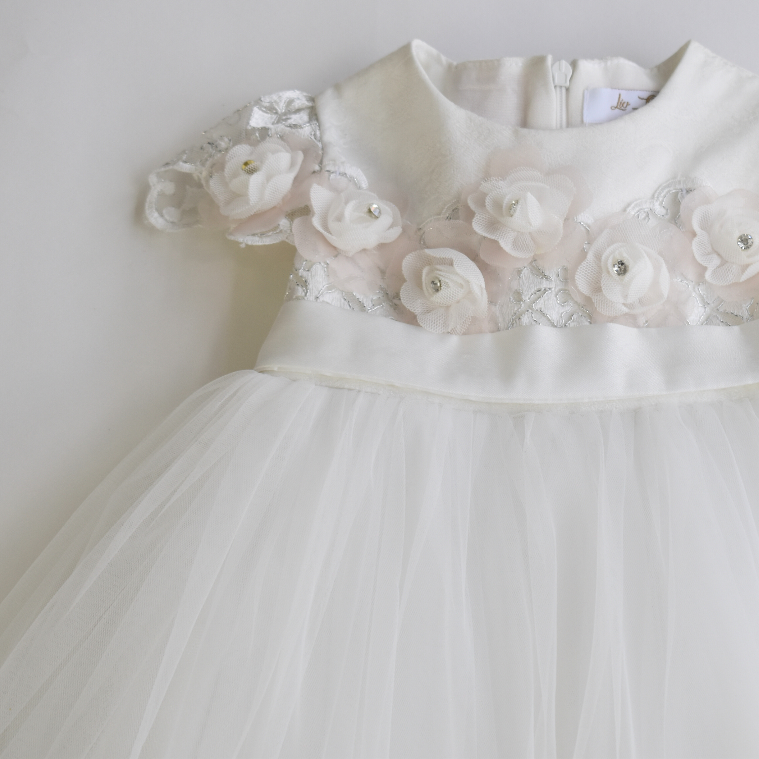 Please note, this dress comes in offwhite with a very small and subtle light pink or light blue applique to make it stand out.